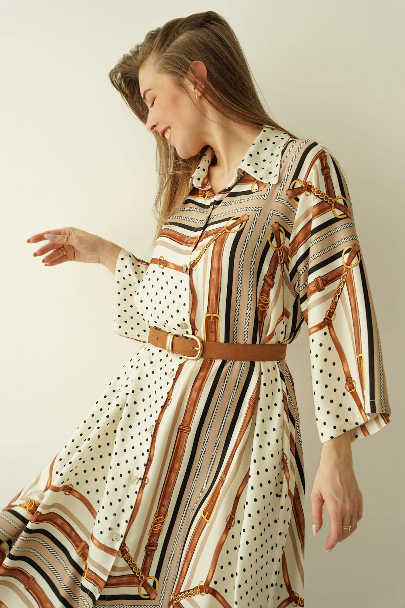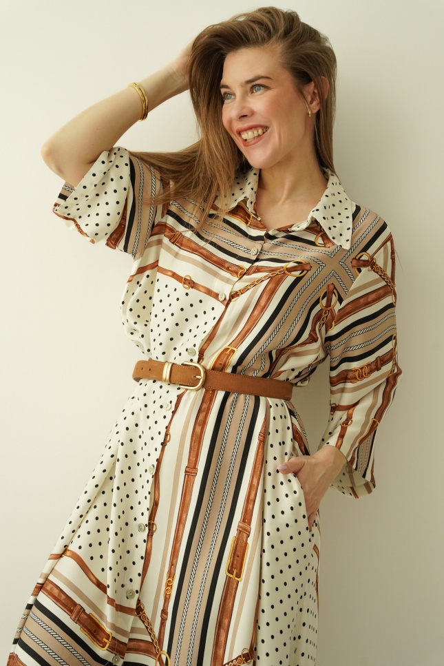 The Flore dress is a feminine, loose-fitting shirt dress featuring subtle patterns, made from 70% viscose and 30% silk. Airy, light and comfortable against the skin, it’s perfect for both elegant work outfits and everyday casual looks. Its timeless design offers plenty of styling options — worn classically as a dress, with a belt to accentuate the waist, or as a light cover-up for layered looks. It is a versatile piece that combines comfort, femininity and modern elegance.