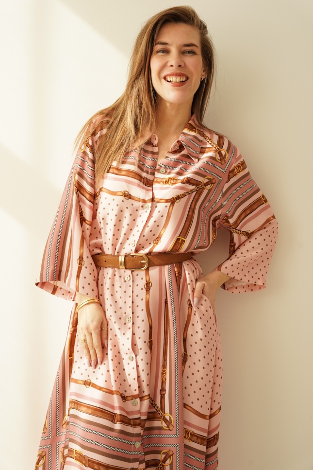 The Flore dress is a feminine, loose-fitting shirt dress featuring subtle patterns, made from 70% viscose and 30% silk. Airy, light and comfortable against the skin, it’s perfect for both elegant work outfits and everyday casual looks. Its timeless design offers plenty of styling options — worn classically as a dress, with a belt to accentuate the waist, or as a light cover-up for layered looks. It is a versatile piece that combines comfort, femininity and modern elegance.