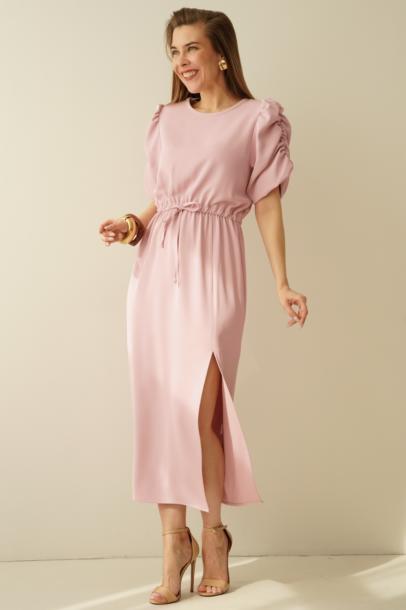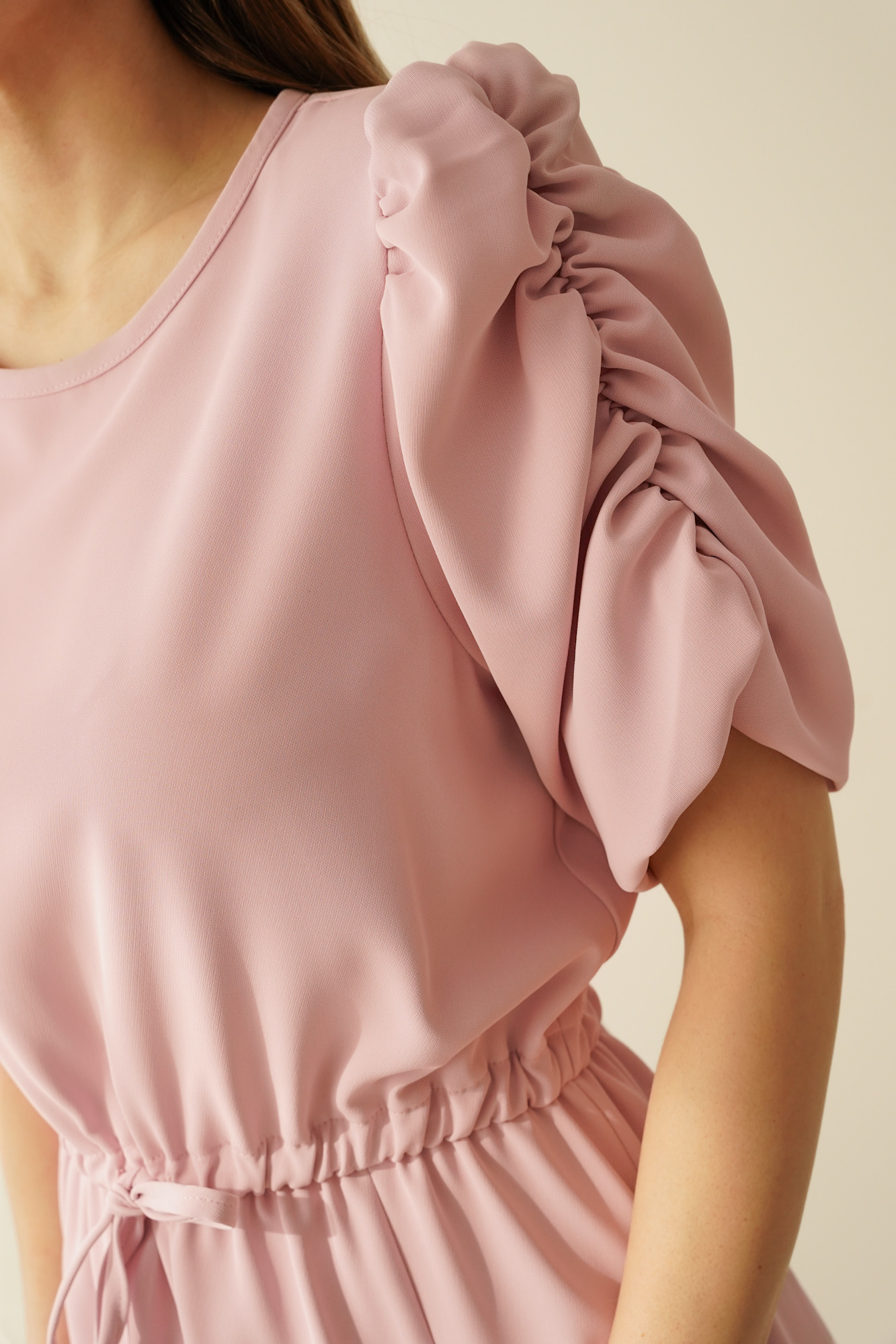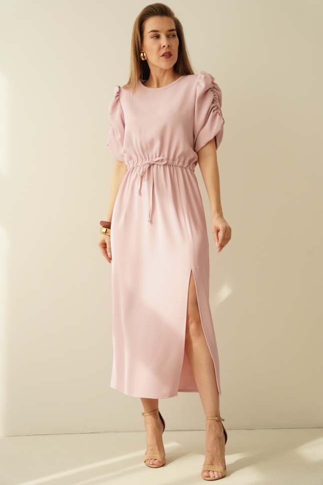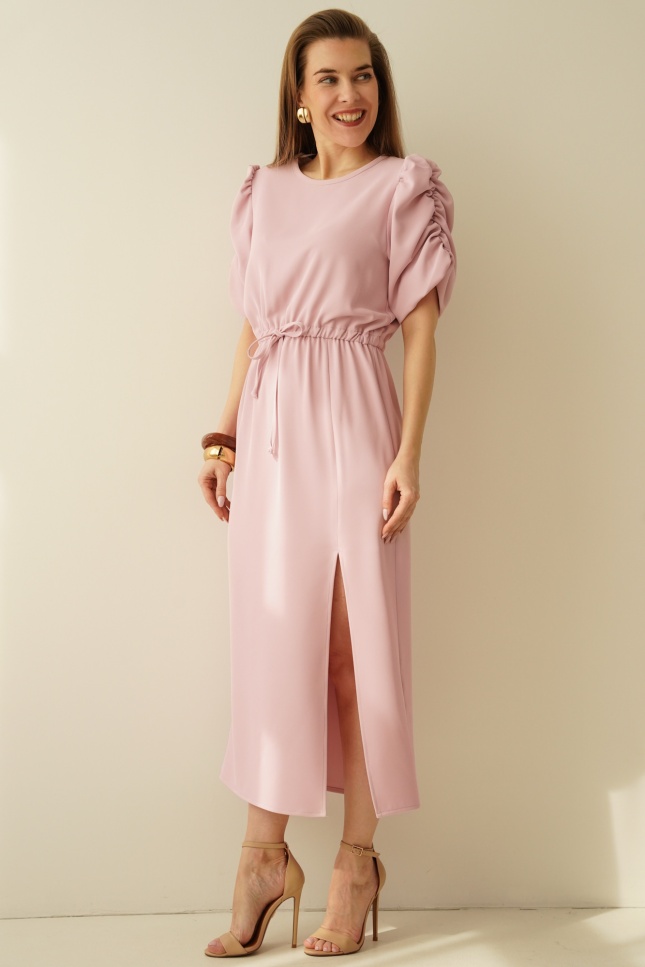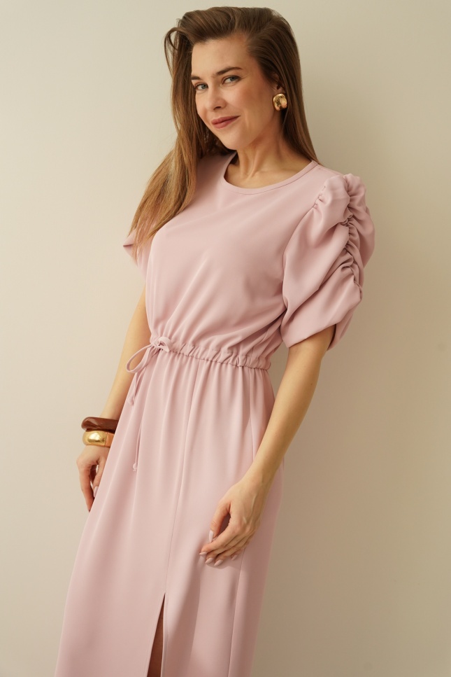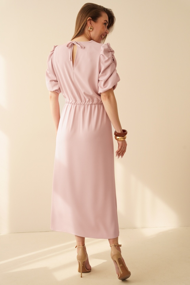 An elegant, feminine dress with puff sleeves by Celine in powder pink