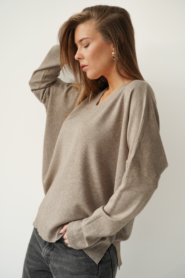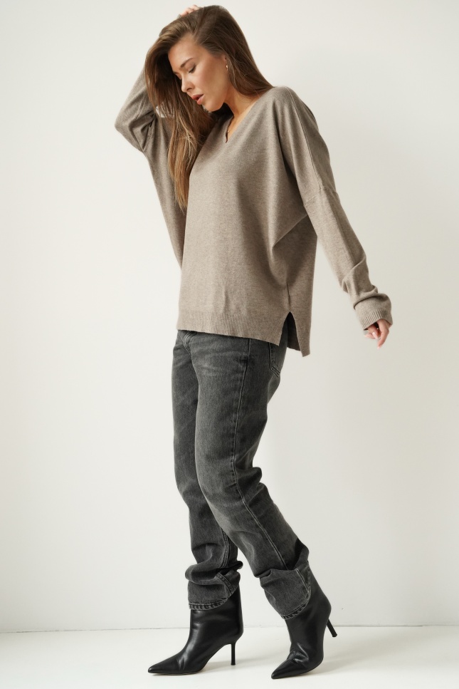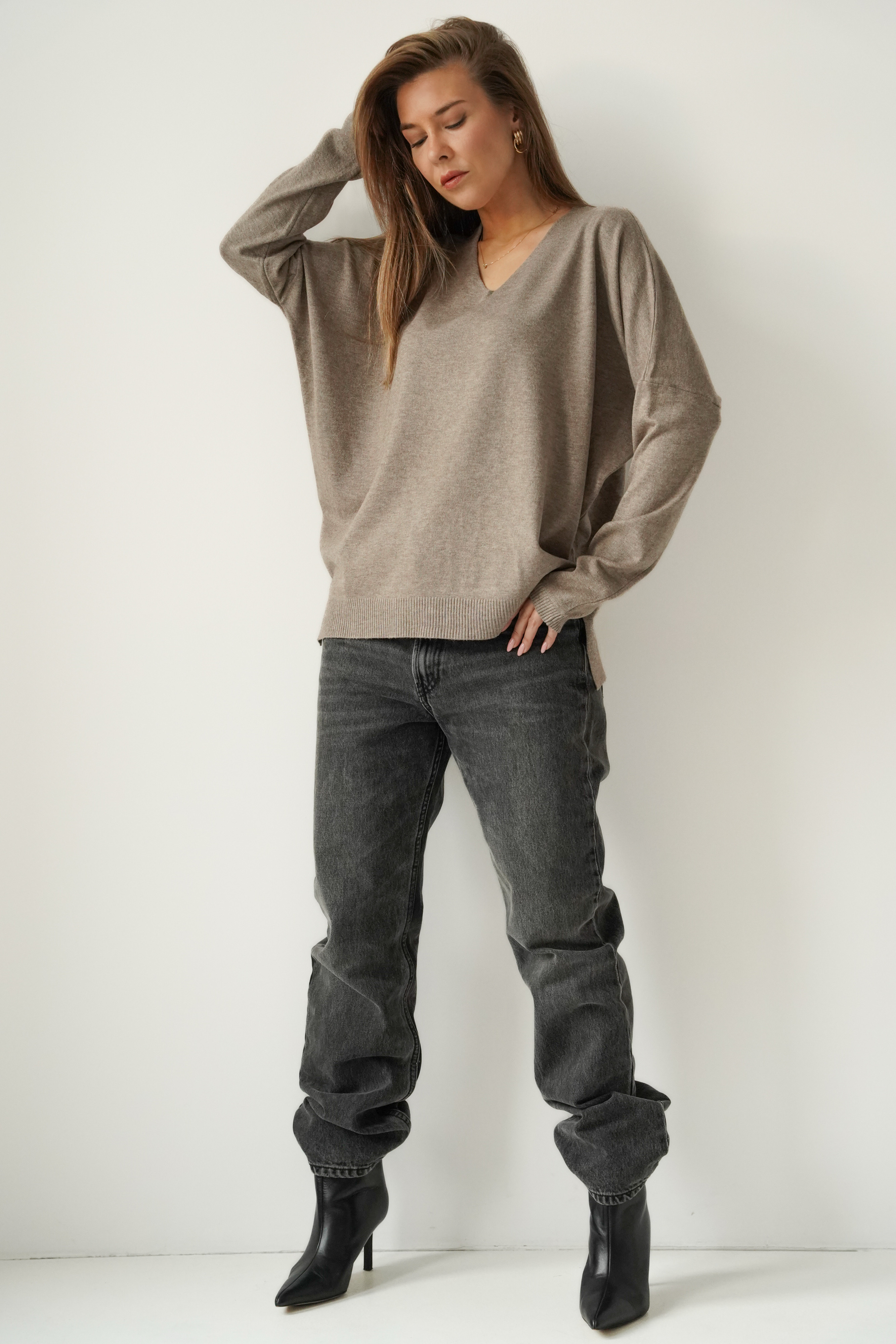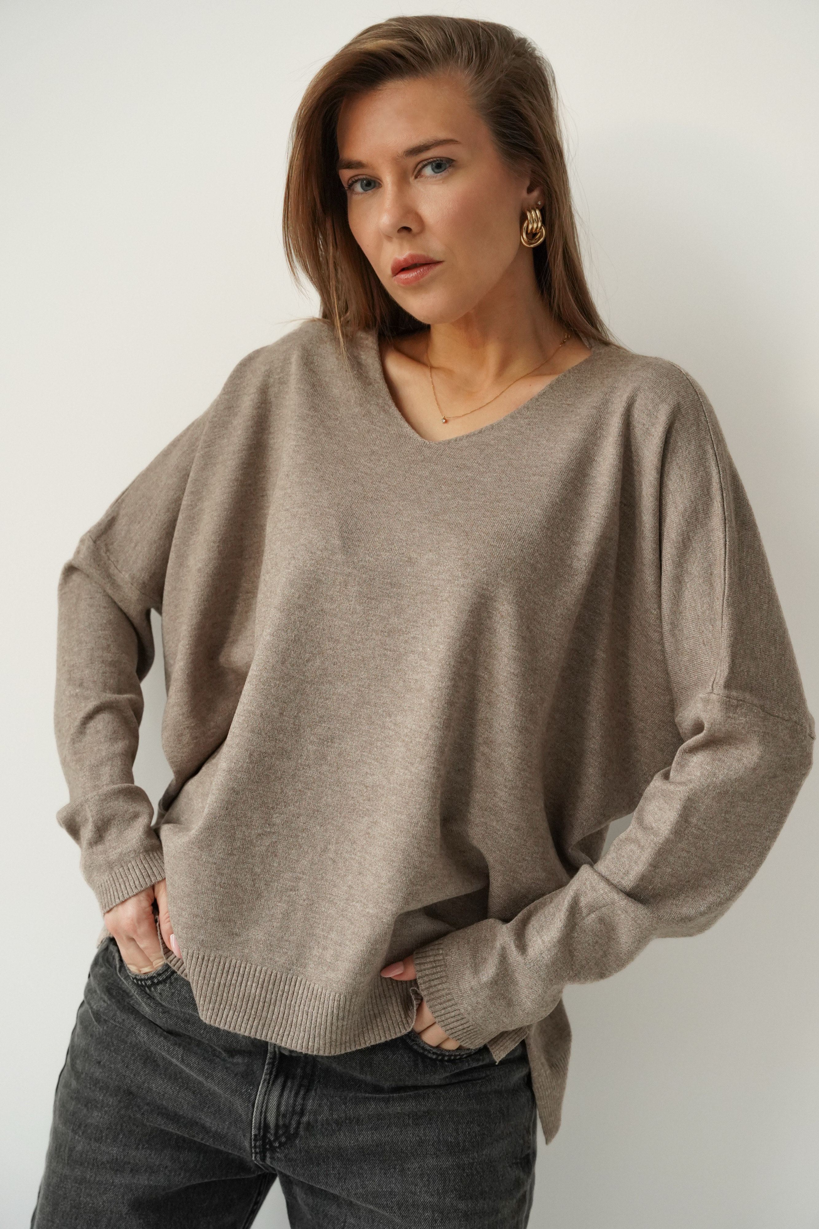 Classic V-neck sweater made of soft, body-friendly knitwear with cashmere. A straight cut with raglan sleeves, subtly broken by a slight asymmetry - in the form of an extended back part and cracks on the sides. PURA is a timeless model that will be a great base for both elegant and casual styles.