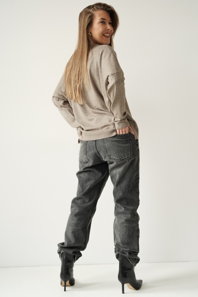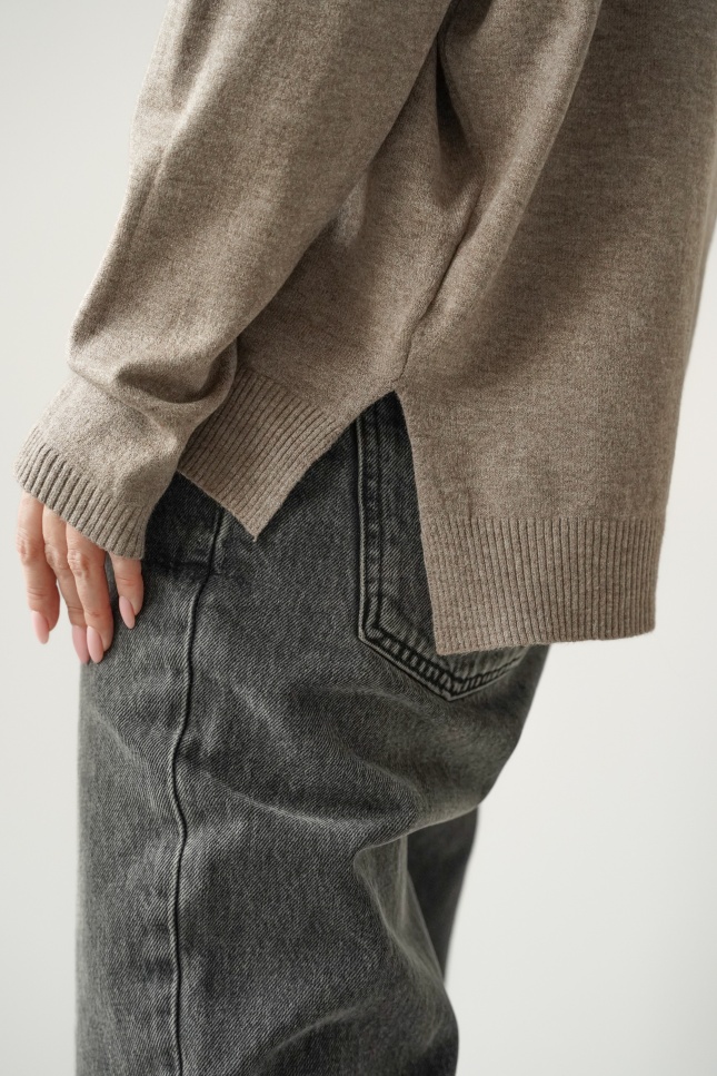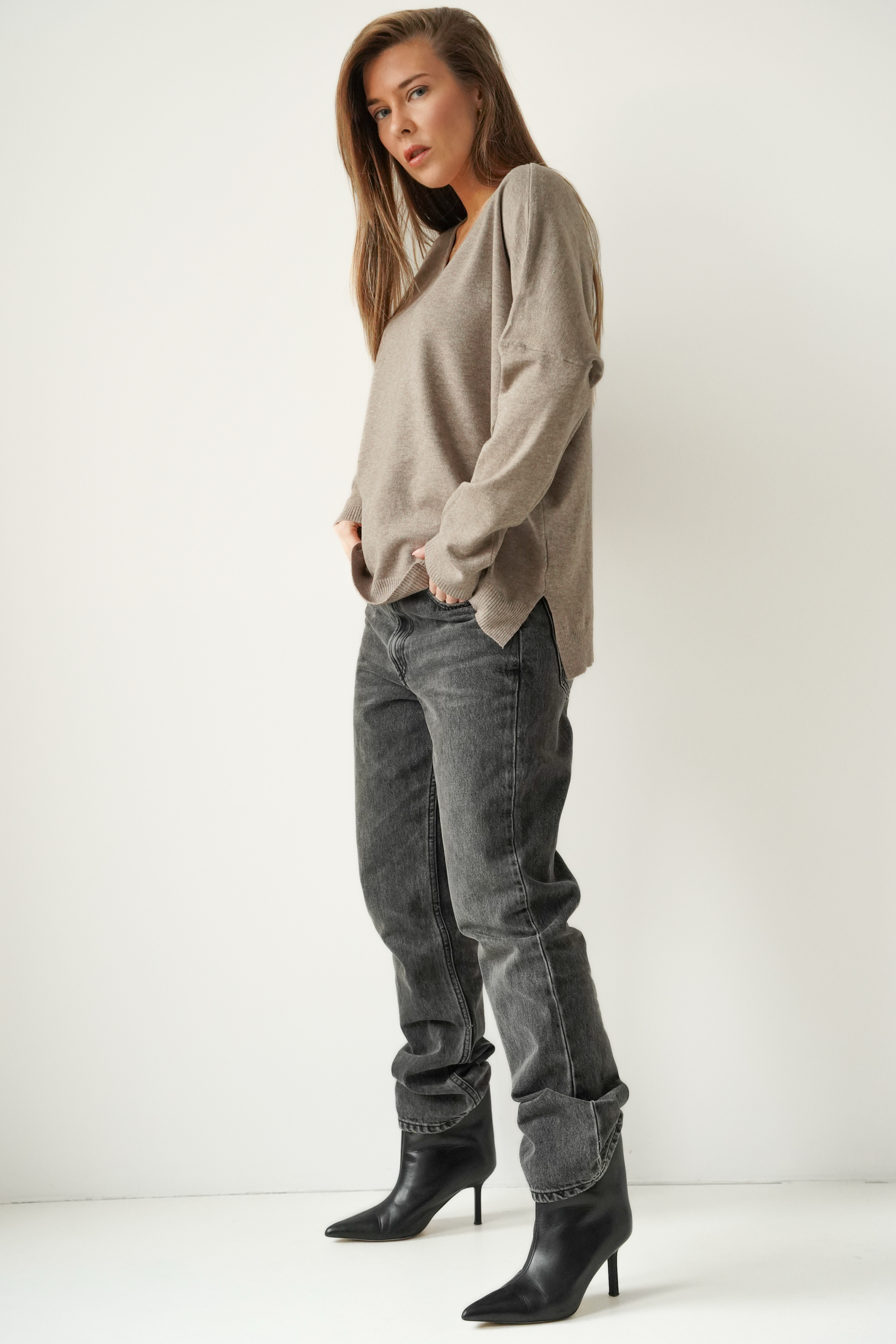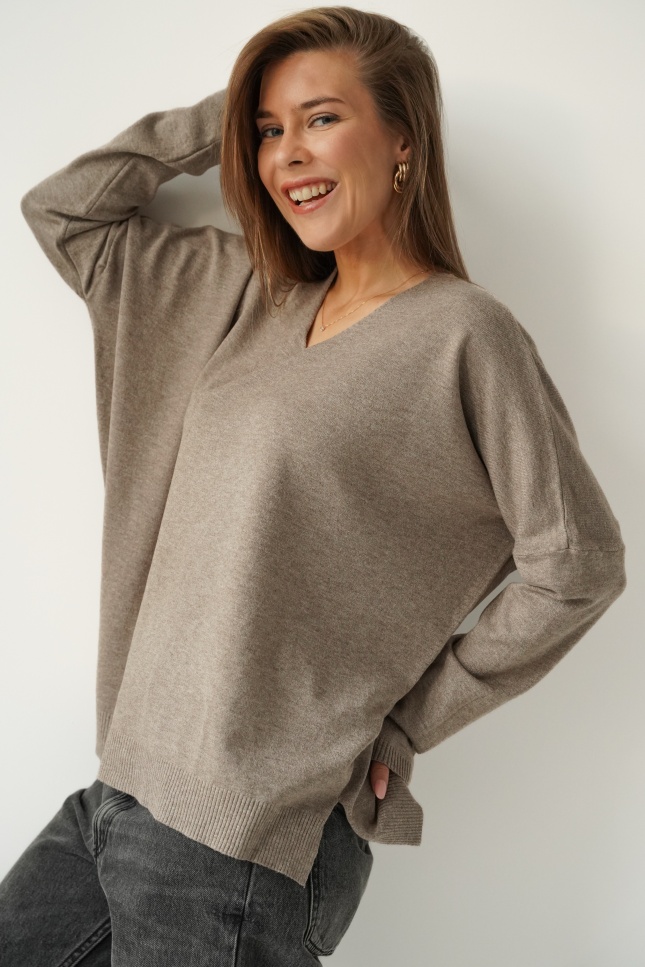 Classic V-neck sweater made of soft, body-friendly knitwear with cashmere. A straight cut with raglan sleeves, subtly broken by a slight asymmetry - in the form of an extended back part and cracks on the sides. PURA is a timeless model that will be a great base for both elegant and casual styles.