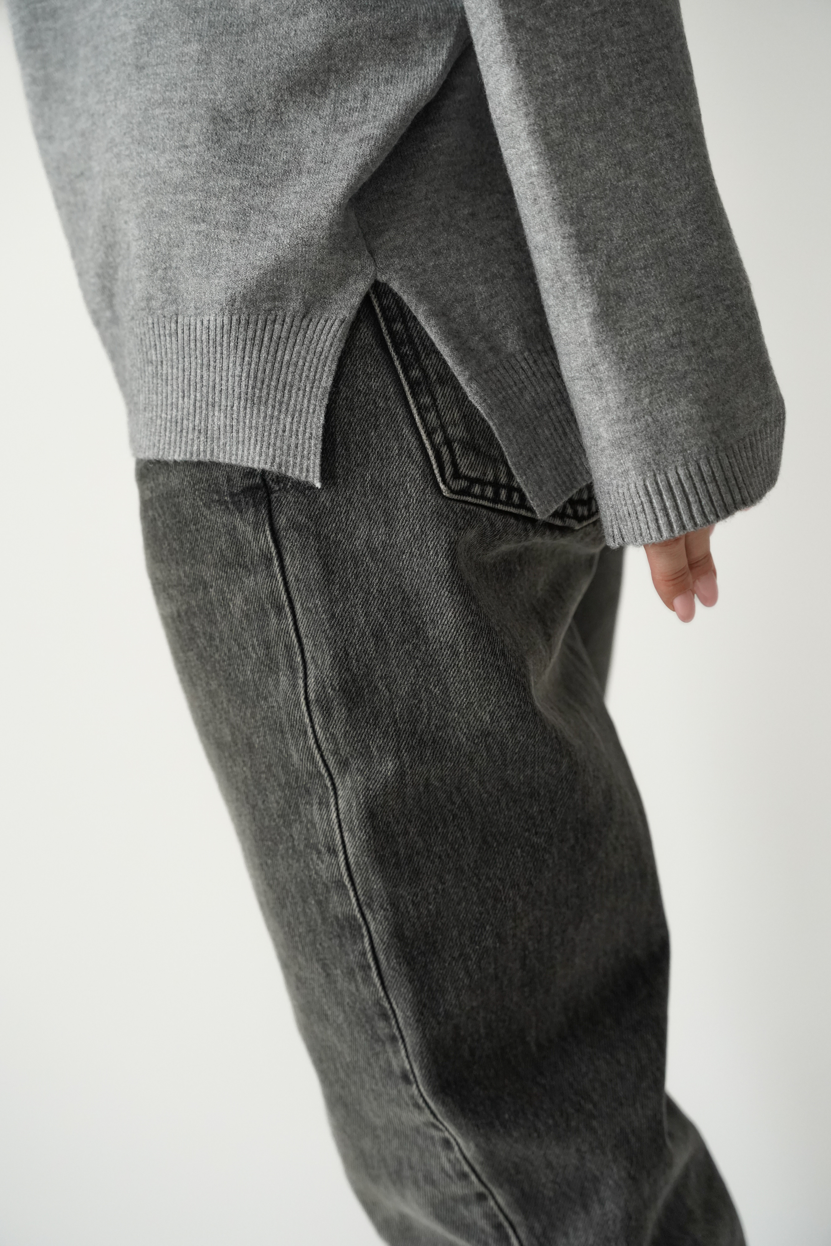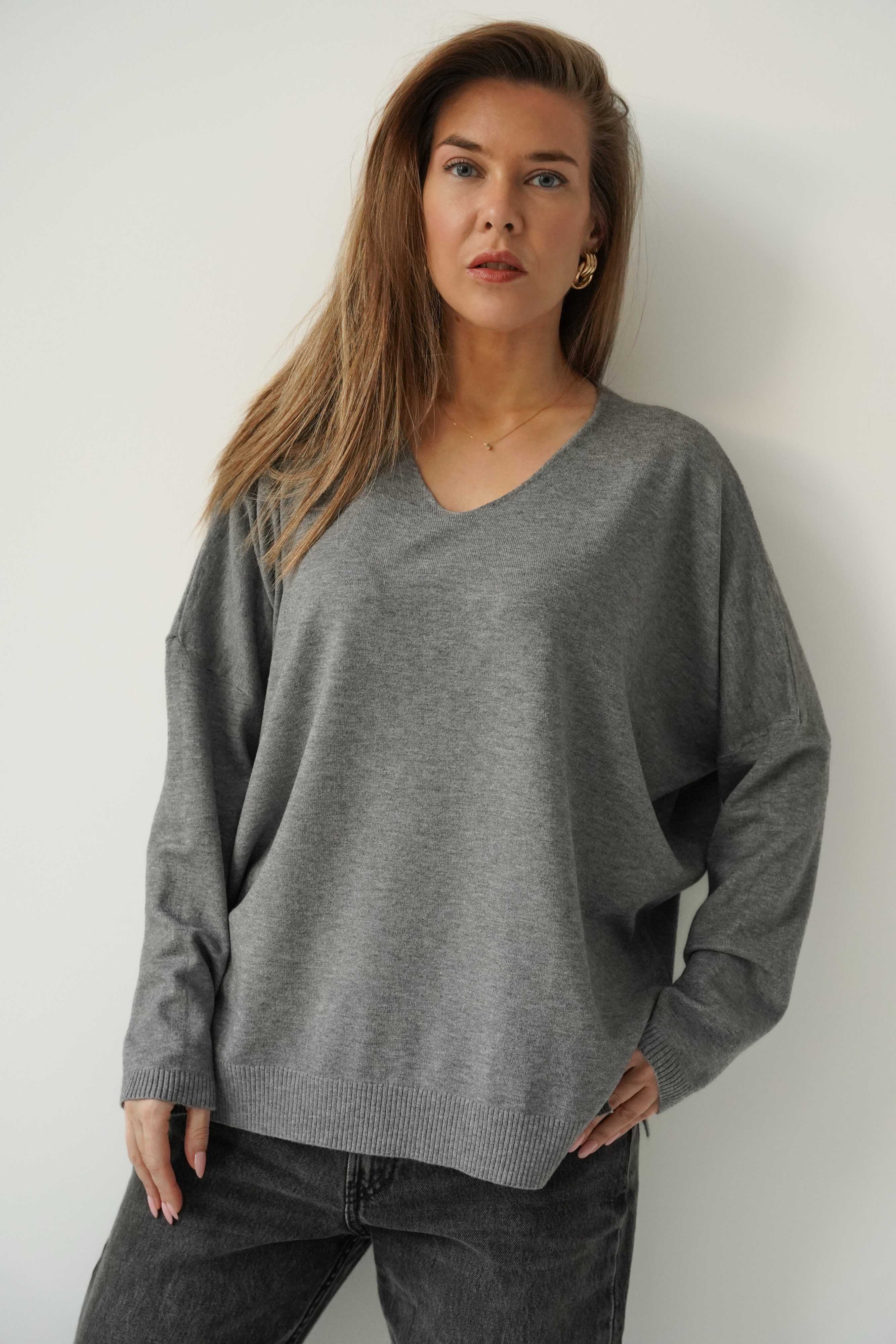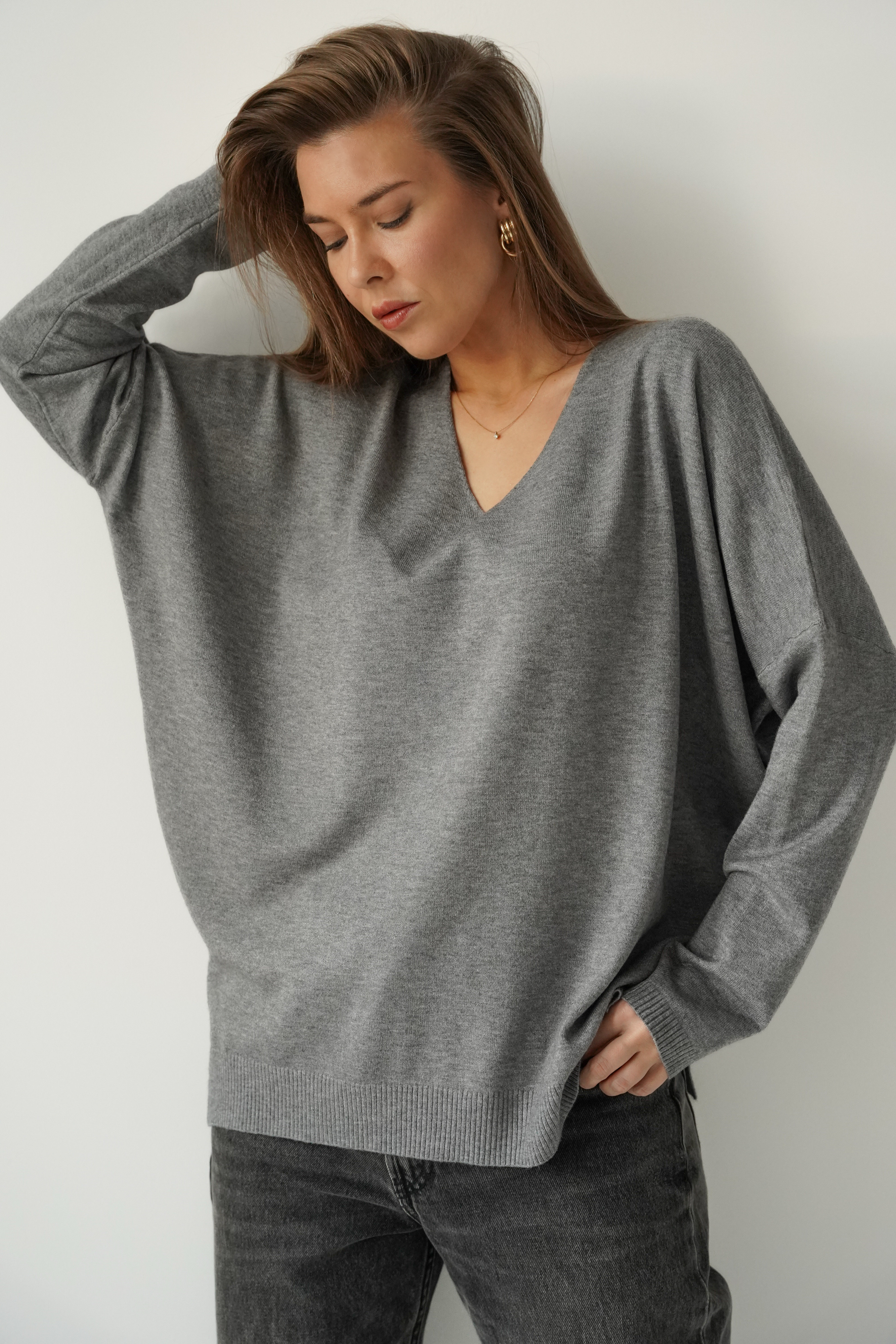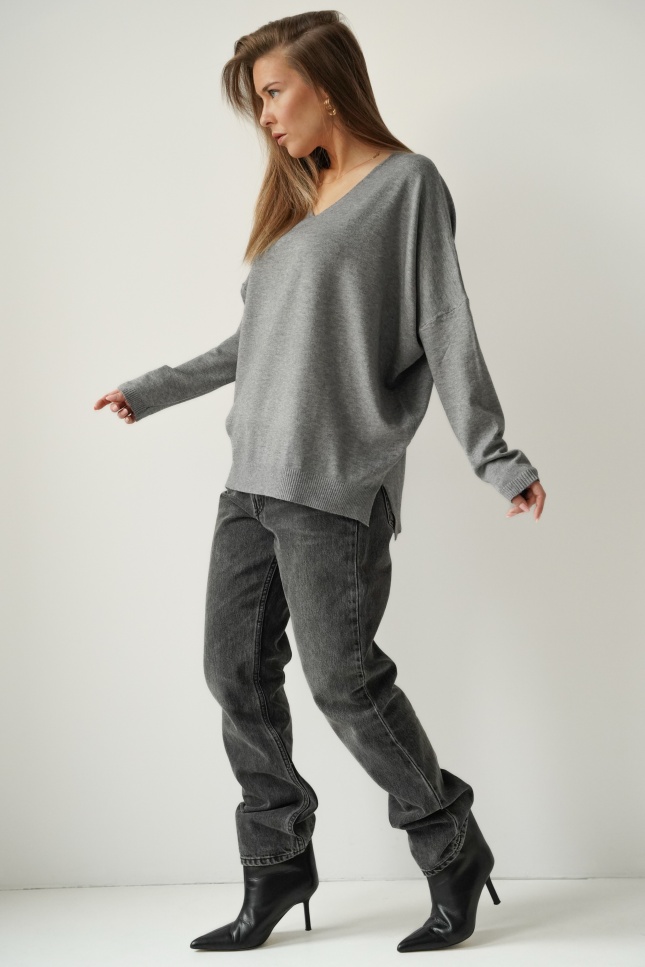 Classic V-neck sweater made of soft, body-friendly knitwear with cashmere. A straight cut with raglan sleeves, subtly broken by a slight asymmetry - in the form of an extended back part and cracks on the sides. PURA is a timeless model that will be a great base for both elegant and casual styles.