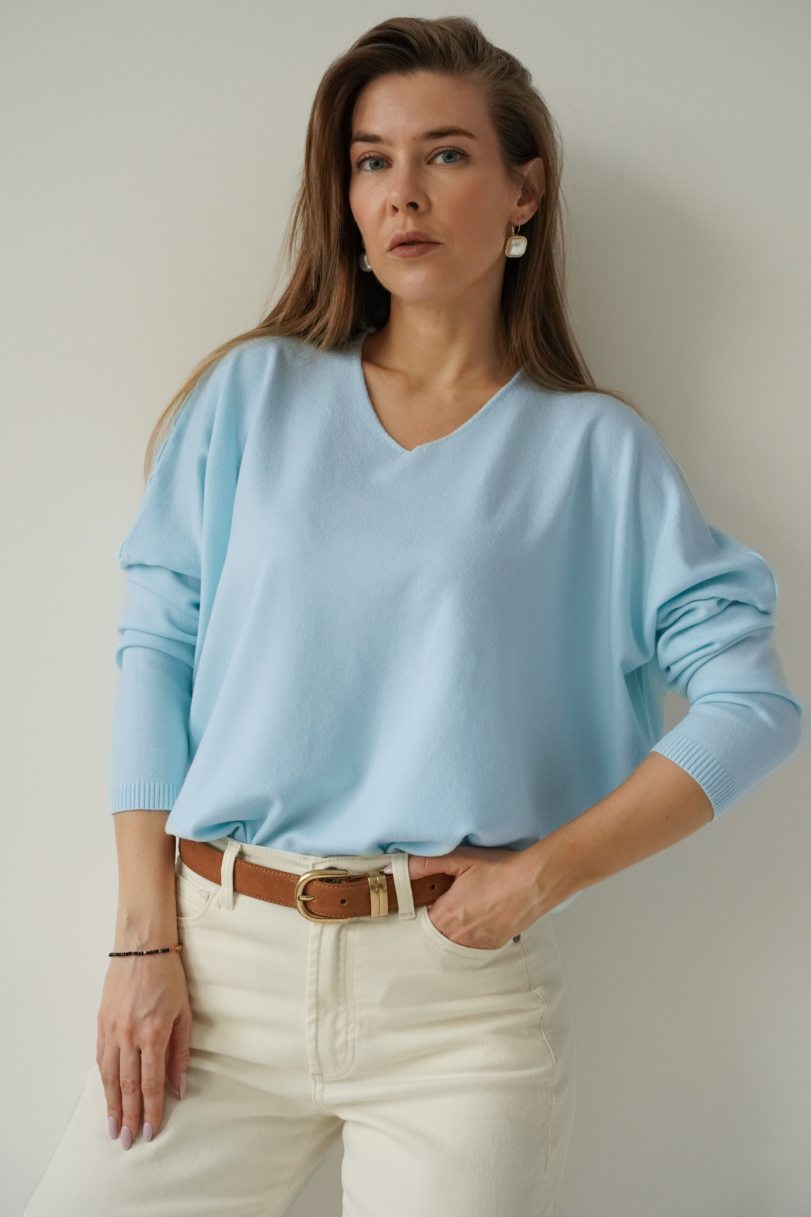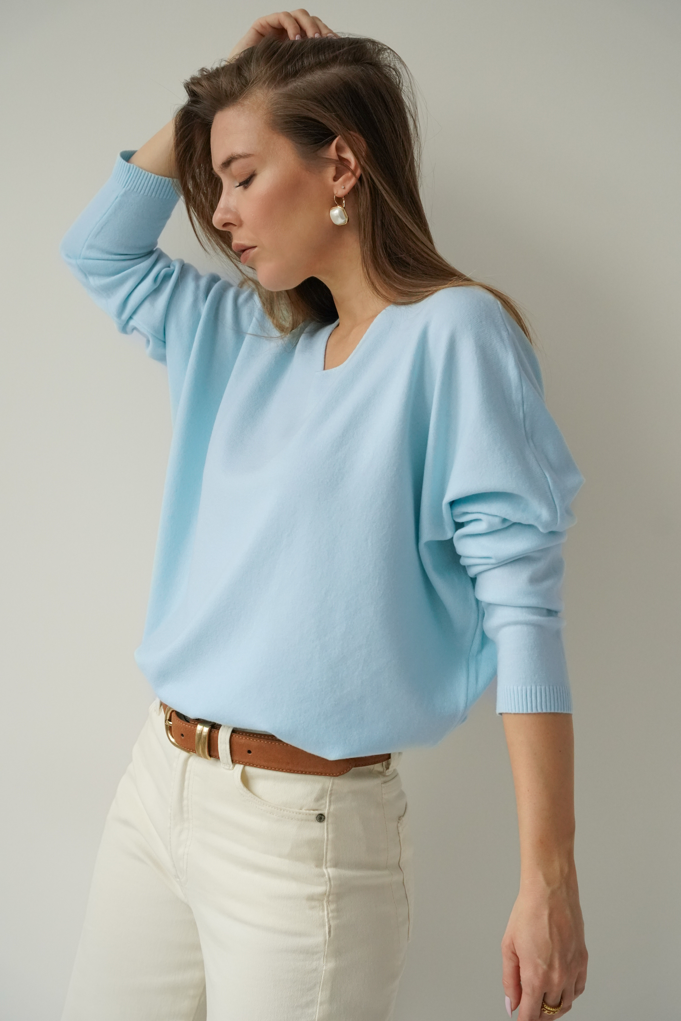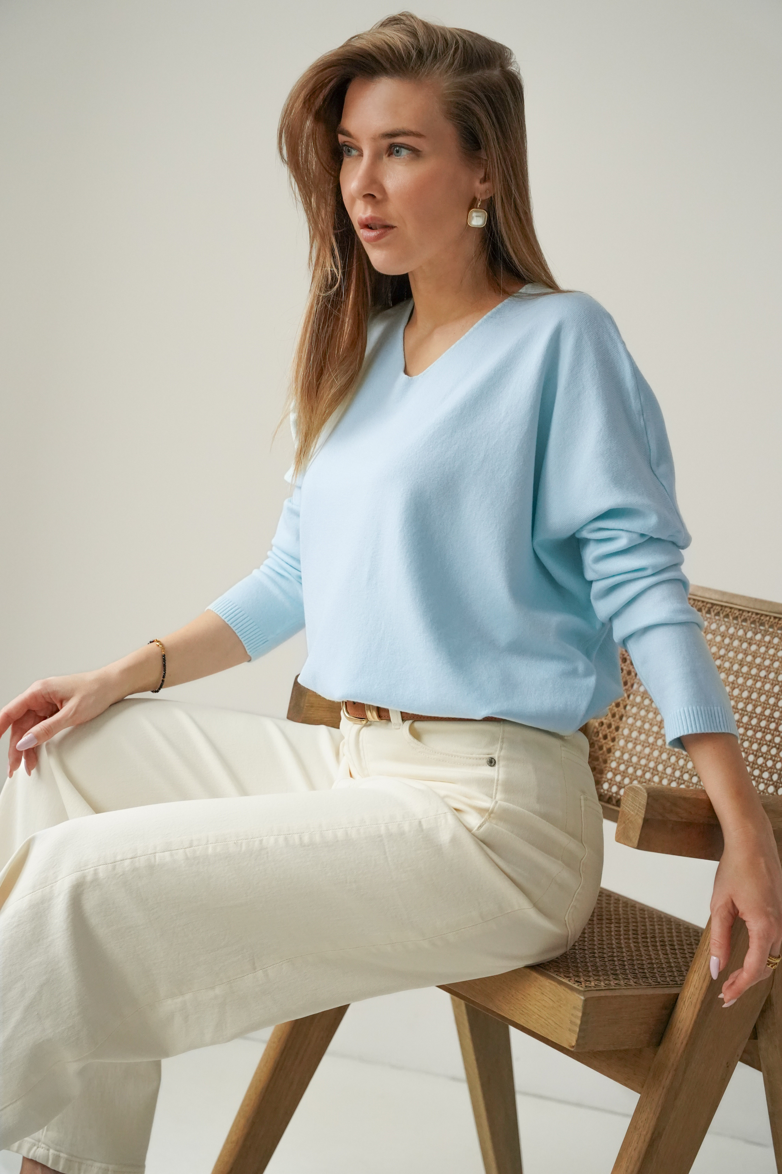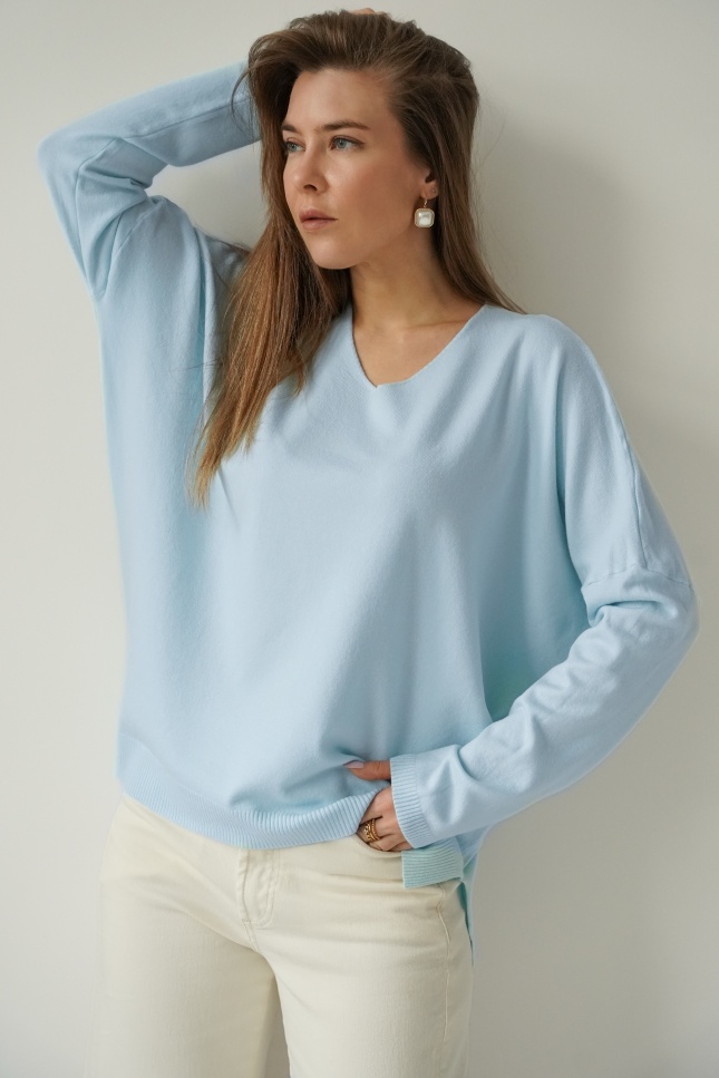 Classic V-neck sweater made of soft, body-friendly knitwear with cashmere. A straight cut with raglan sleeves, subtly broken by a slight asymmetry - in the form of an extended back part and cracks on the sides. PURA is a timeless model that will be a great base for both elegant and casual styles.