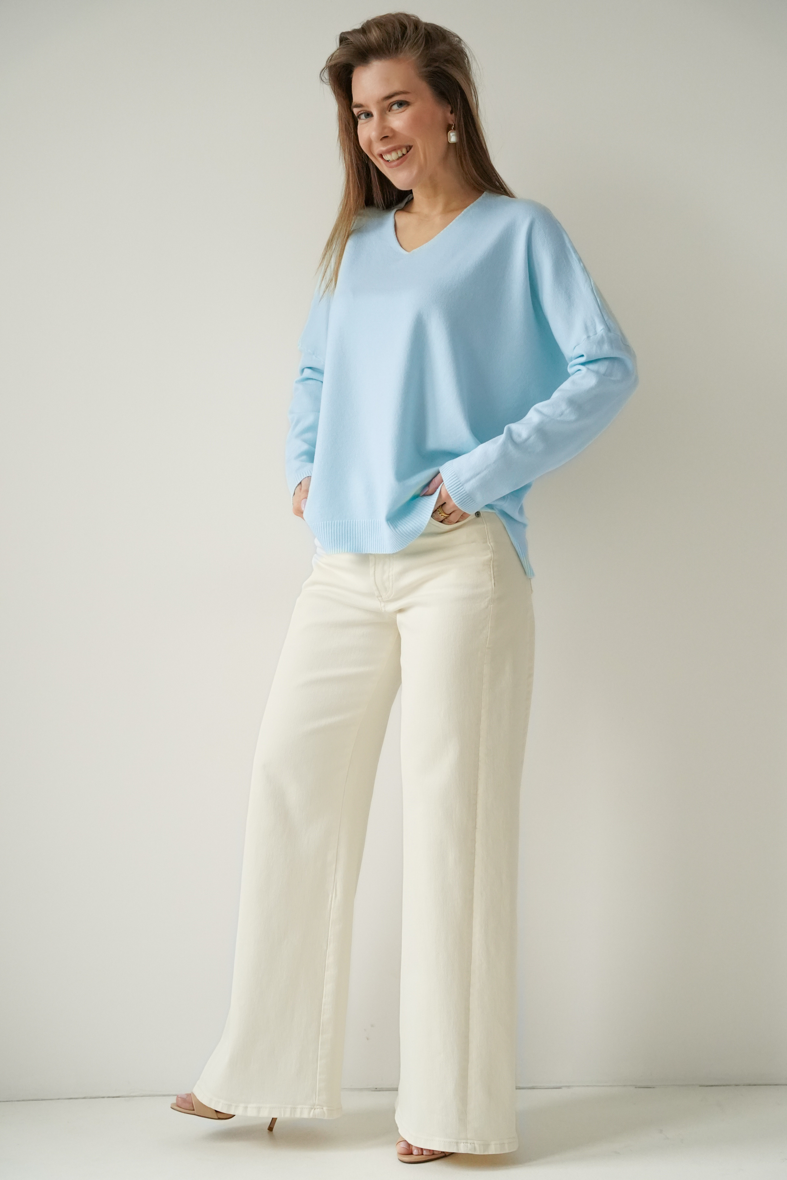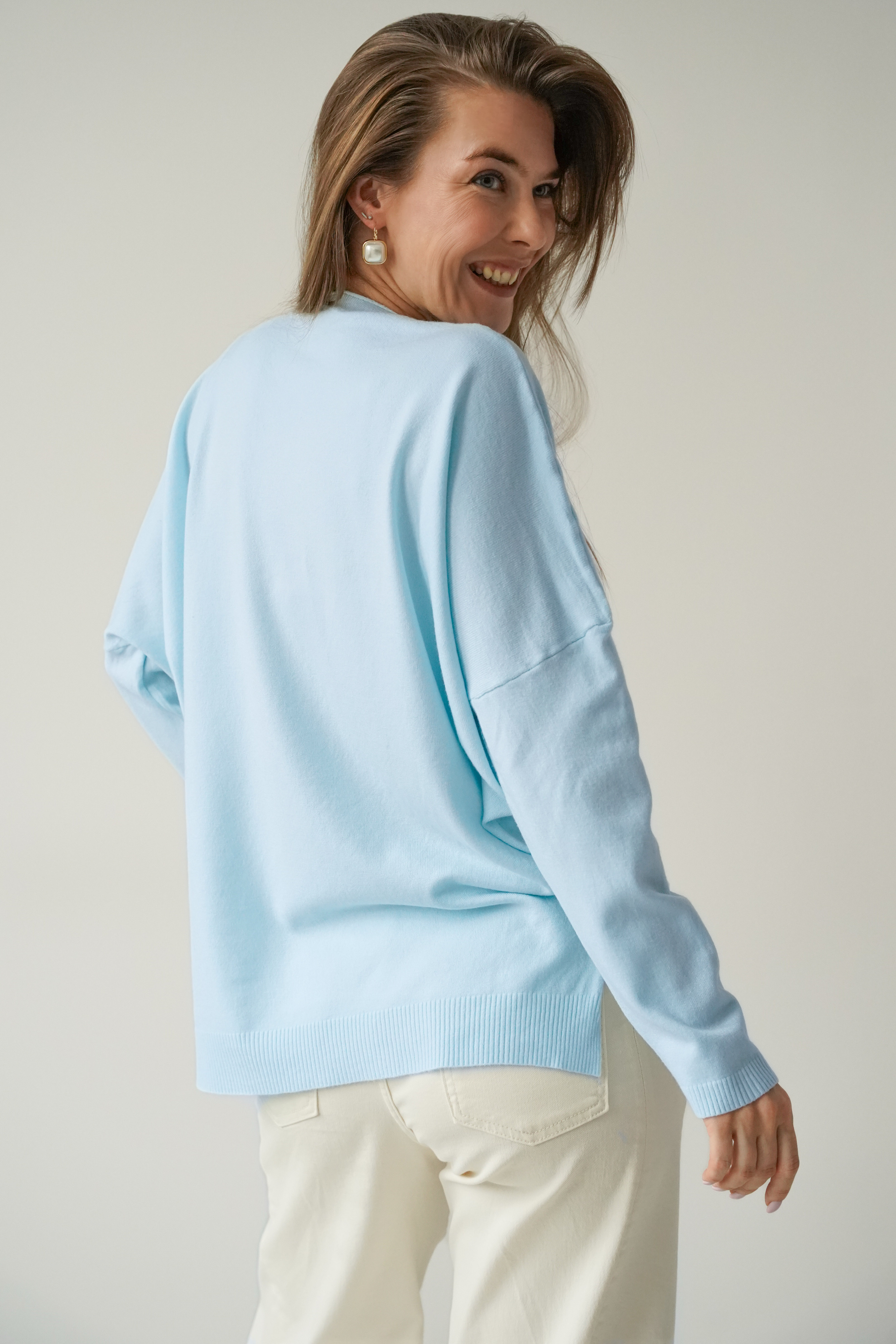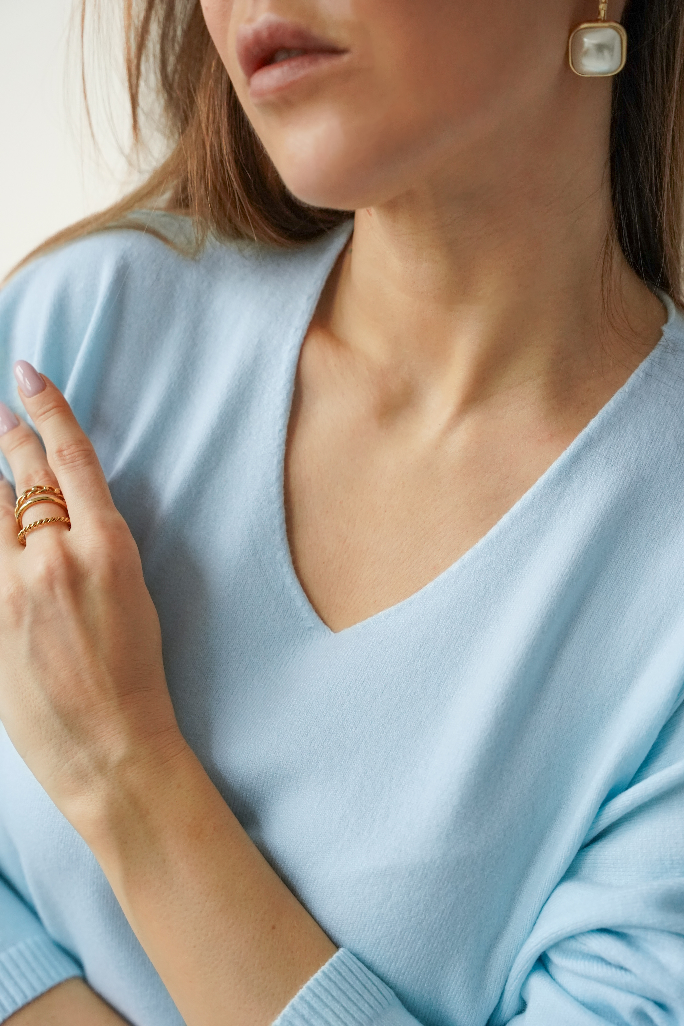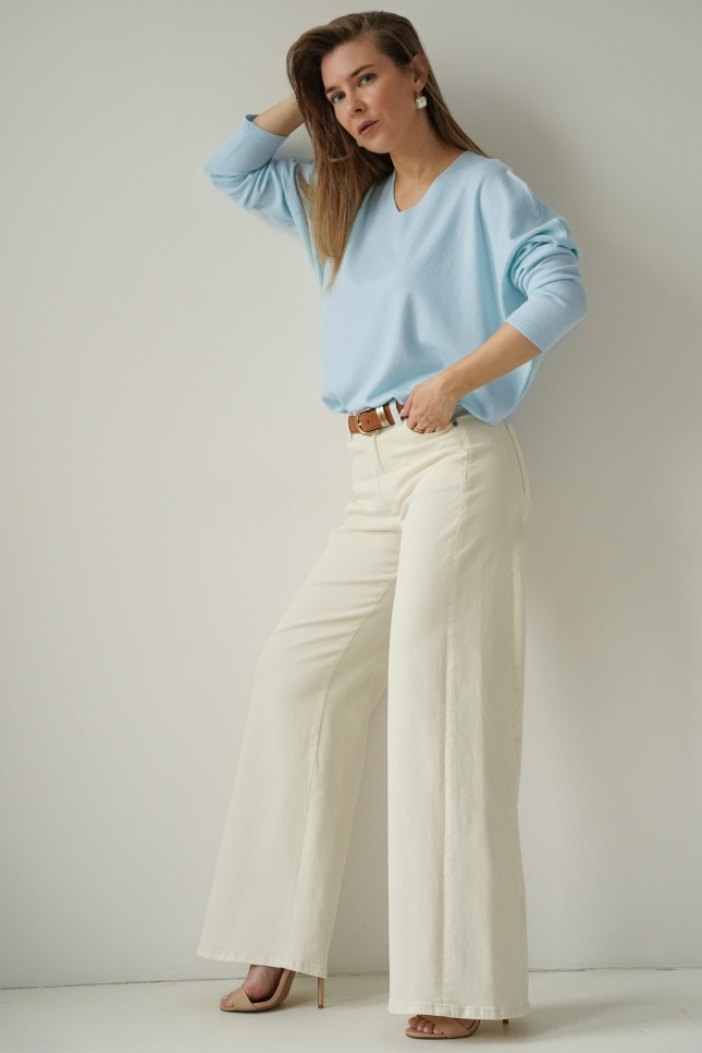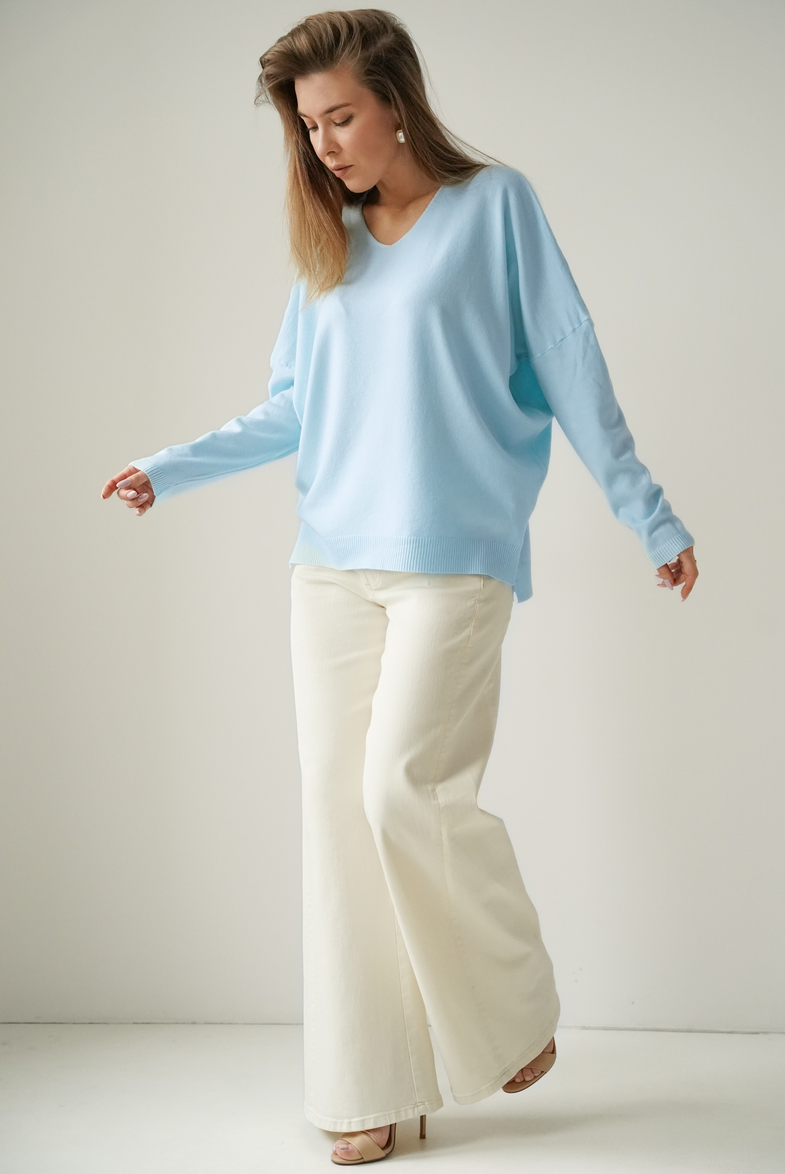 Classic V-neck sweater made of soft, body-friendly knitwear with cashmere. A straight cut with raglan sleeves, subtly broken by a slight asymmetry - in the form of an extended back part and cracks on the sides. PURA is a timeless model that will be a great base for both elegant and casual styles.