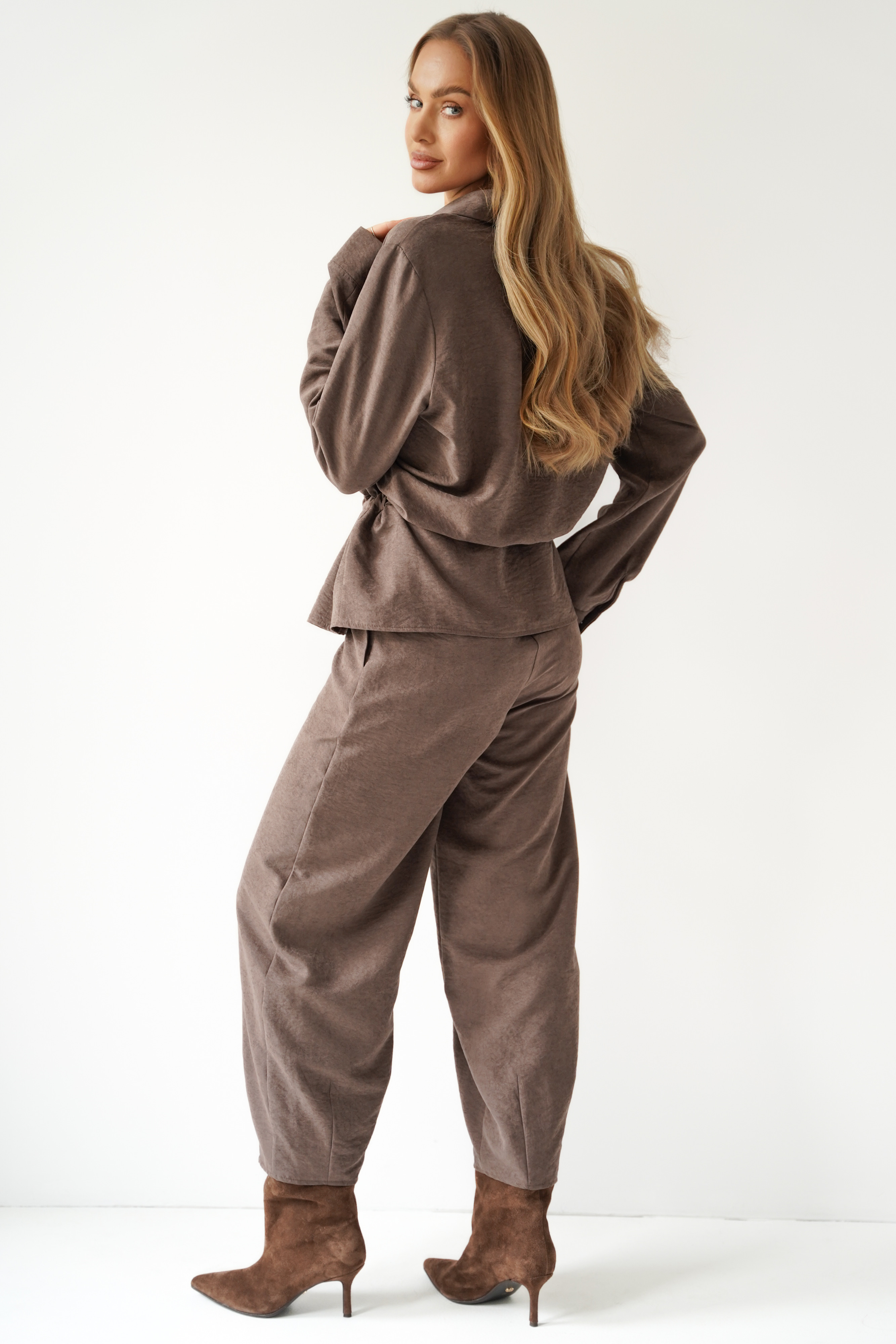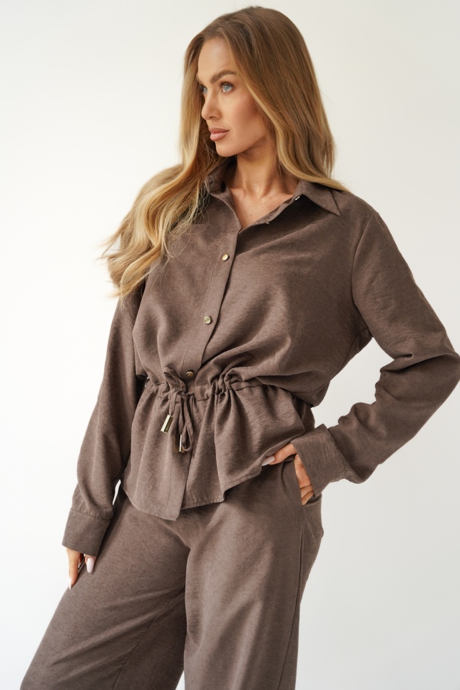 Serave is a modern set that combines comfort with timeless elegance. It consists of a loose shirt with a tie at the waist and straight-leg pants that are slightly tapered at the bottom. Made of a unique suede-like fabric (90% lyocell, 10% rayon), it delights with its softness and subtle finish. The perfect choice for the office, weekend outings, or elegant meetings, “Serave” allows you to create outfits in the spirit of modern, conscious fashion.