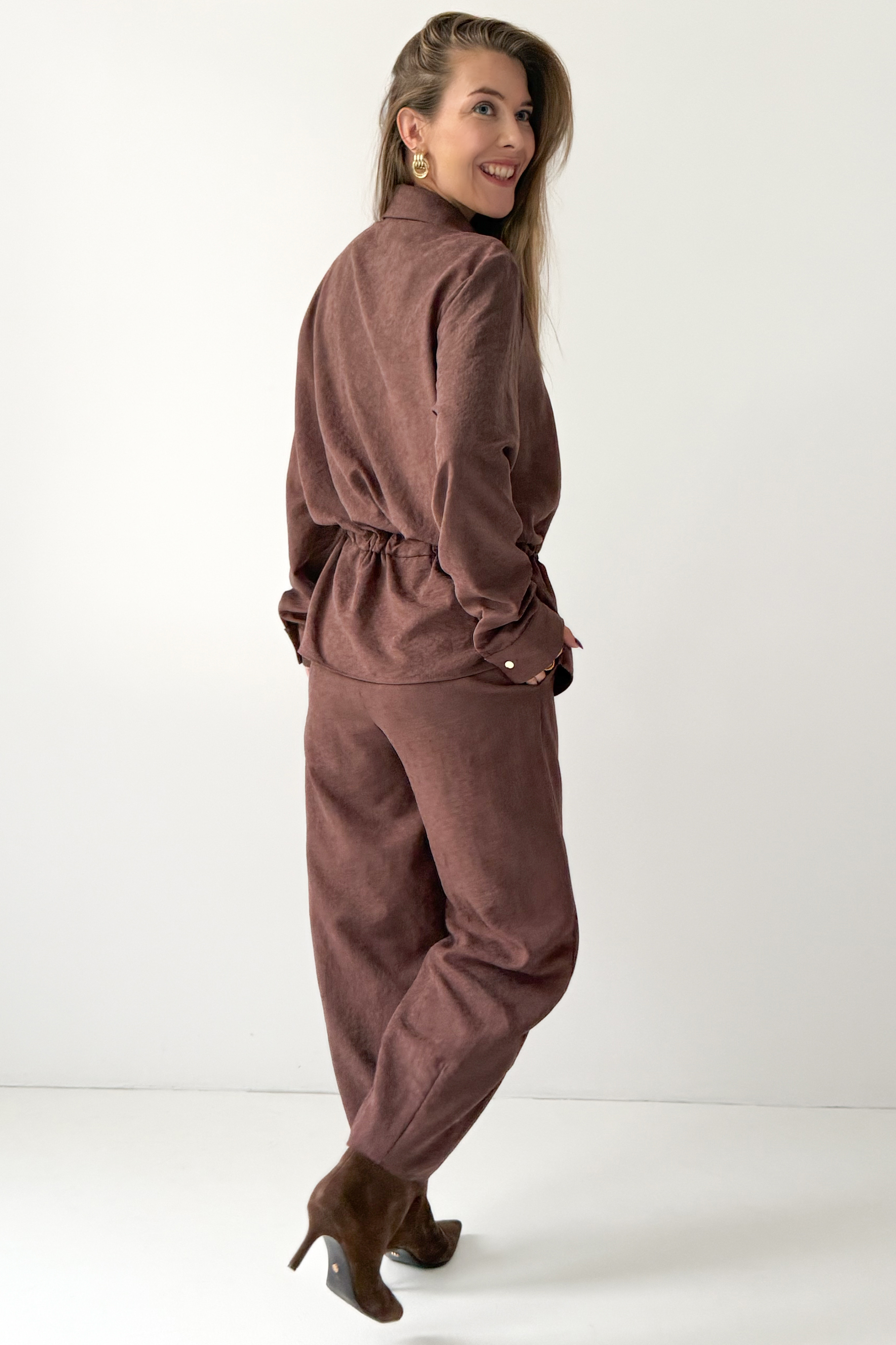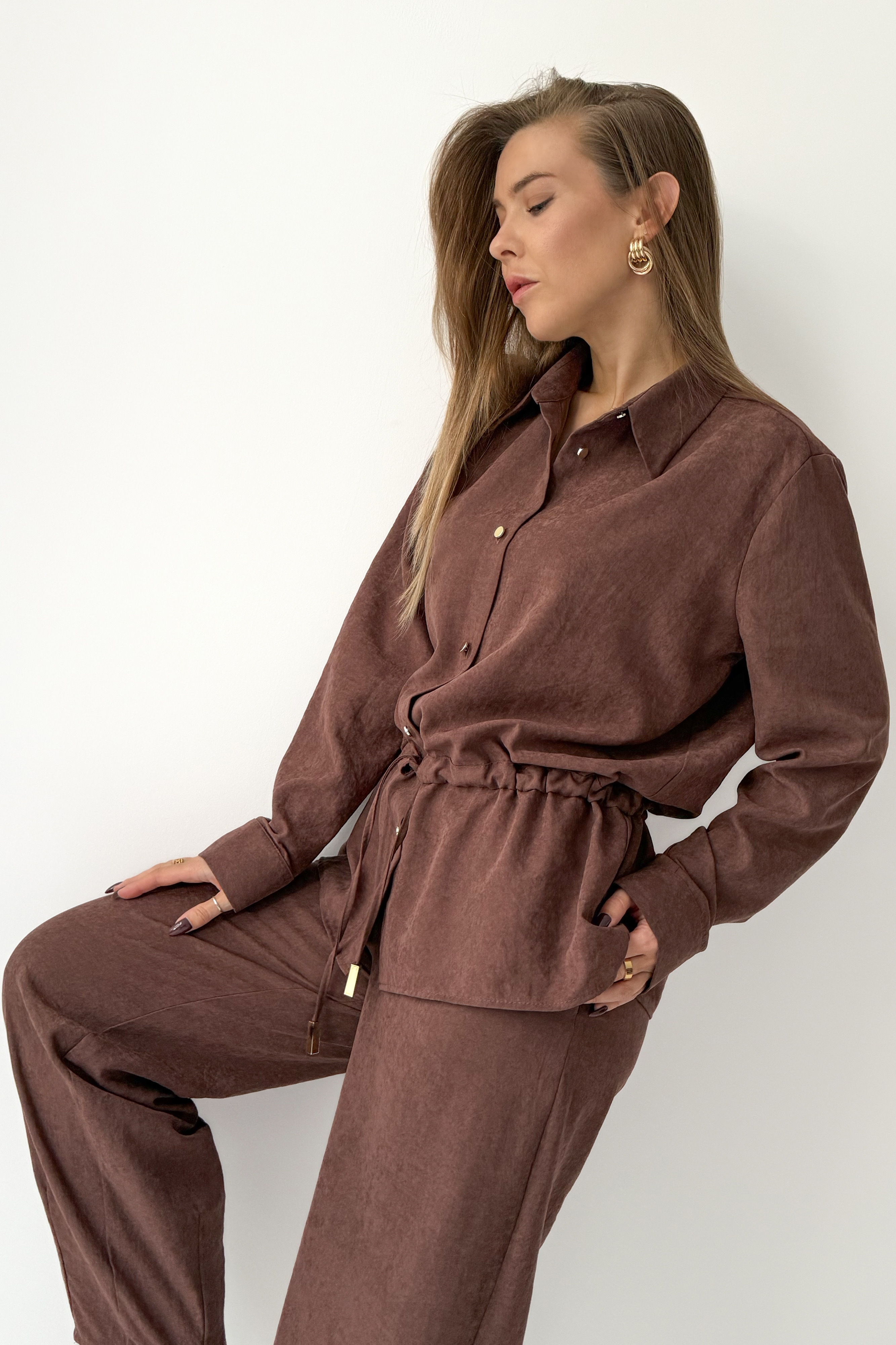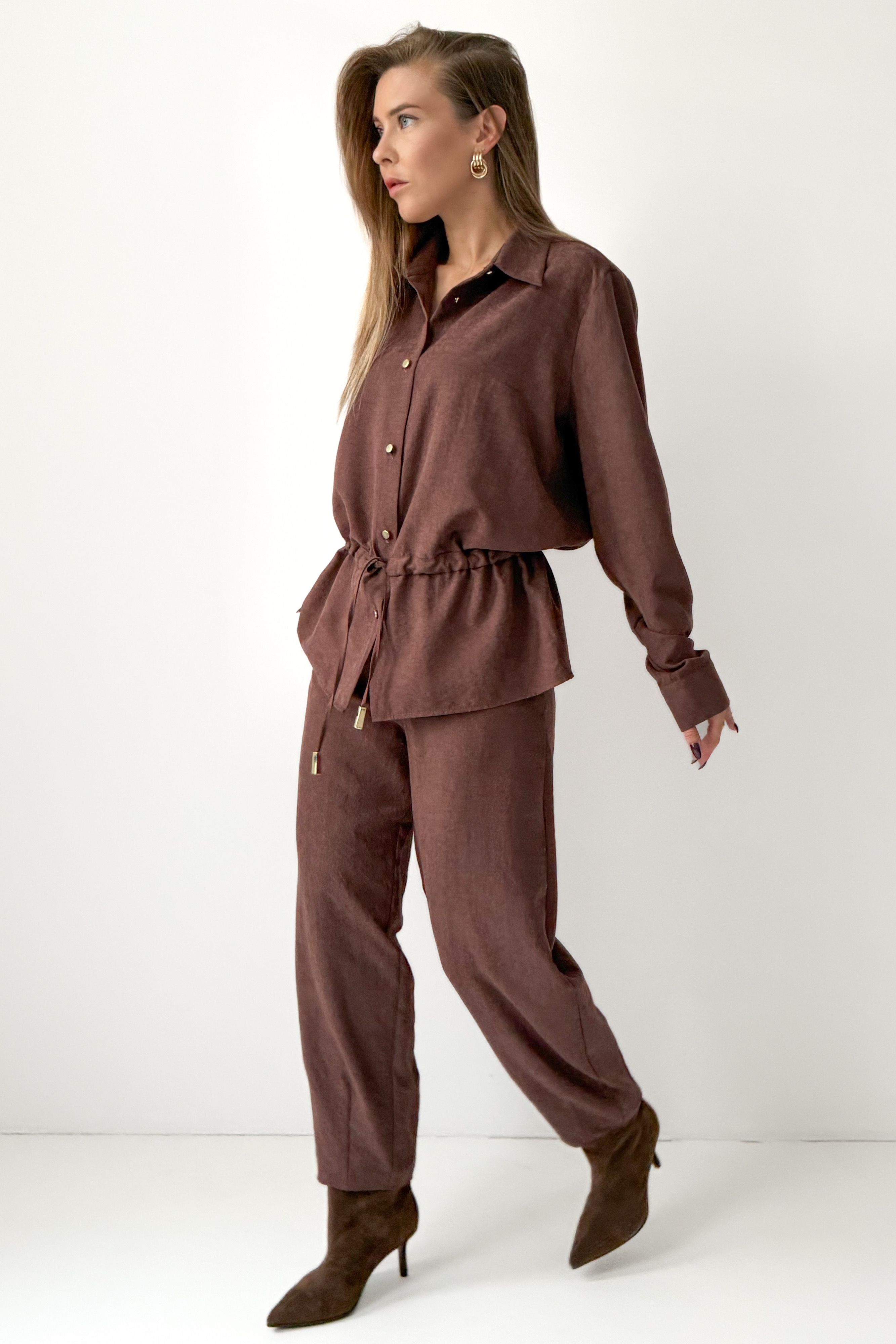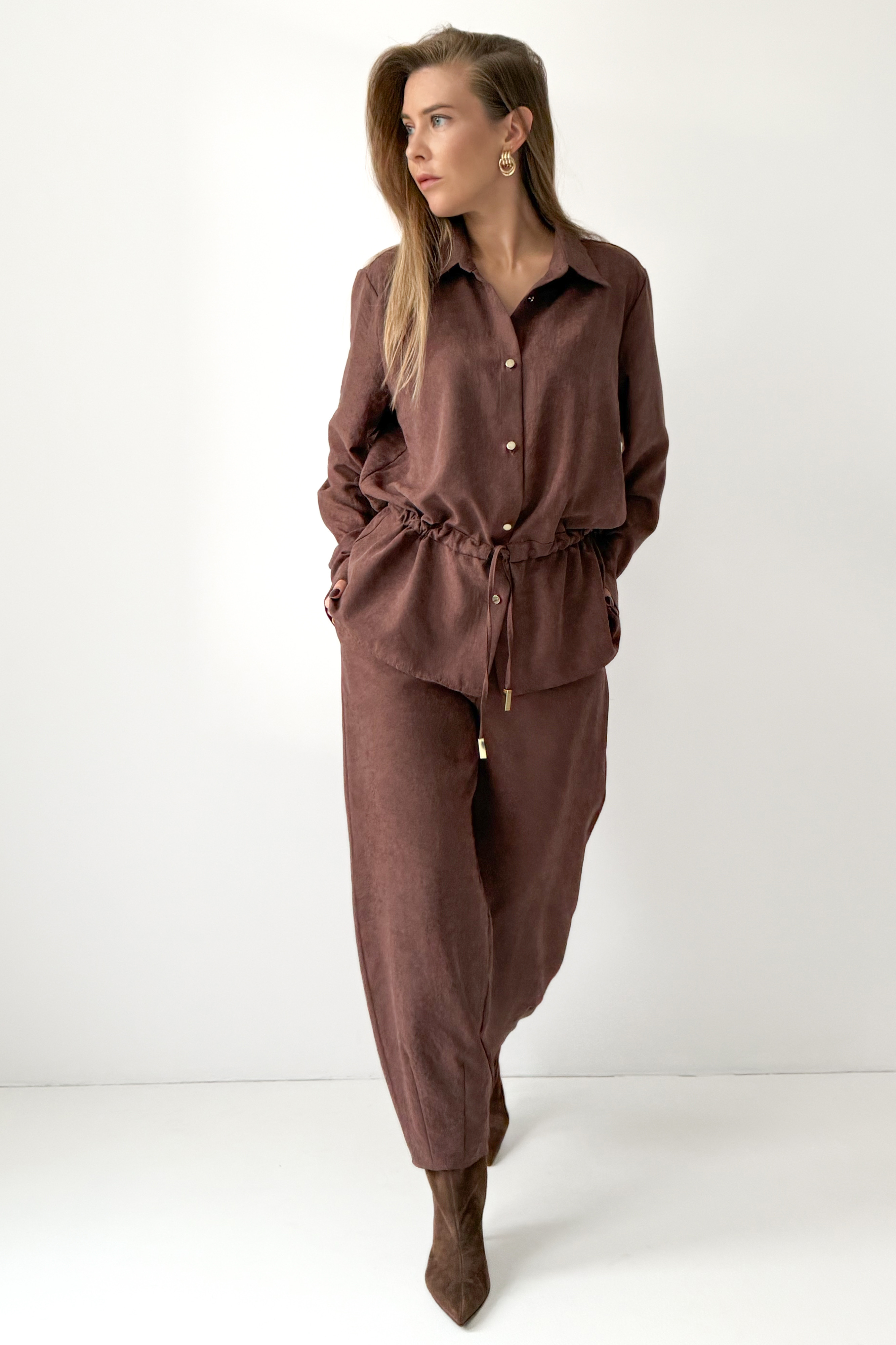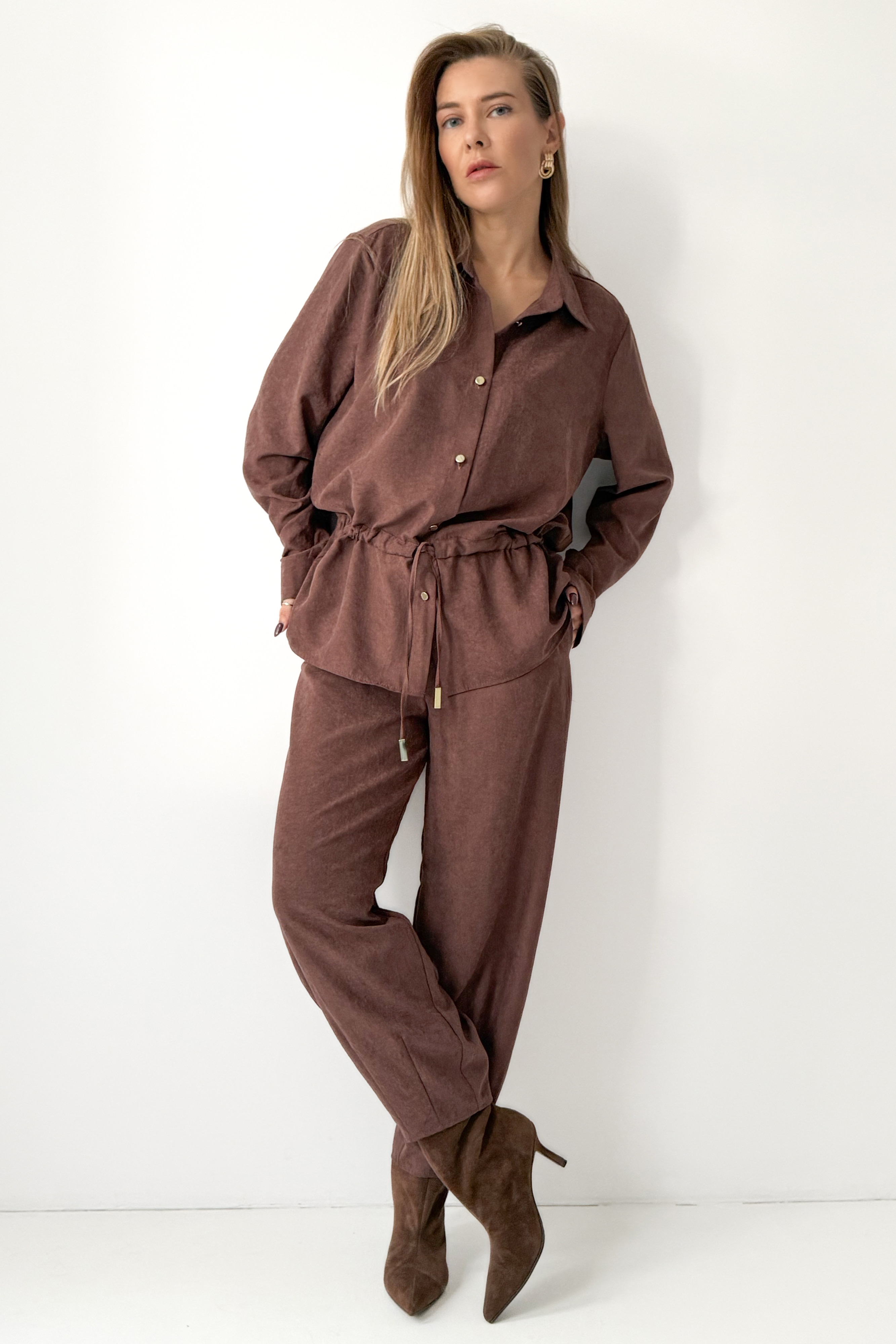 Serave is a modern set that combines comfort with timeless elegance. It consists of a loose shirt with a tie at the waist and straight-leg pants that are slightly tapered at the bottom. Made of a unique suede-like fabric (90% lyocell, 10% rayon), it delights with its softness and subtle finish. The perfect choice for the office, weekend outings, or elegant meetings, “Serave” allows you to create outfits in the spirit of modern, conscious fashion.