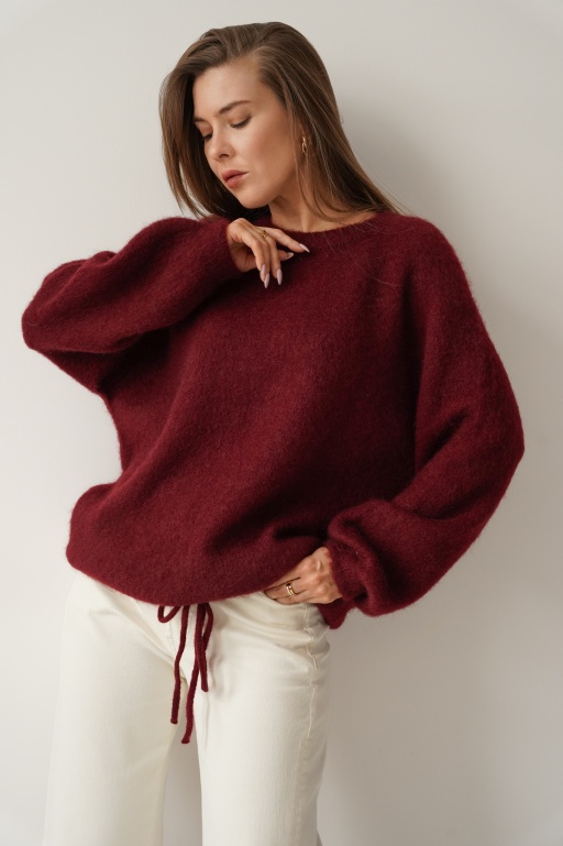 Klasyczny sweter z wiązaniem z kid moheru i wełny merino Stella marsala