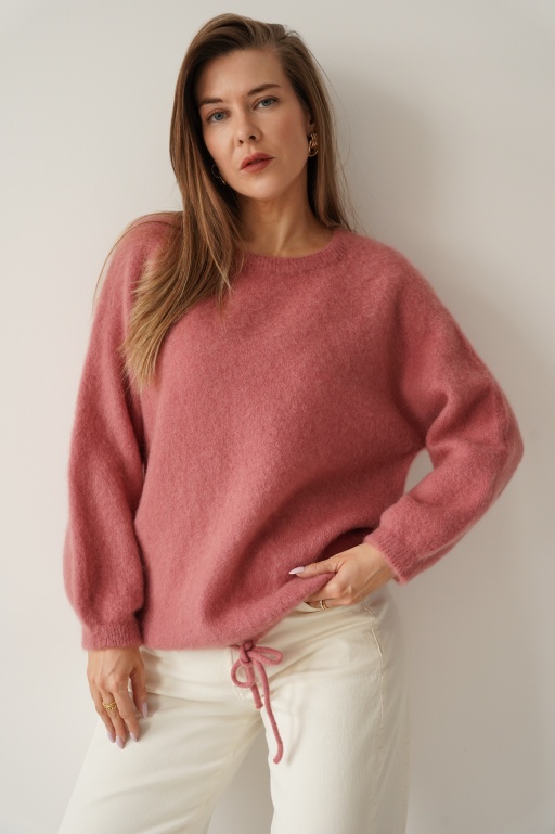 Klasyczny sweter z wiązaniem z kid moheru i wełny merino Stella mauve
