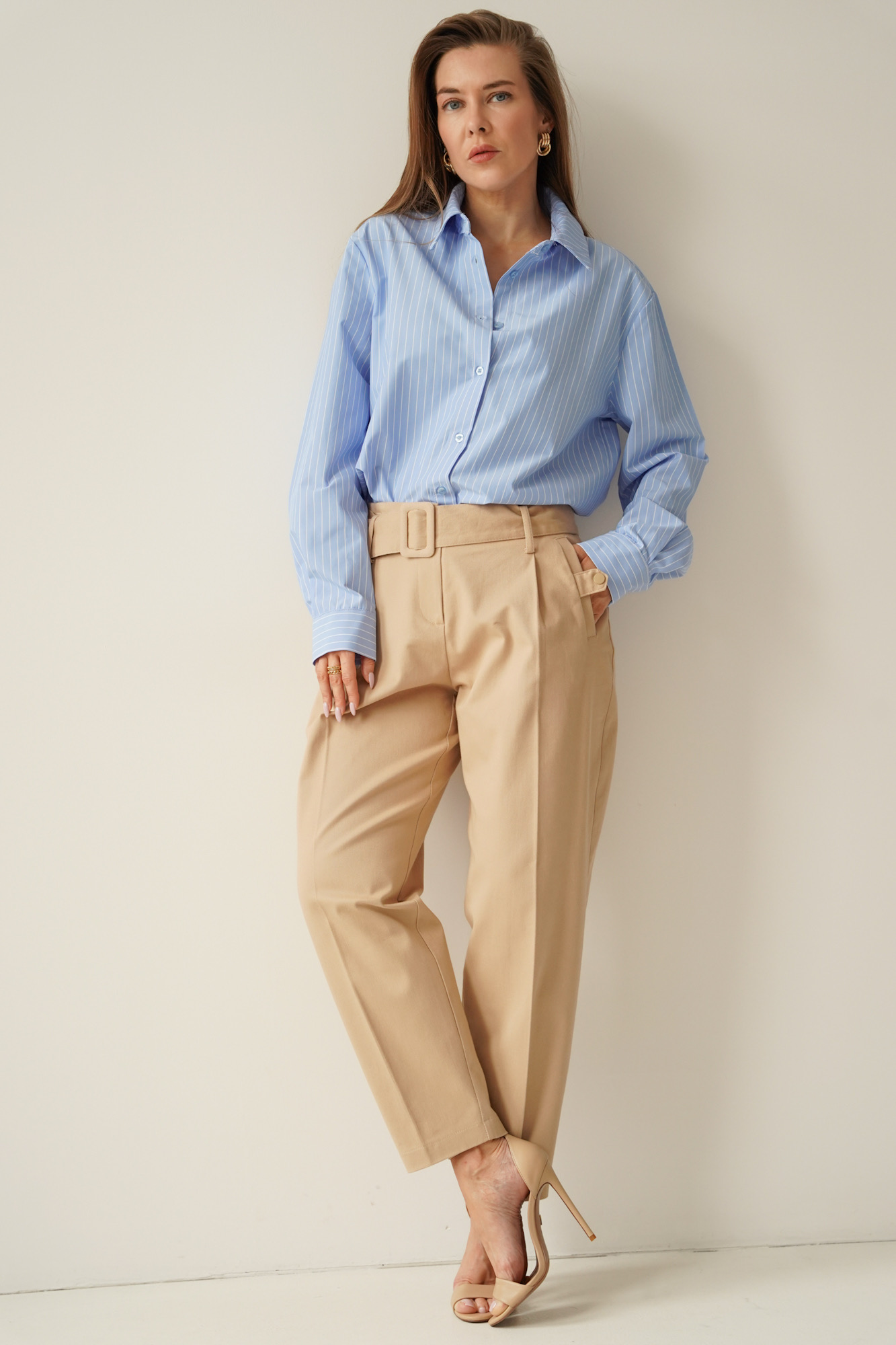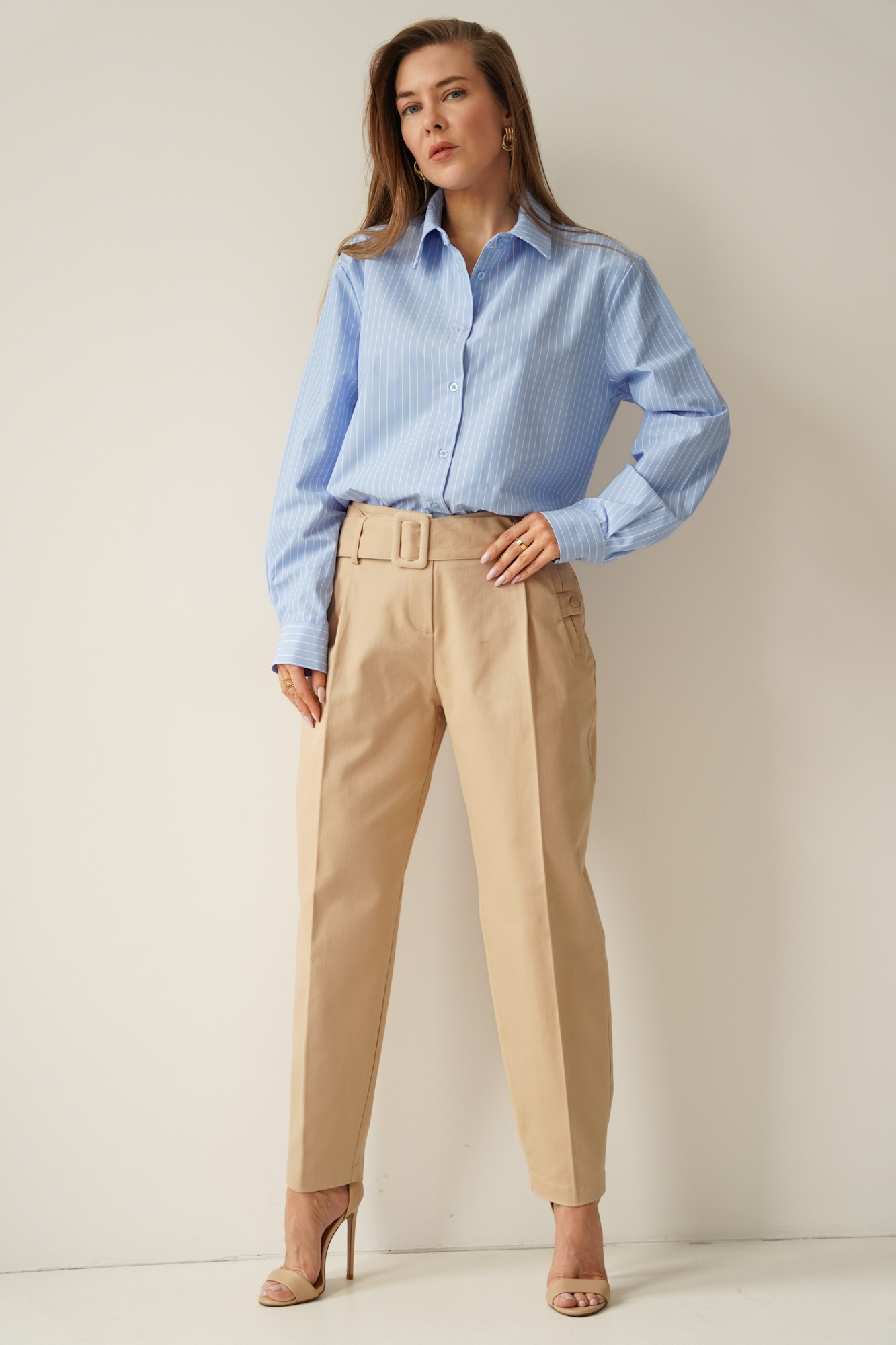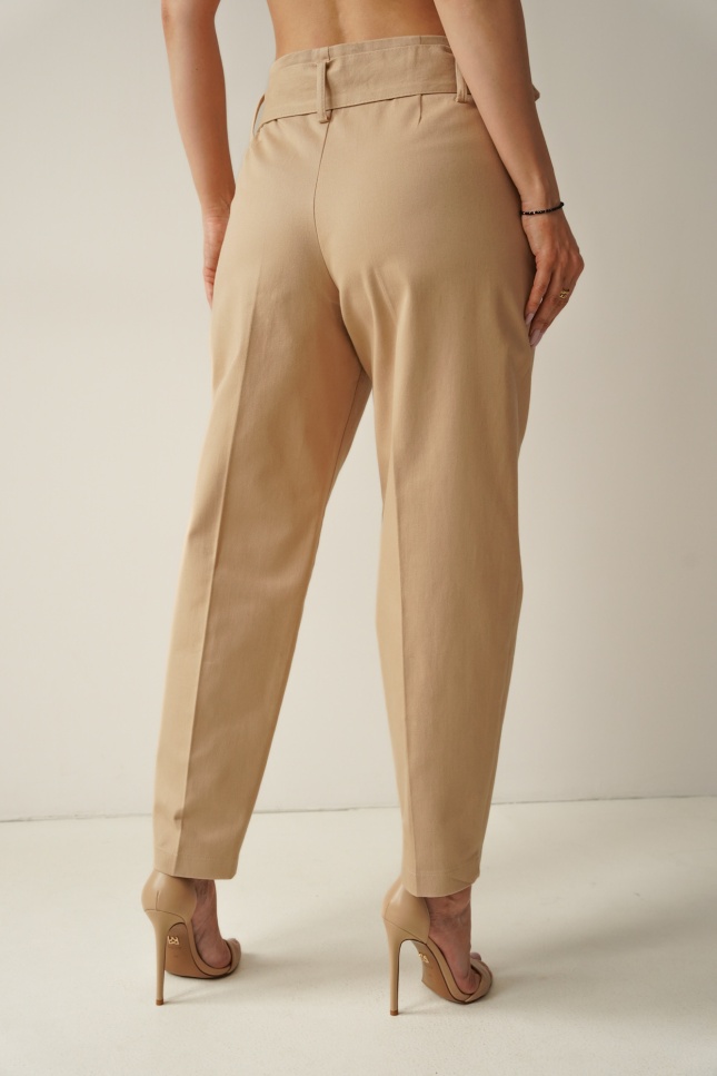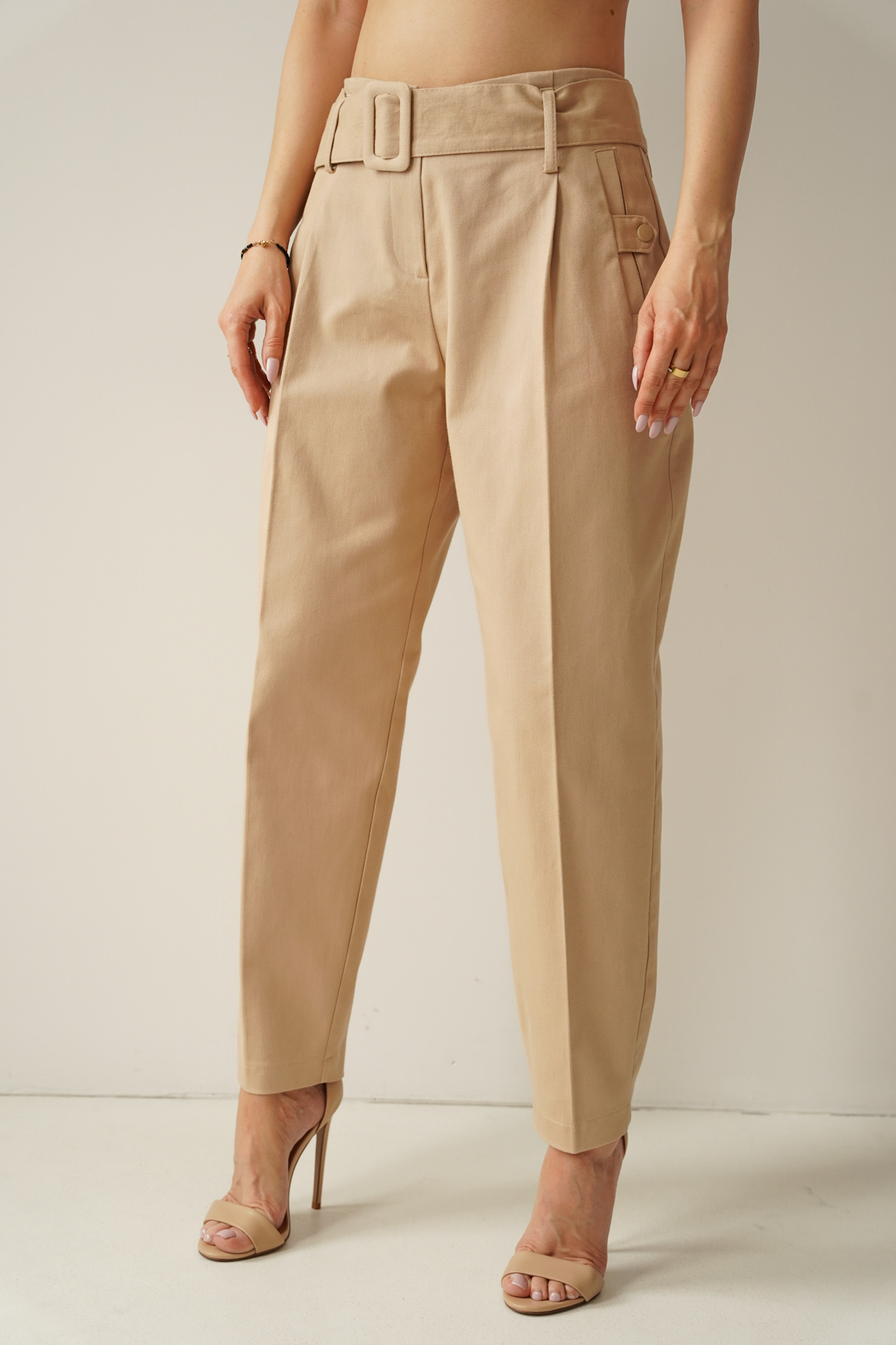 Classic baggy-inspired trousers with tapered legs, toned down and straight, combined with streetwear elements. The original side pockets with press-studs and a wide belt with a buckle in the same colour as the trousers give the trousers an original look. Made of soft, cotton denim, they will ensure your wearing comfort. Their timeless design, makes them the perfect starting point for creating many outfits.
