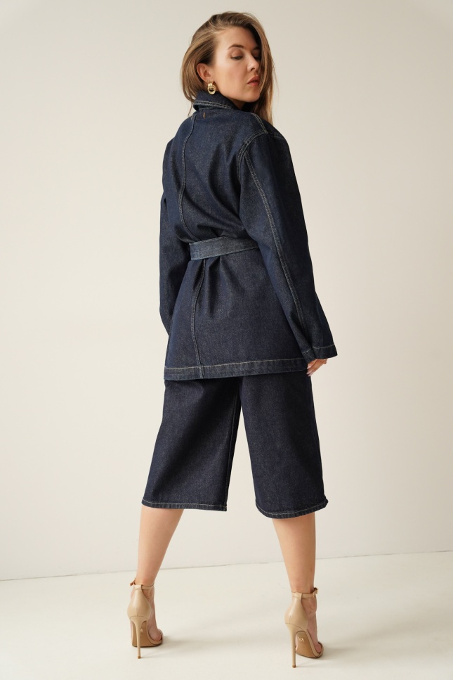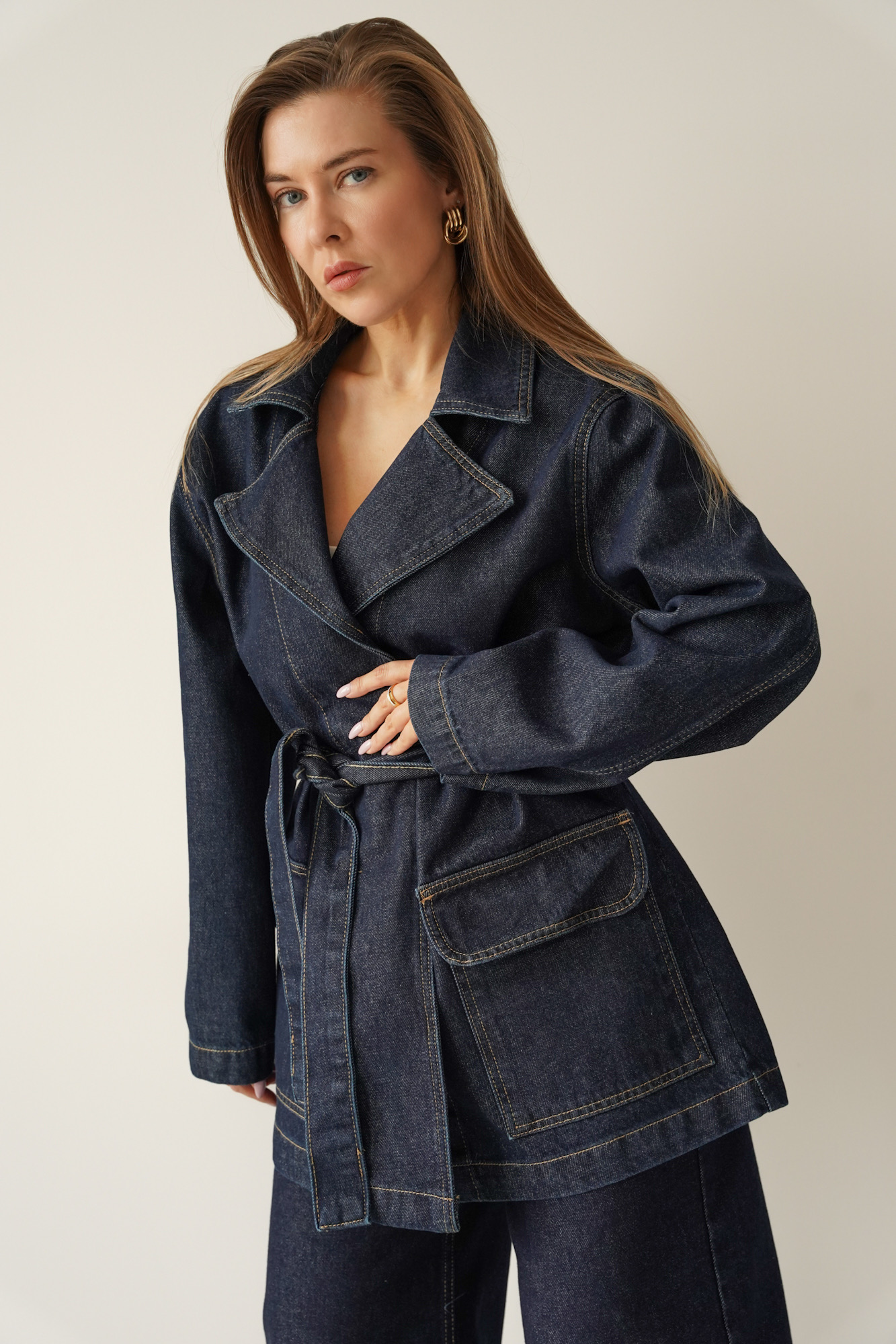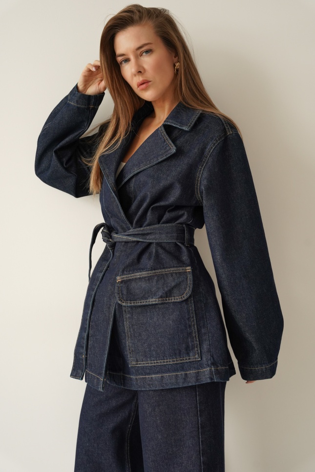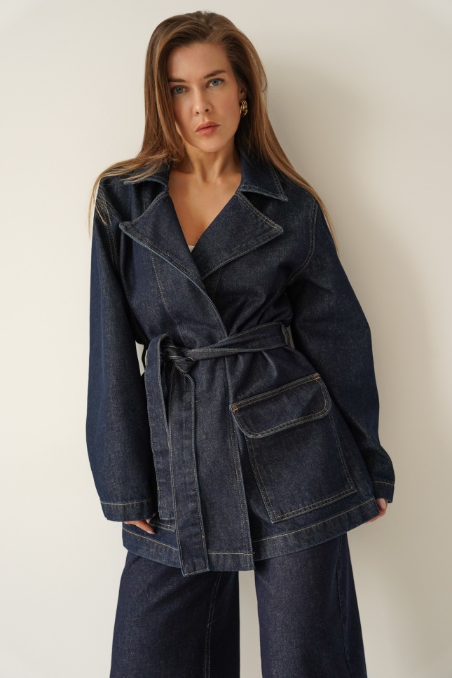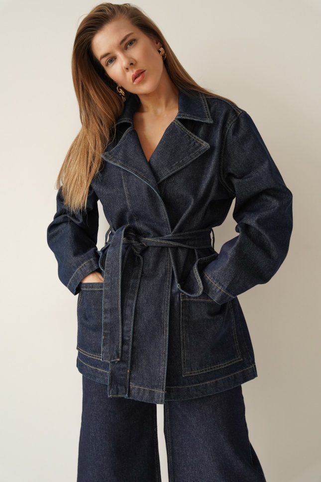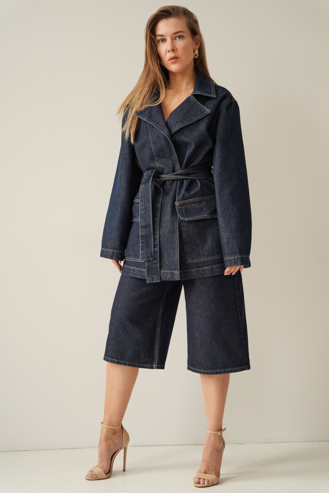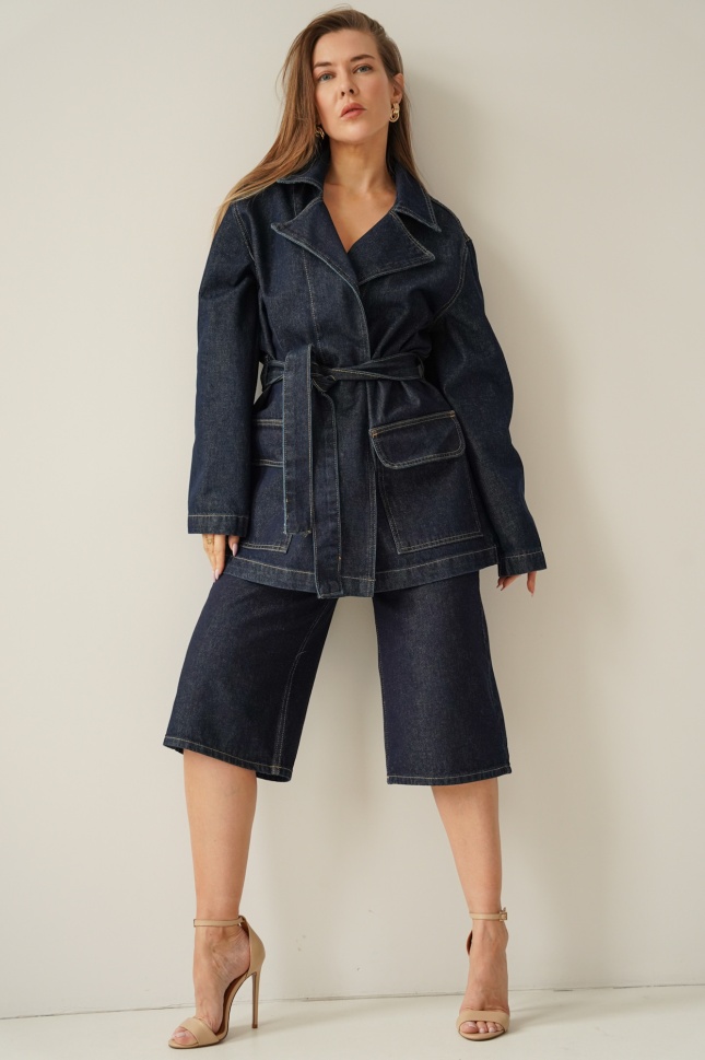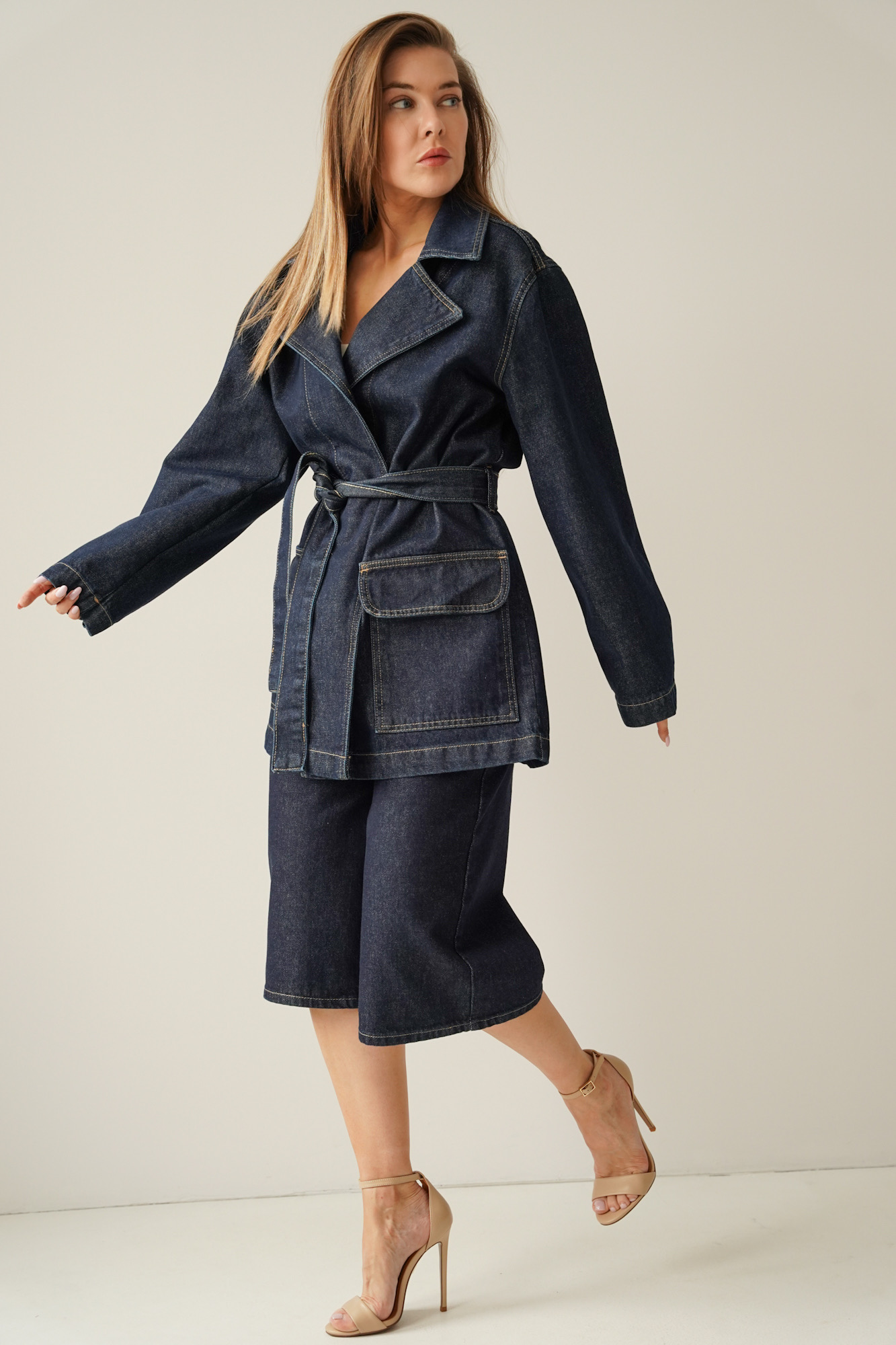 Boulevard Chic is a stylish denim set made of 100% cotton denim in a classic dark shade. The jacket, tied with a belt at the waist, allows you to shape your figure, while the Bermuda shorts with a refined leg line create a modern, elegant form. A timeless total look that you can wear together or separately – from casual styles to more sophisticated outfits.