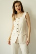 Megan is an elegant ensemble comprising a longer waistcoat with wide straps and a diamond-patterned neckline, paired with creased trousers featuring buttons at the ankles. The design combines classic tailoring with modern details. Perfect for family celebrations and weddings, but also for everyday outfits for those who love an elegant look.