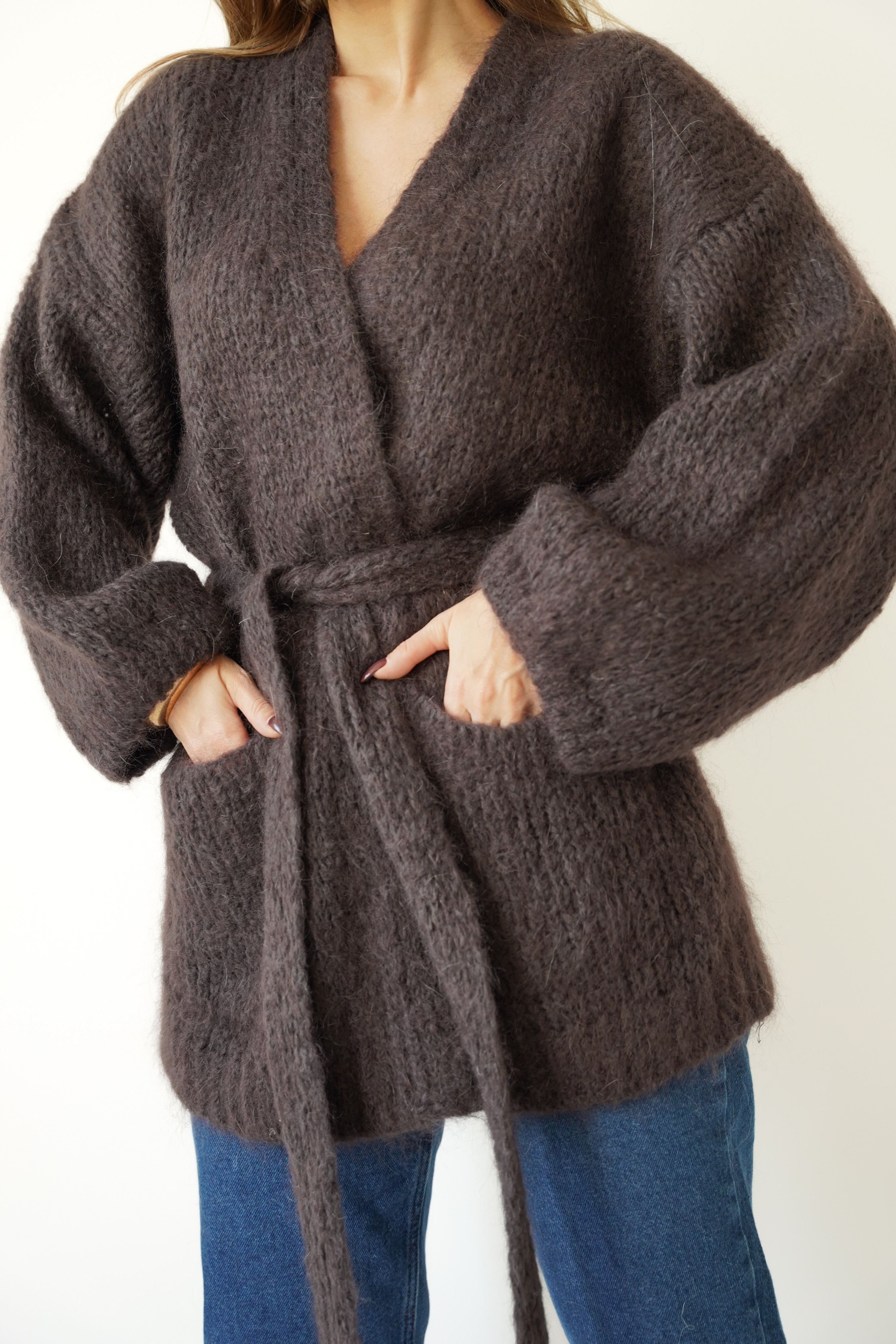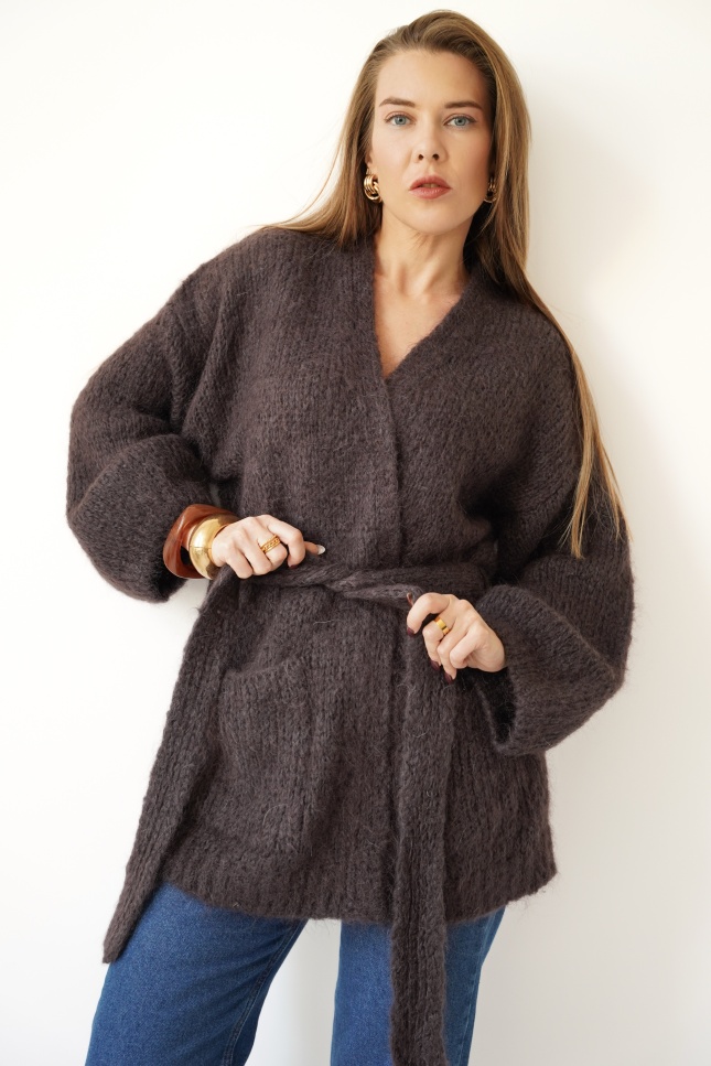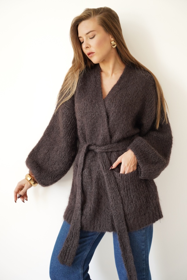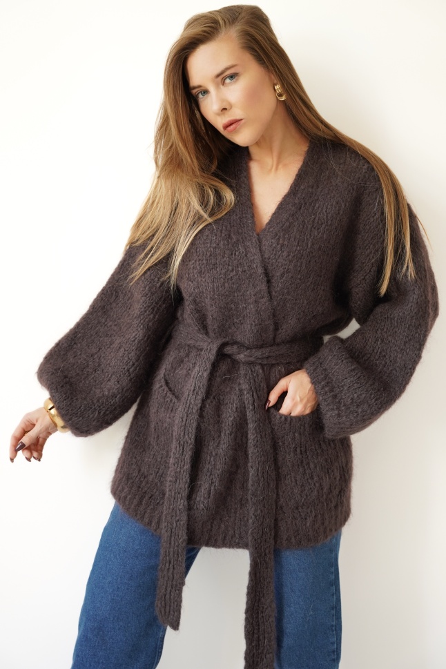 An elegant, timeless cardigan with a tie belt at the waist that emphasizes the figure and adds a feminine touch to any outfit. Made of natural yarn with mohair, kid mohair, and wool, it delights with its softness, fluffy texture, and lightness. Two practical pockets and ribbed cuffs complete the look in the spirit of functional elegance.