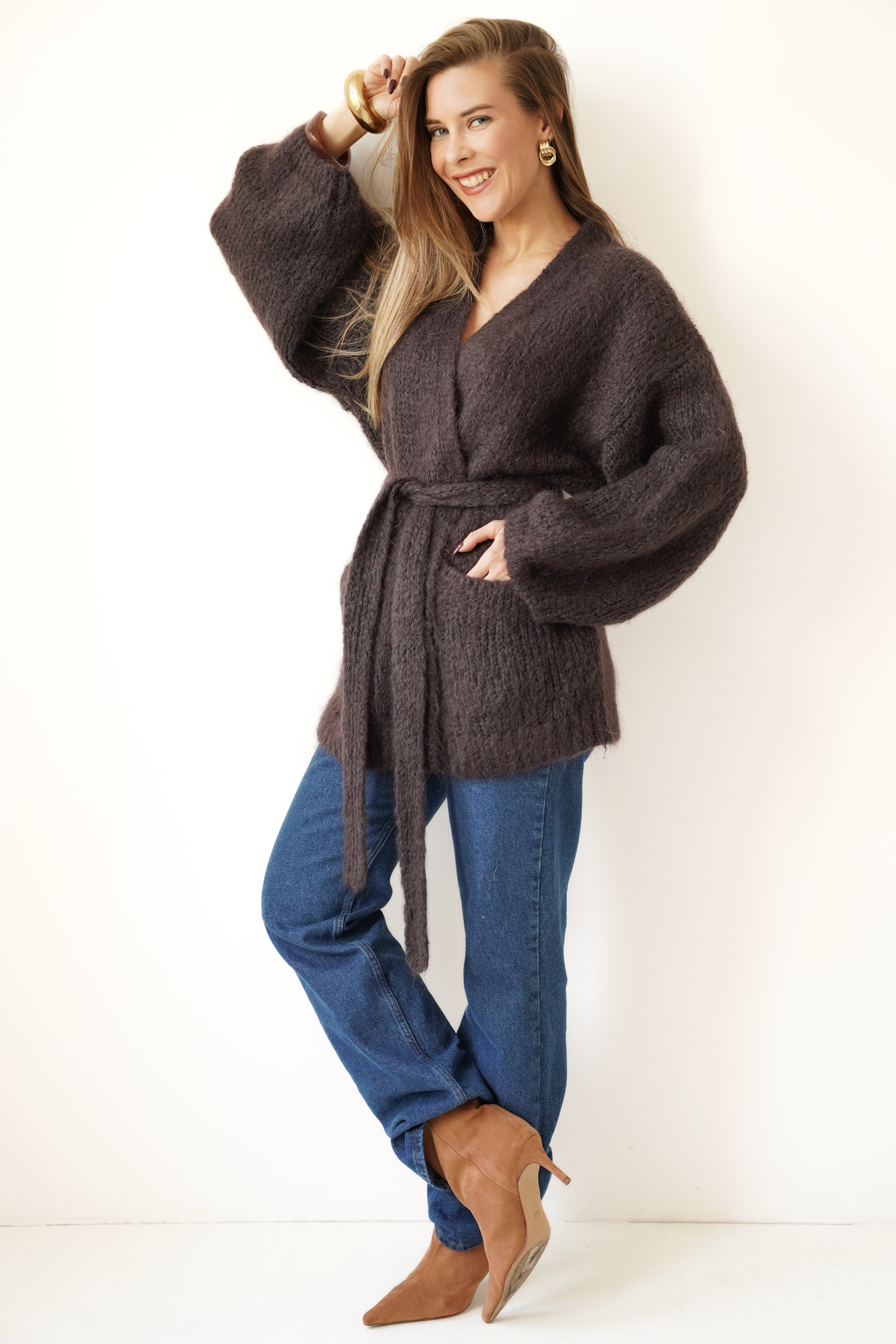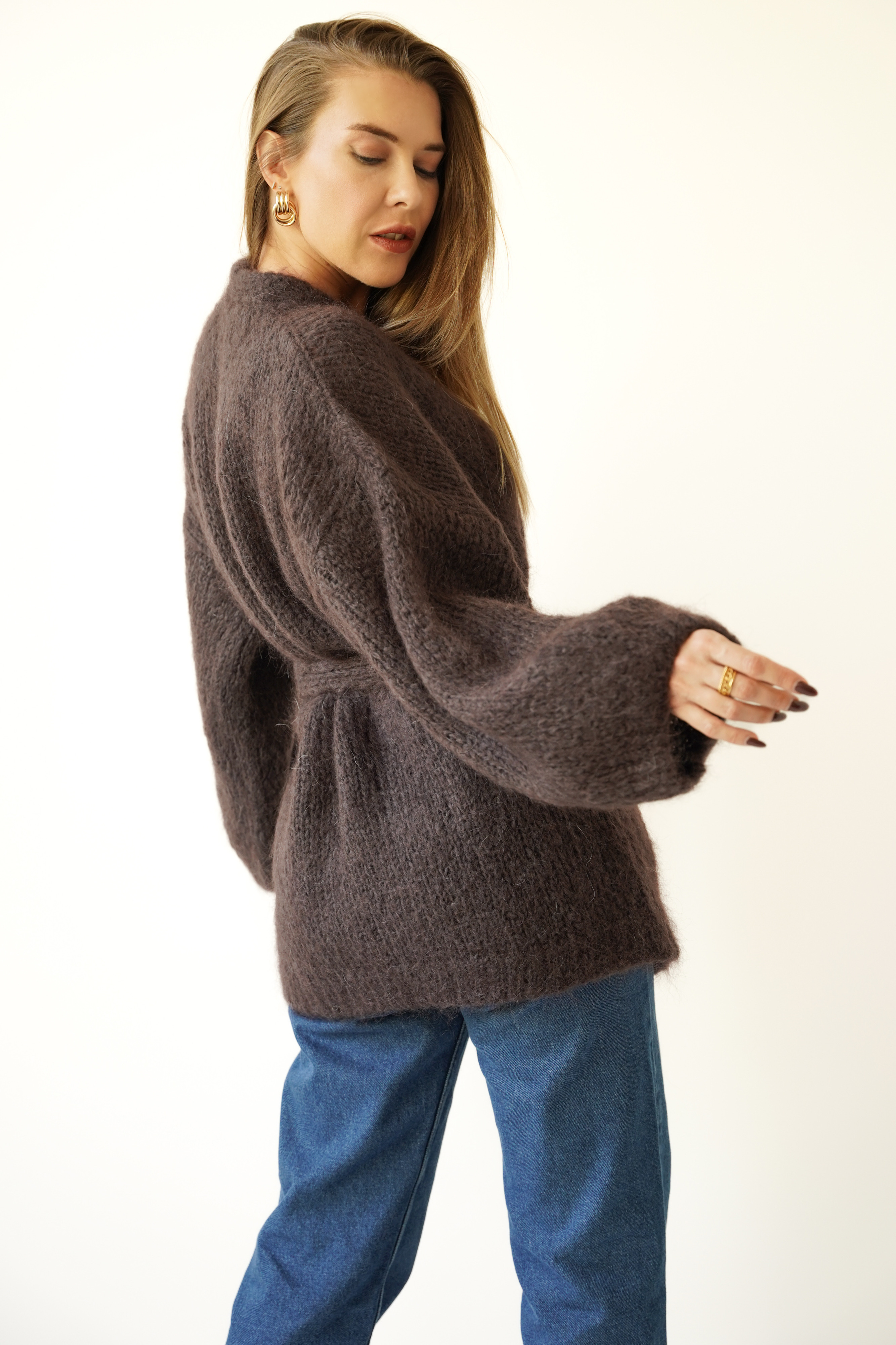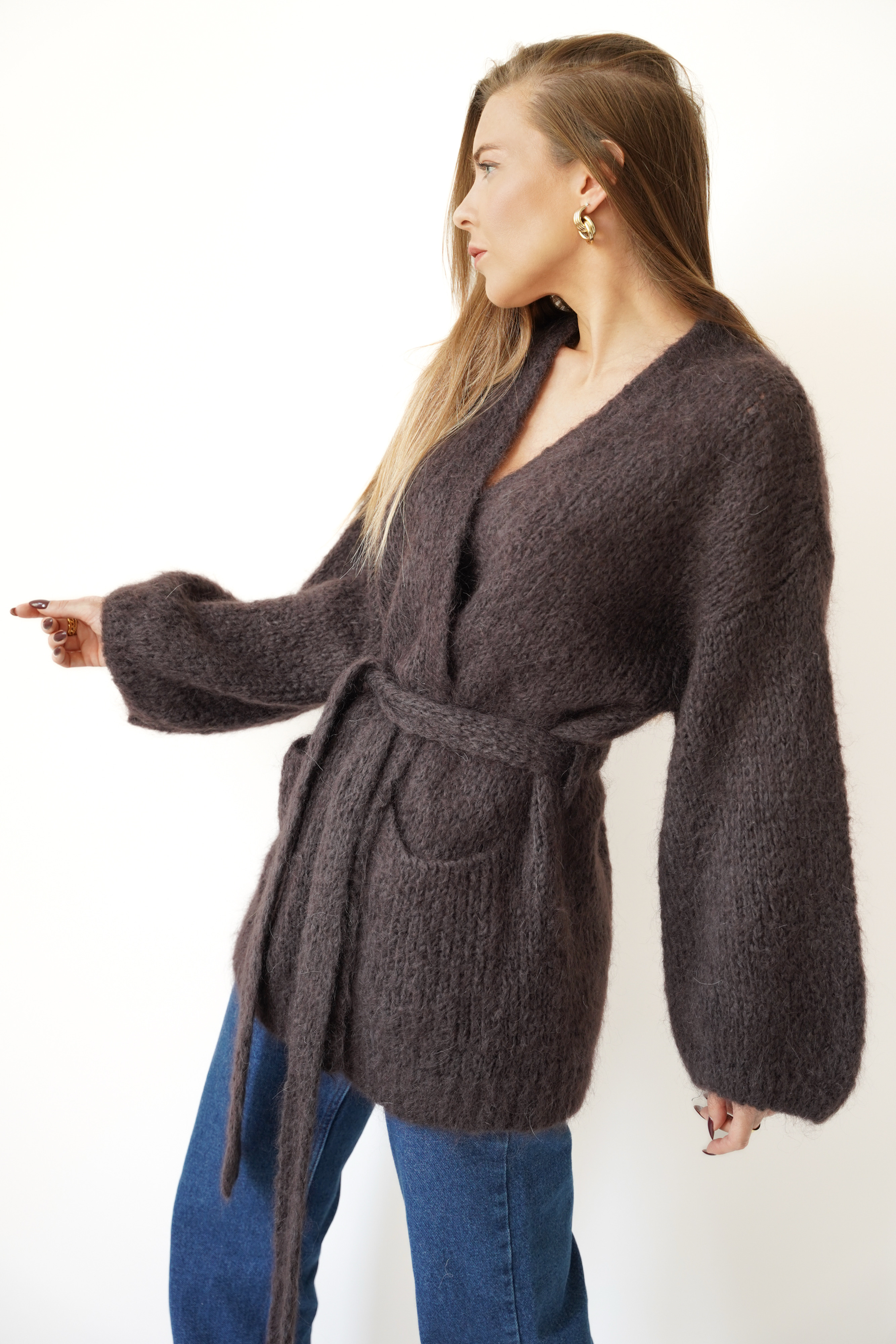 An elegant, timeless cardigan with a tie belt at the waist that emphasizes the figure and adds a feminine touch to any outfit. Made of natural yarn with mohair, kid mohair, and wool, it delights with its softness, fluffy texture, and lightness. Two practical pockets and ribbed cuffs complete the look in the spirit of functional elegance.