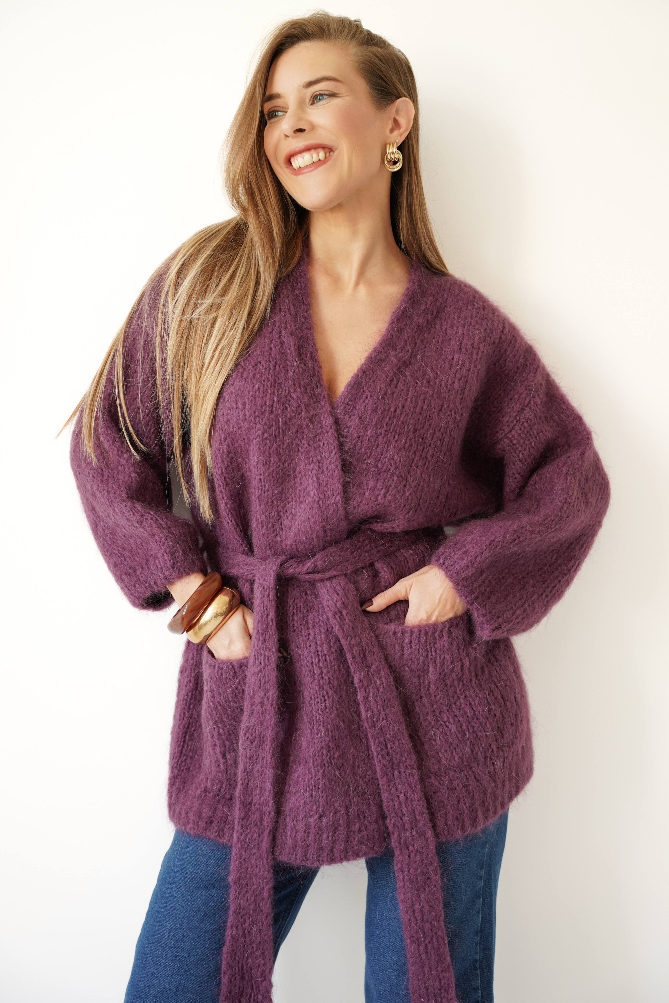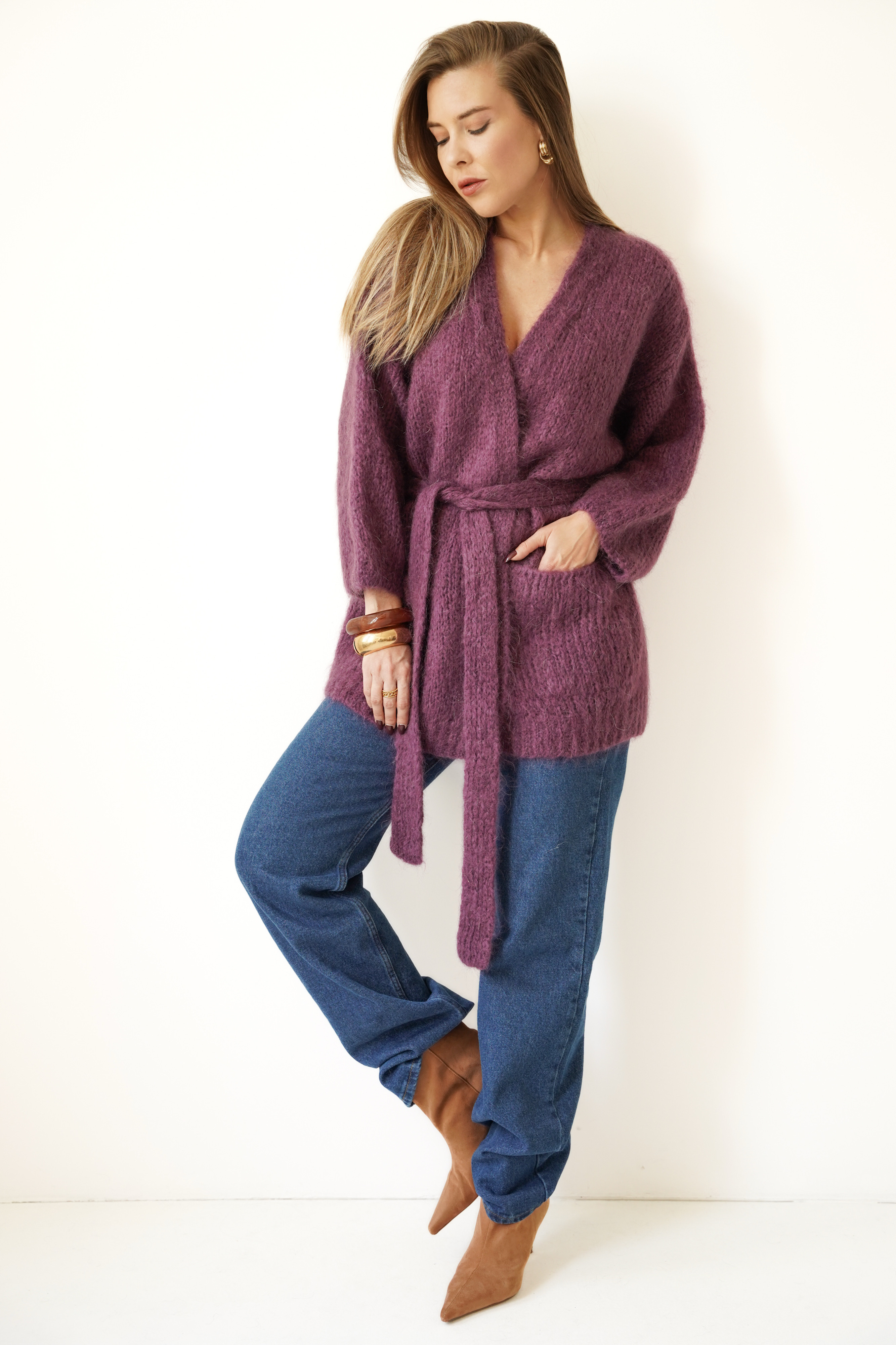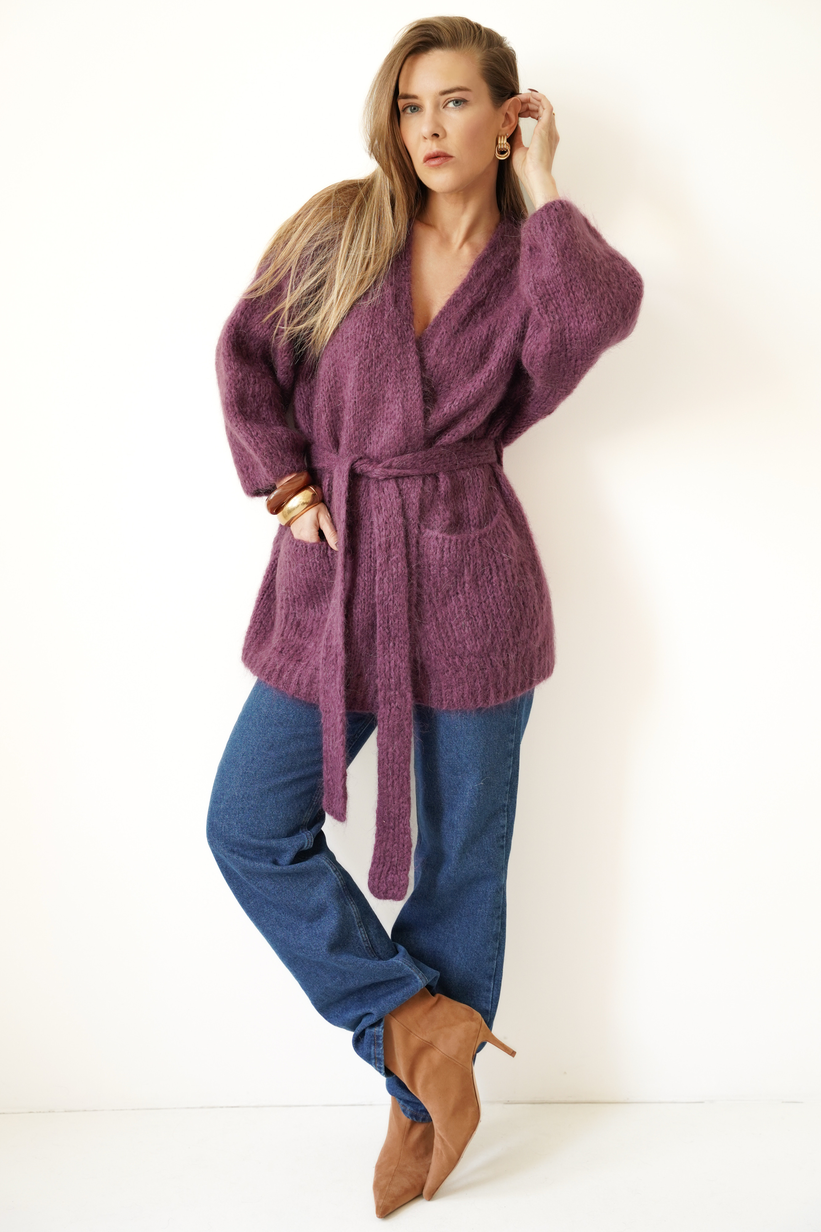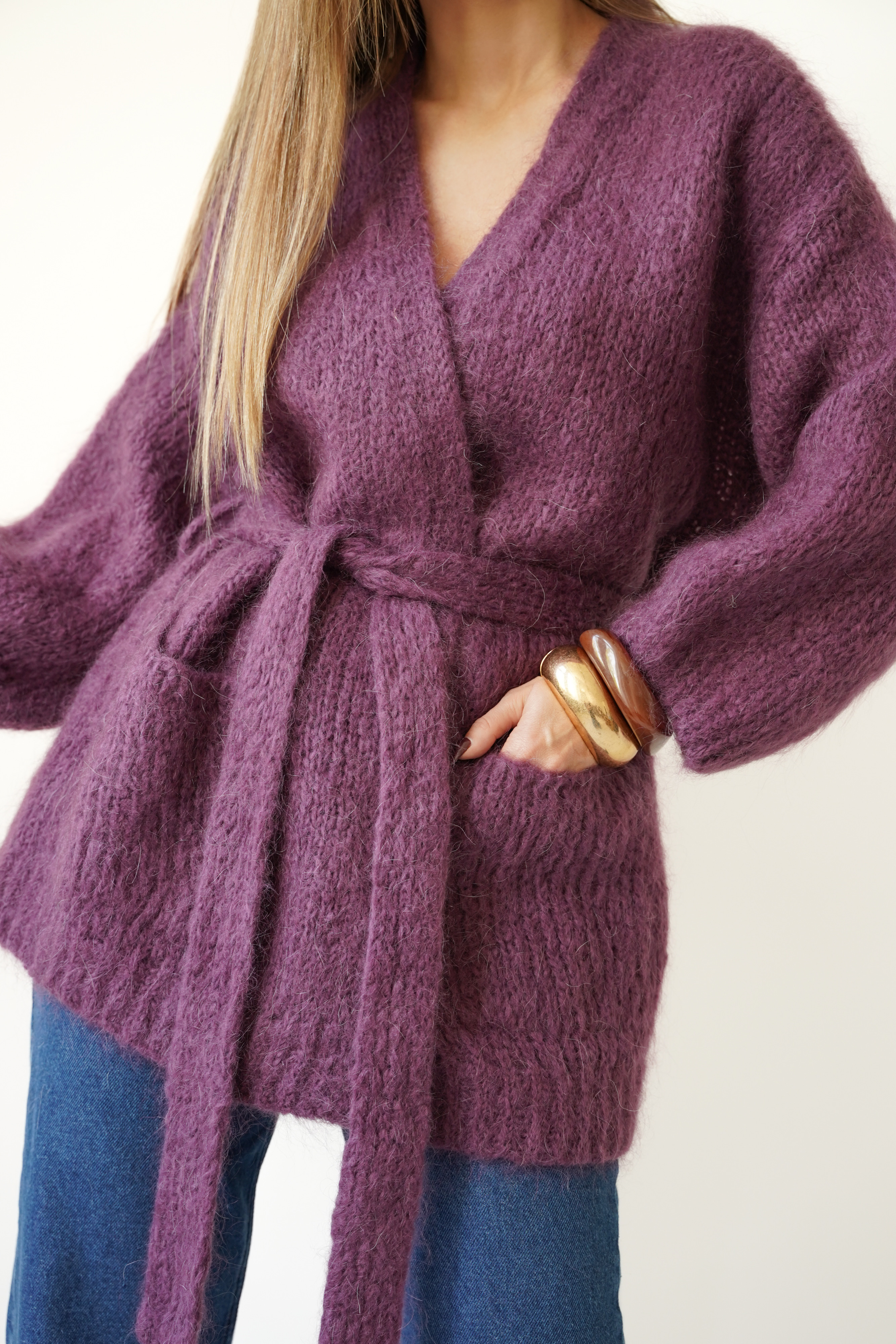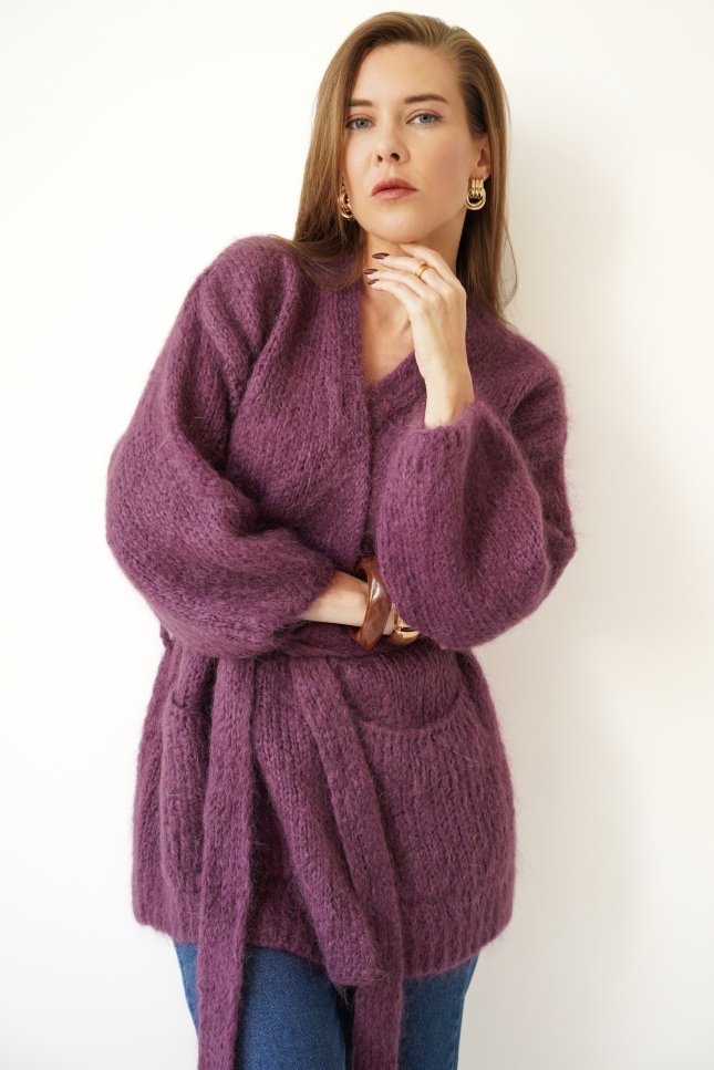 An elegant, timeless cardigan with a tie belt at the waist that emphasizes the figure and adds a feminine touch to any outfit. Made of natural yarn with mohair, kid mohair, and wool, it delights with its softness, fluffy texture, and lightness. Two practical pockets and ribbed cuffs complete the look in the spirit of functional elegance.