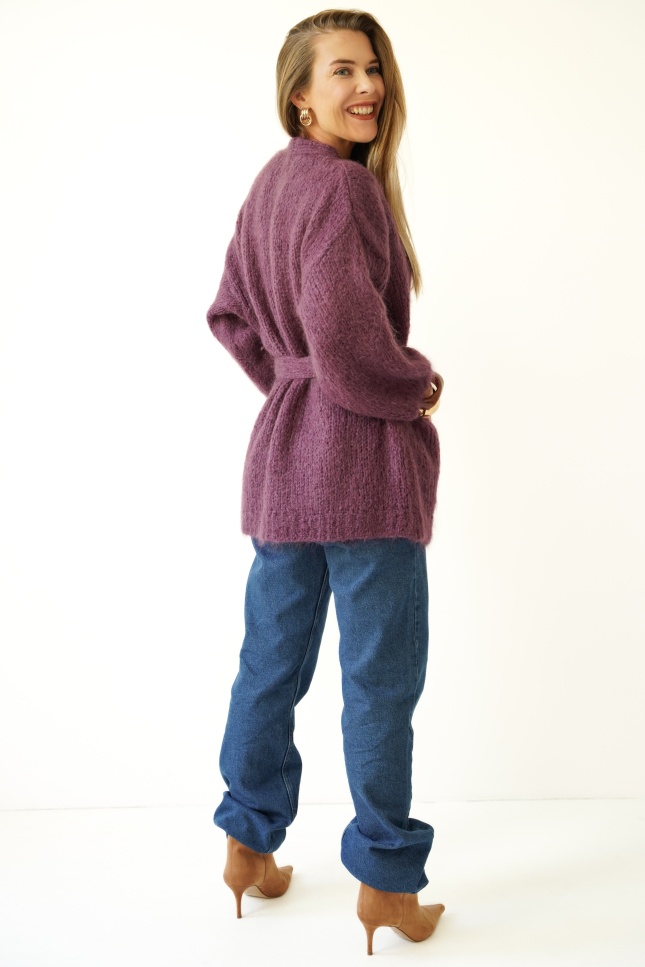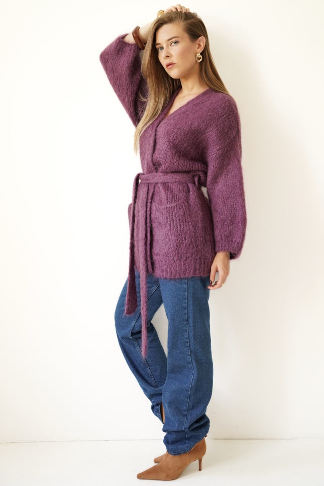 Elegant cardigan with pockets, tied at the waist Mirelle plum