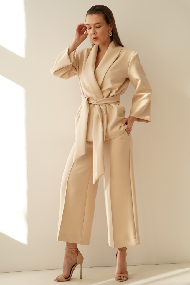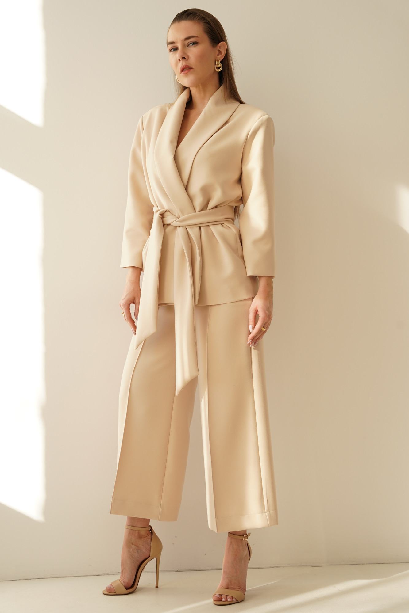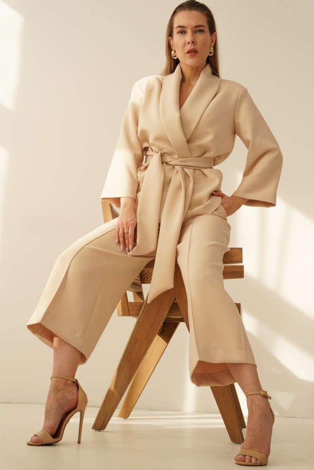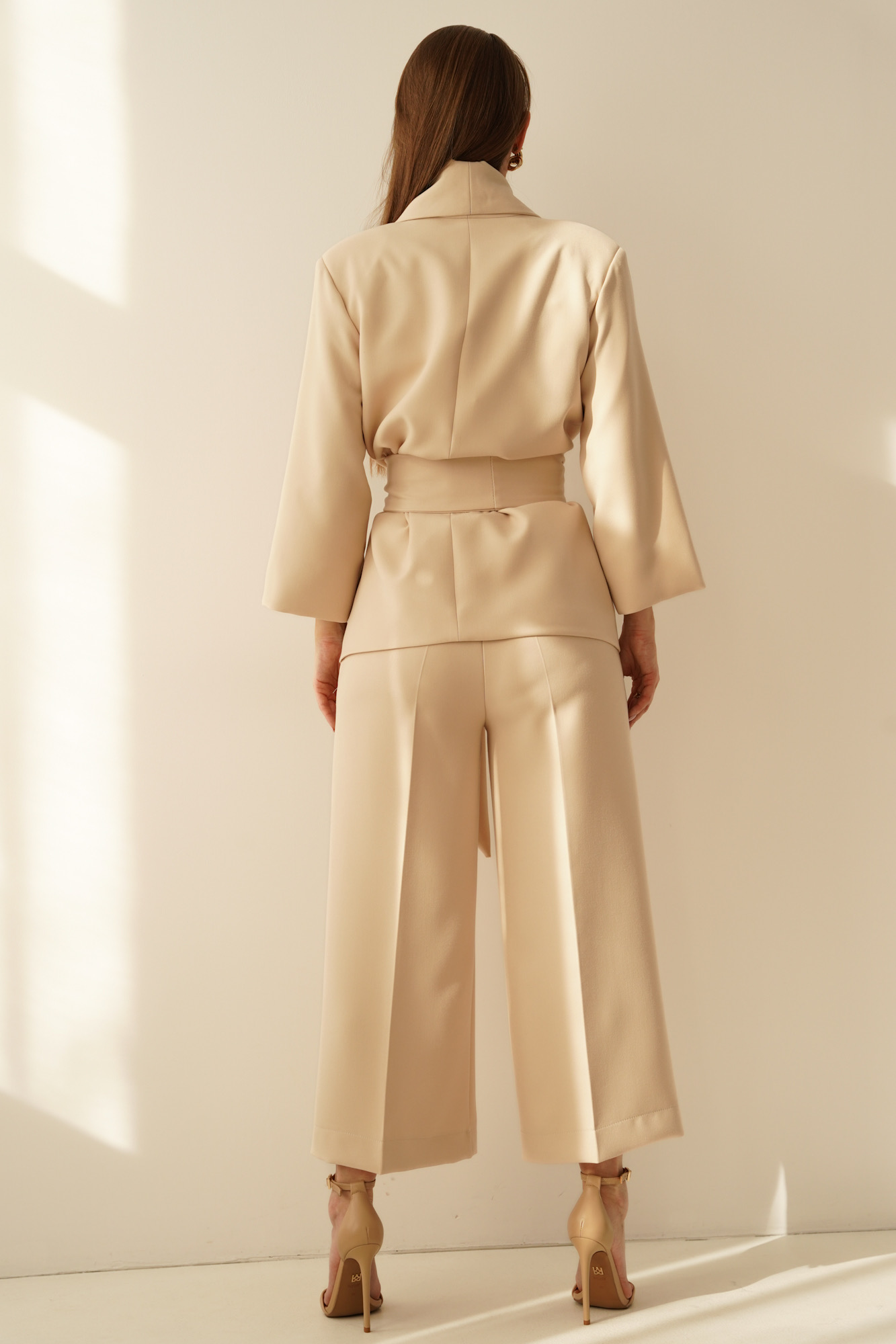 An elegant, feminine set consisting of a belted jacket and culotte pants with creases. Made of high-quality suit fabric with 72% viscose. A stylish balance between elegance and casual. Perfect for everyday wear, work, and evening occasions.