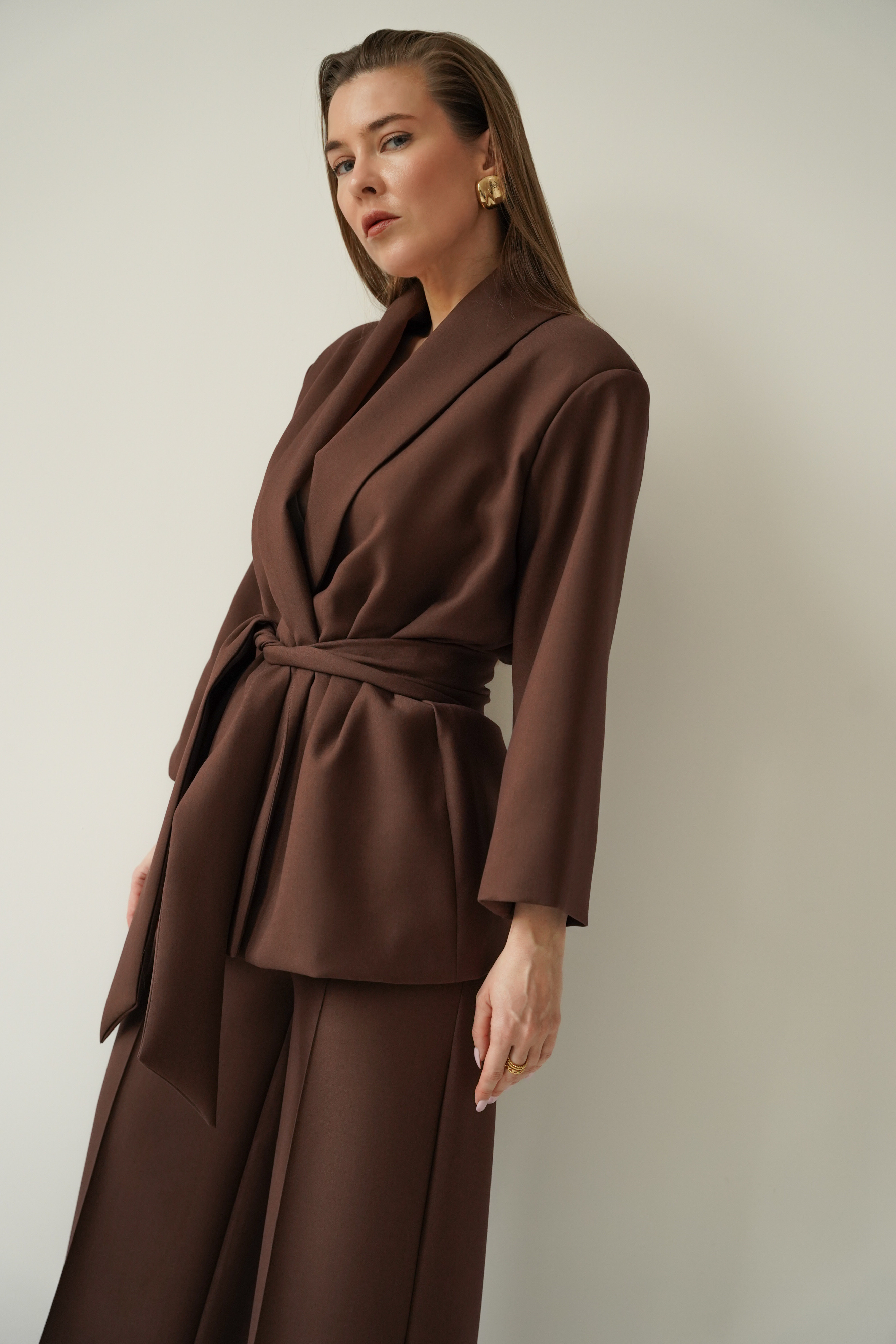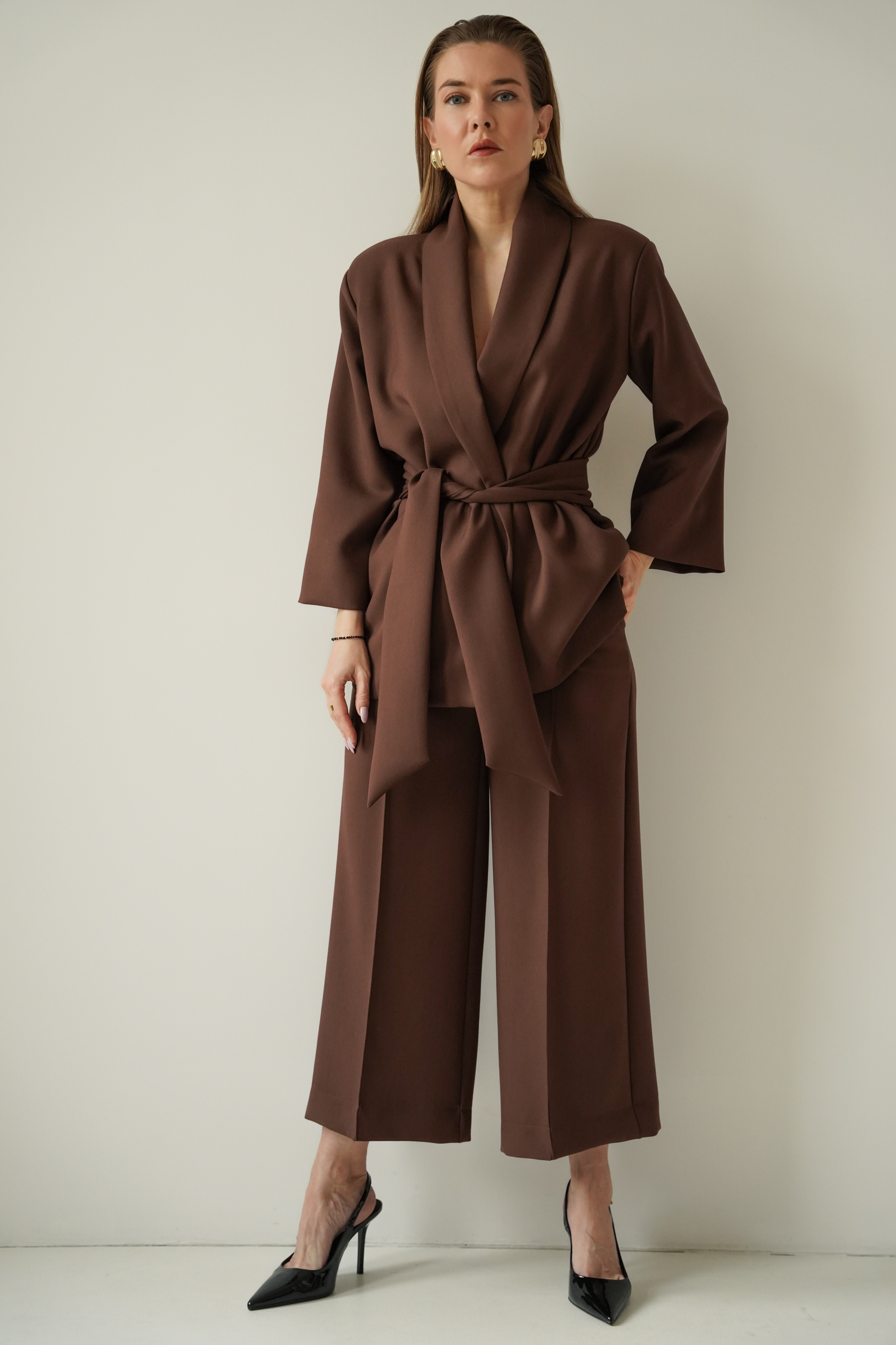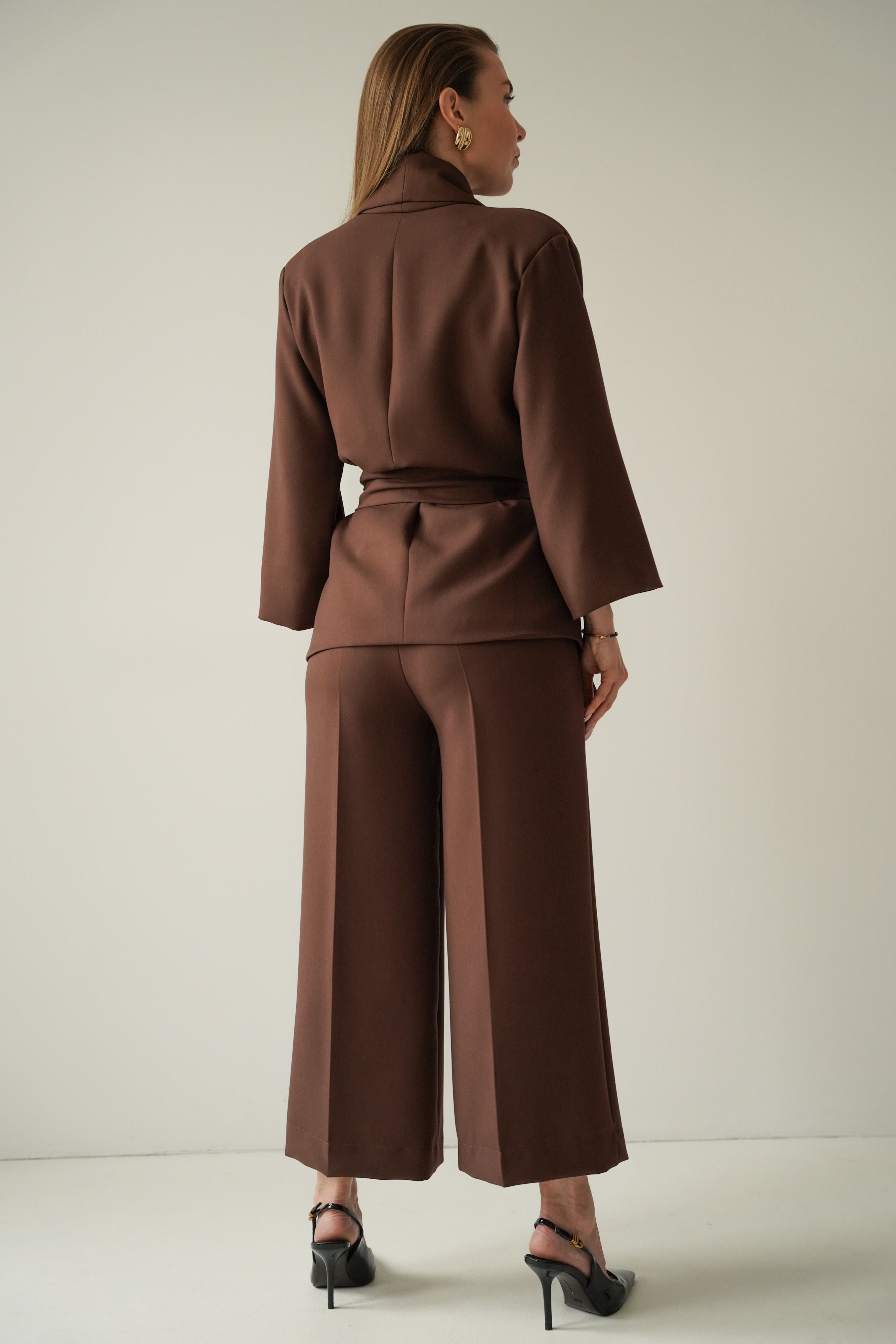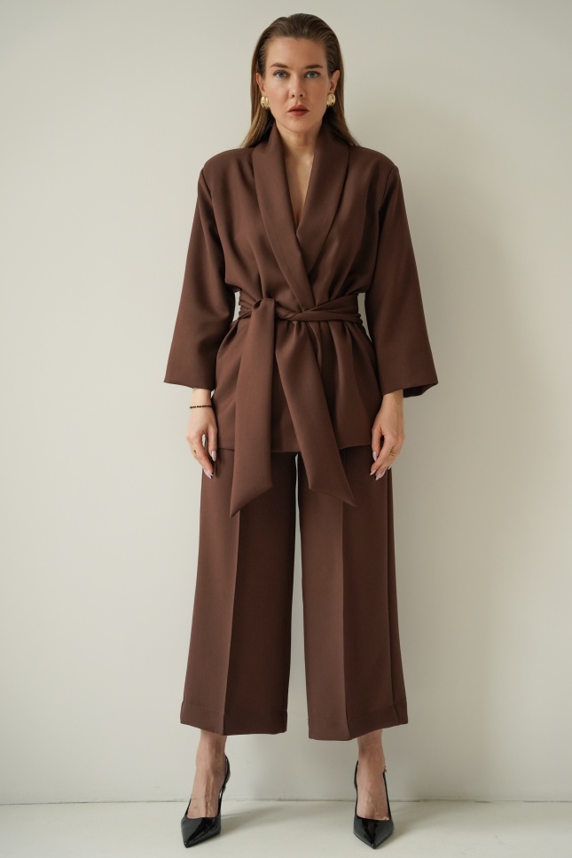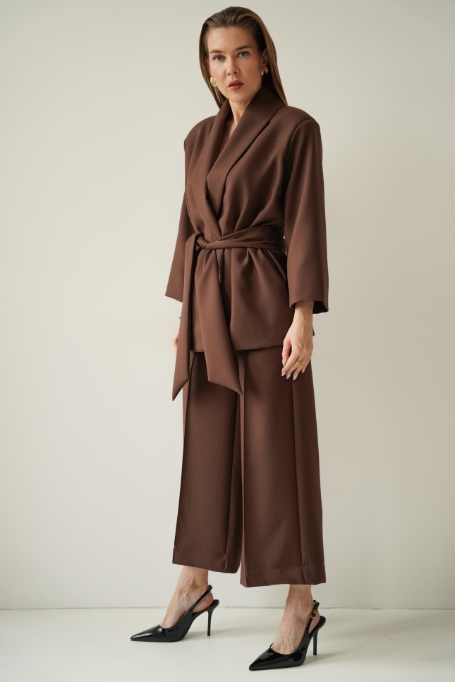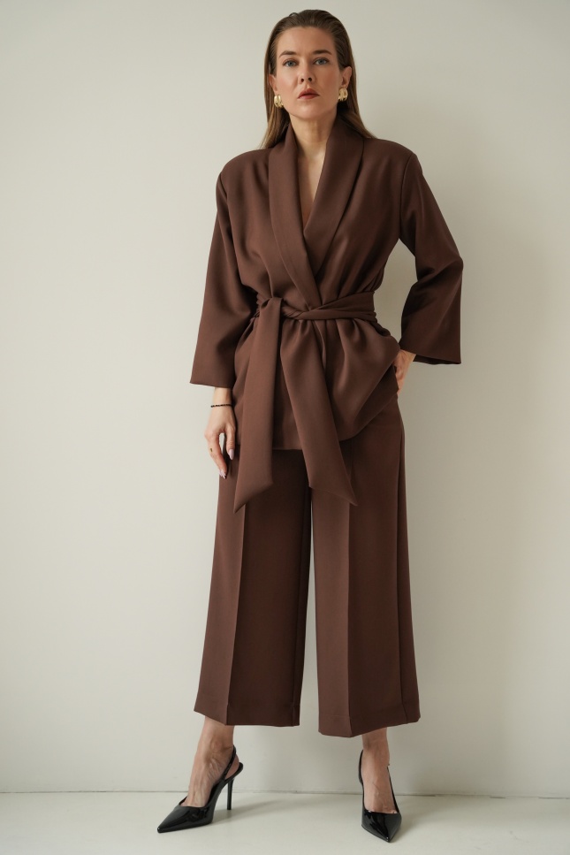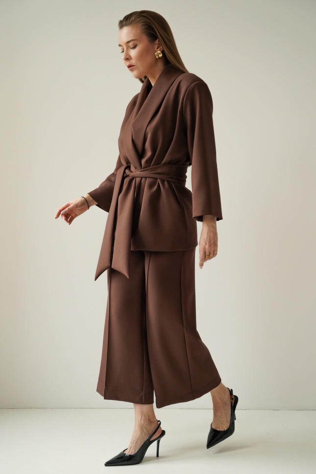 An elegant, feminine set consisting of a belted jacket and culotte pants with creases. Made of high-quality suit fabric with 72% viscose. A stylish balance between elegance and casual. Perfect for everyday wear, work, and evening occasions.