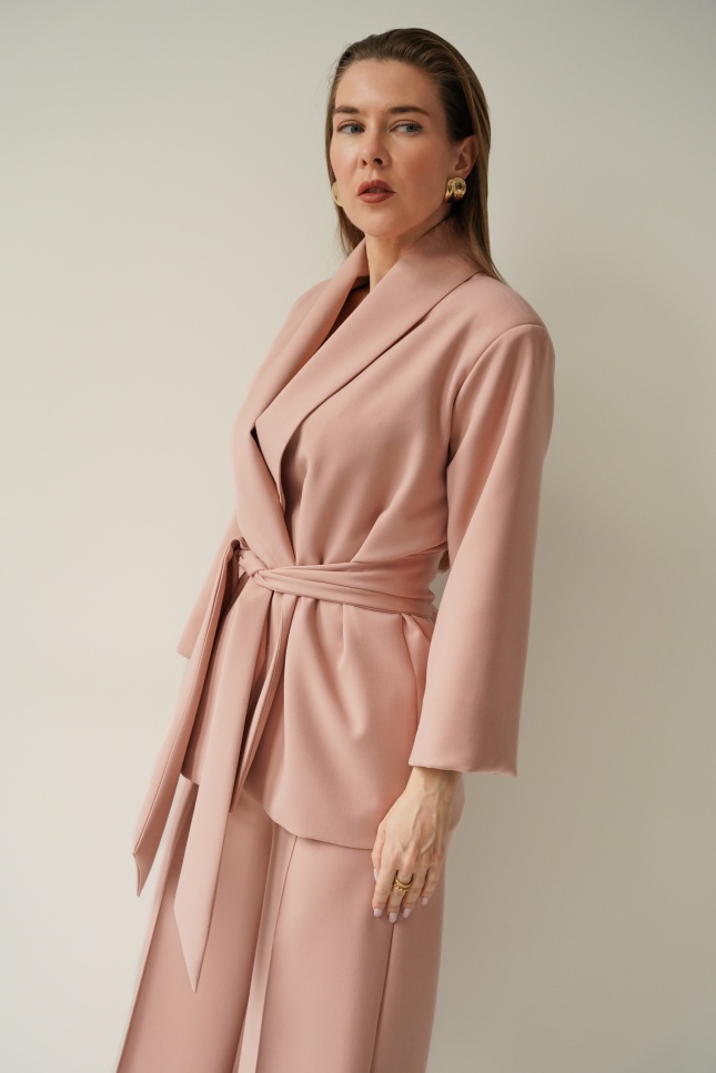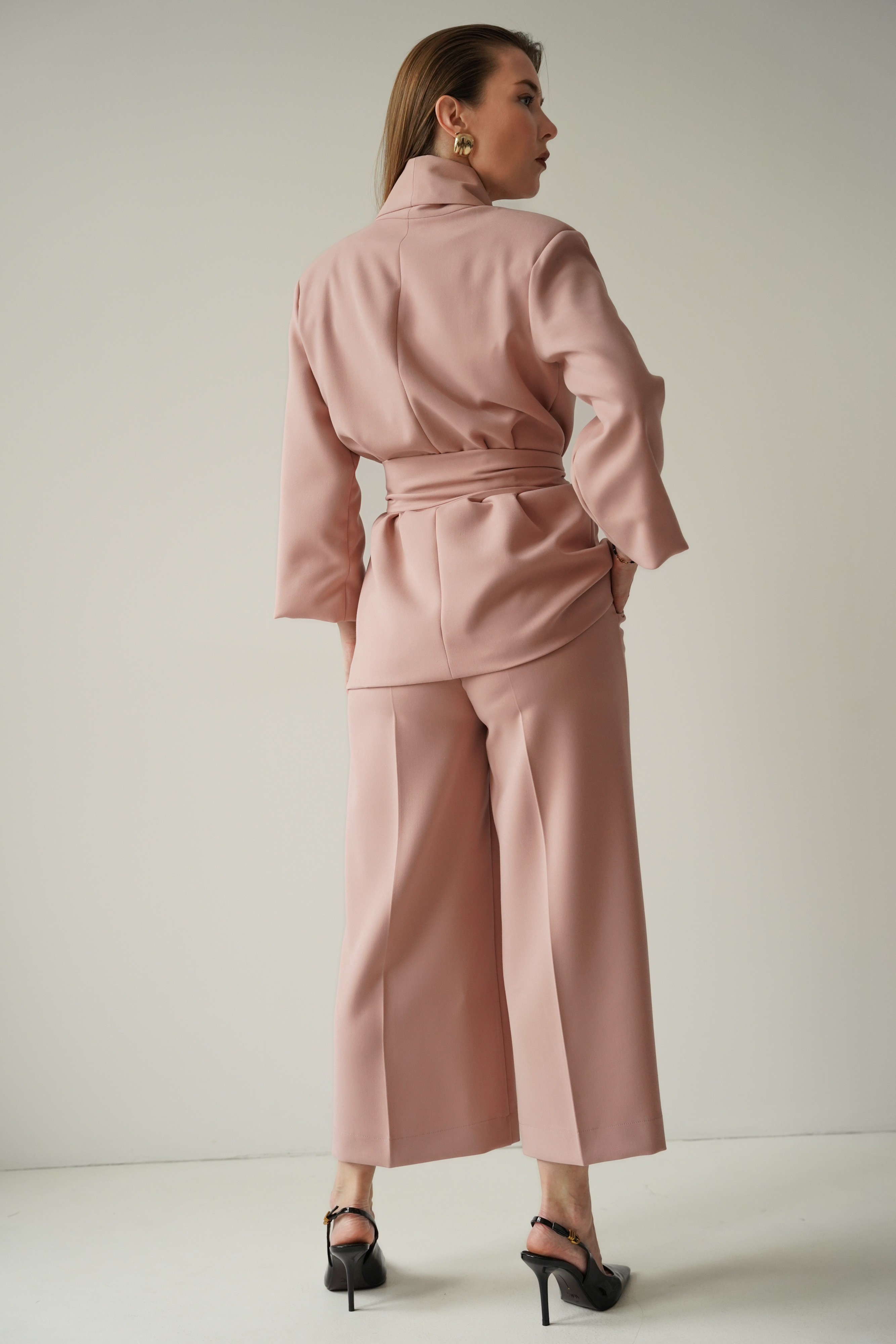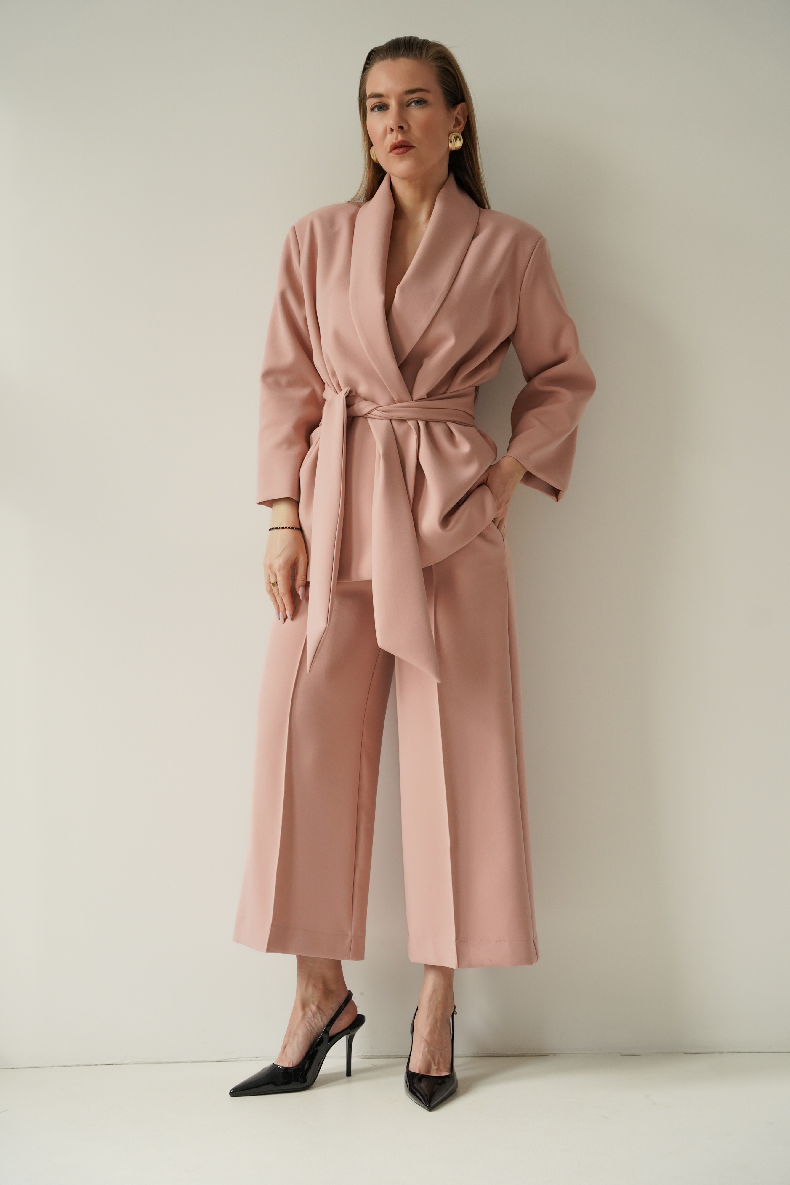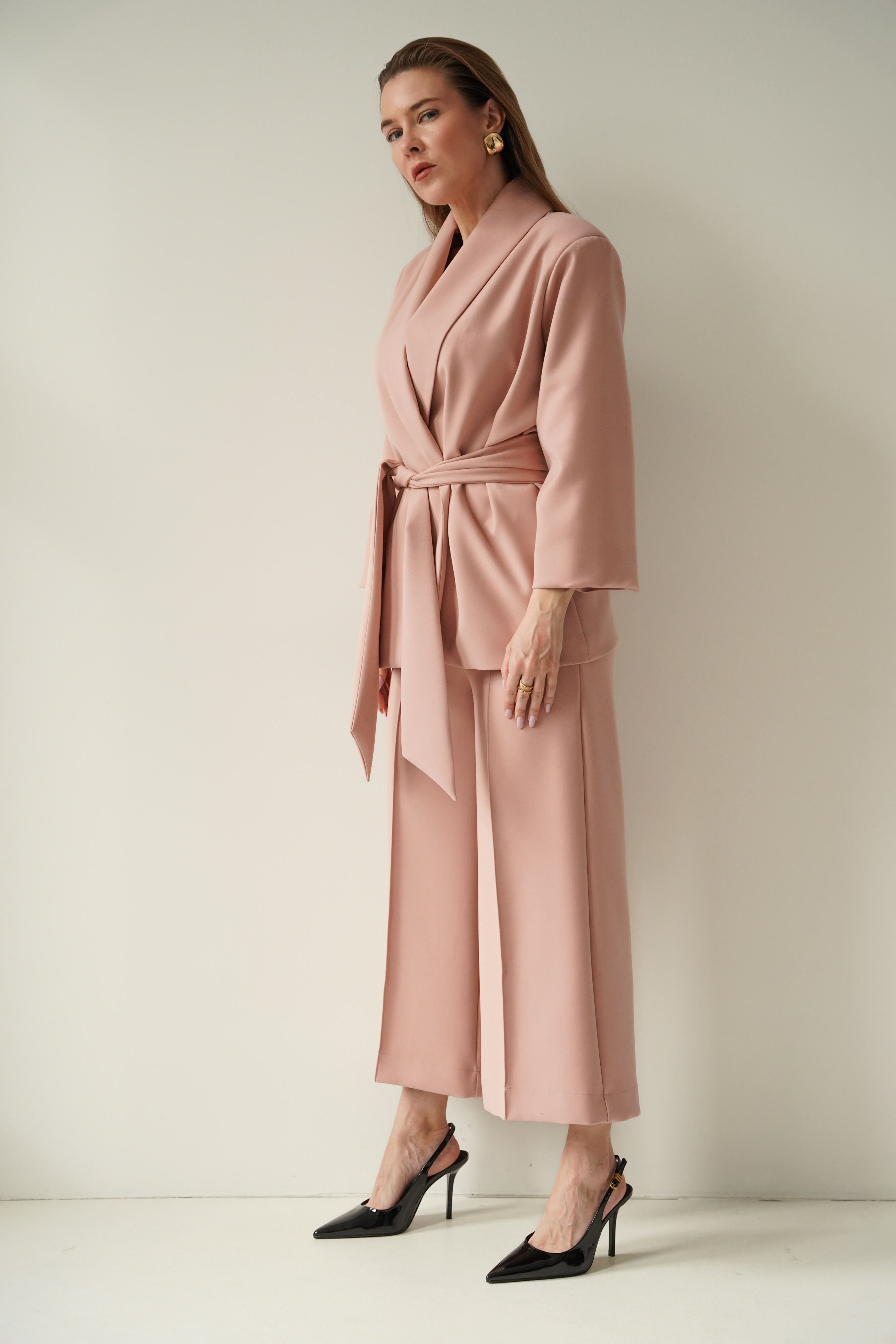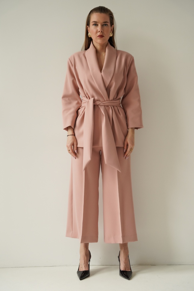 An elegant, feminine set consisting of a belted jacket and culotte pants with creases. Made of high-quality suit fabric with 72% viscose. A stylish balance between elegance and casual. Perfect for everyday wear, work, and evening occasions.