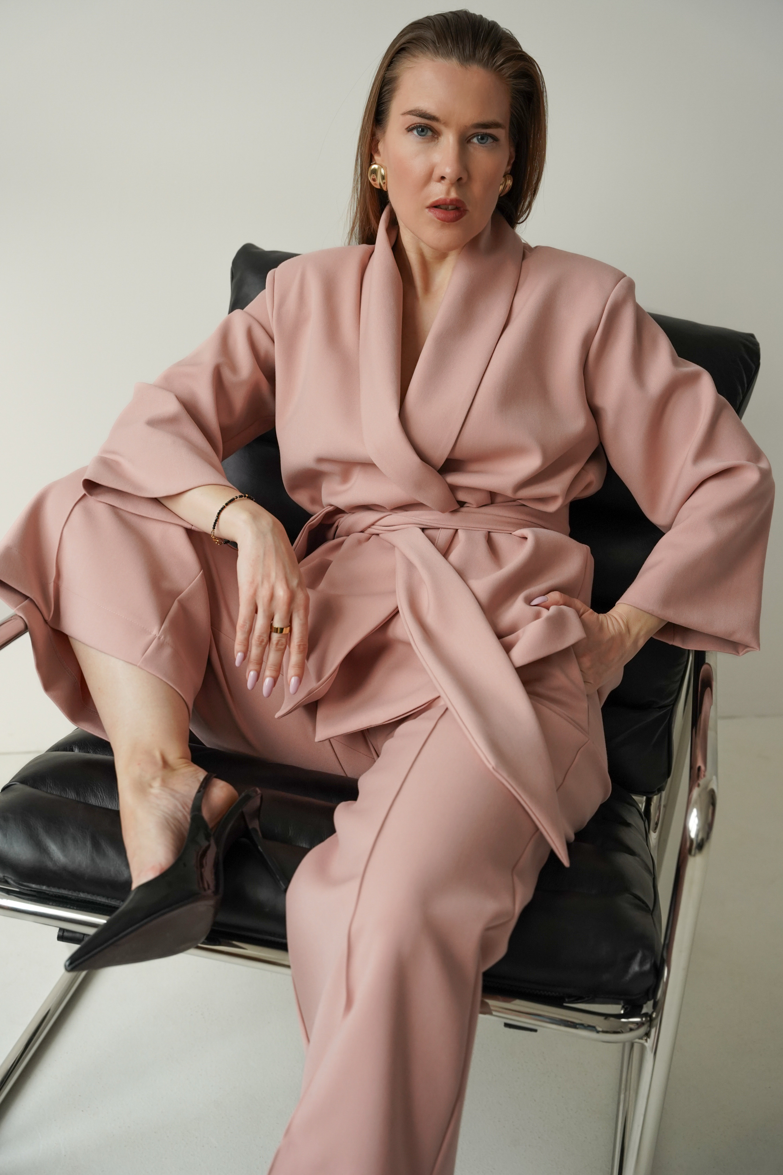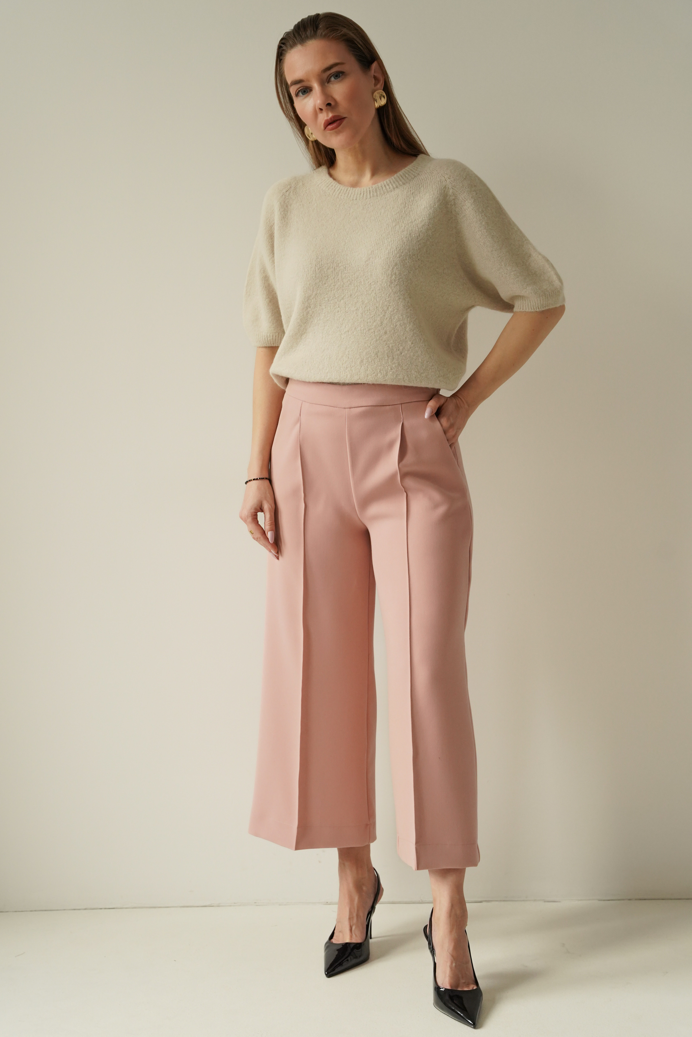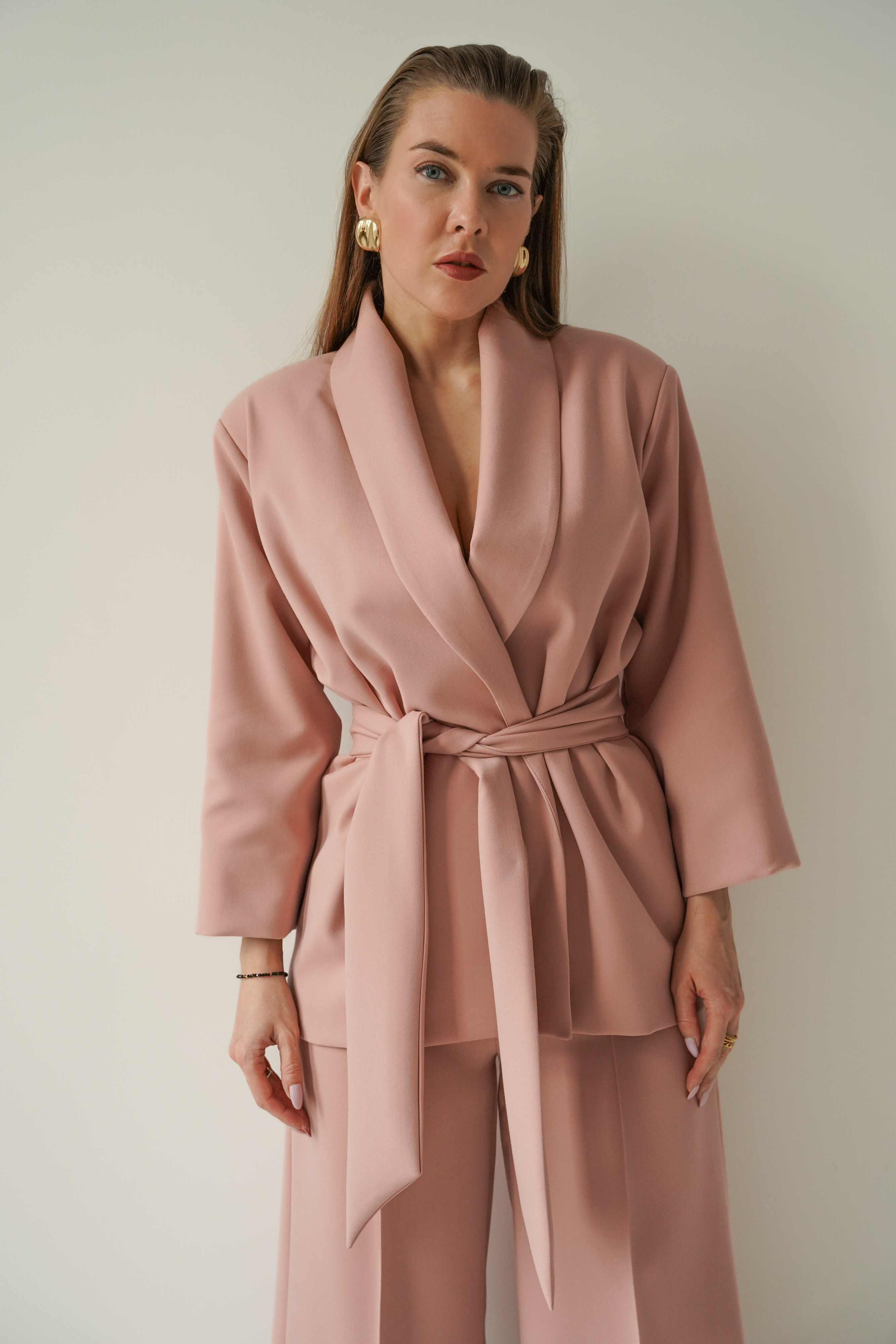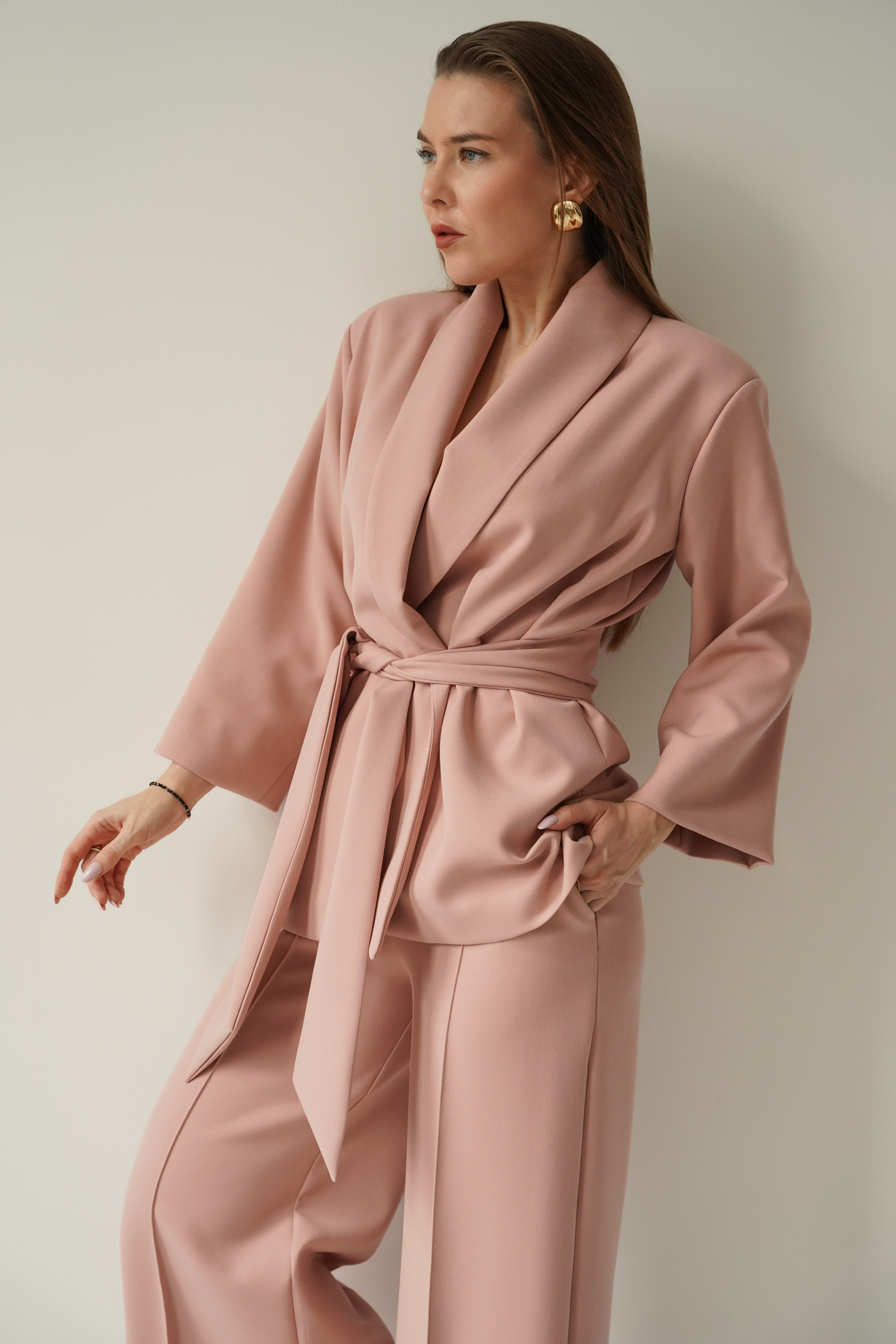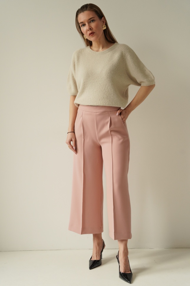 An elegant, feminine set consisting of a belted jacket and culotte pants with creases. Made of high-quality suit fabric with 72% viscose. A stylish balance between elegance and casual. Perfect for everyday wear, work, and evening occasions.