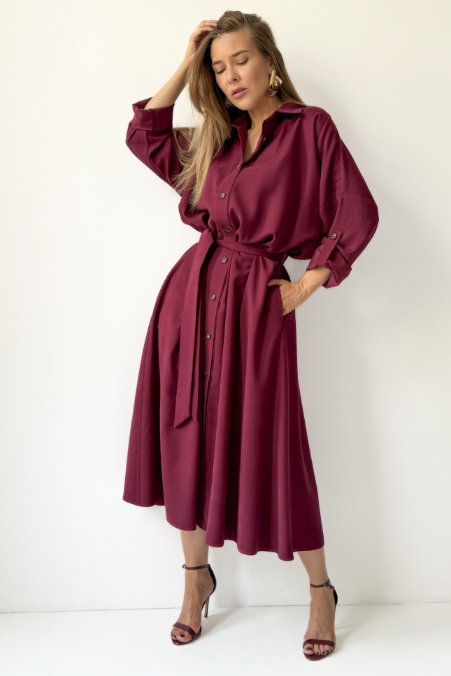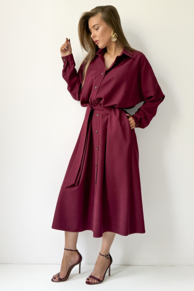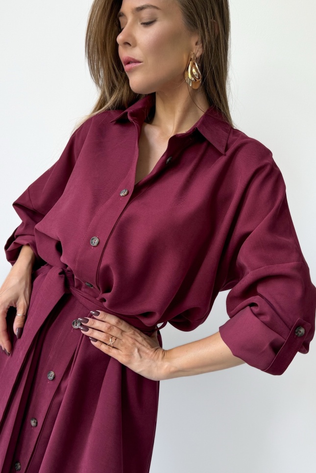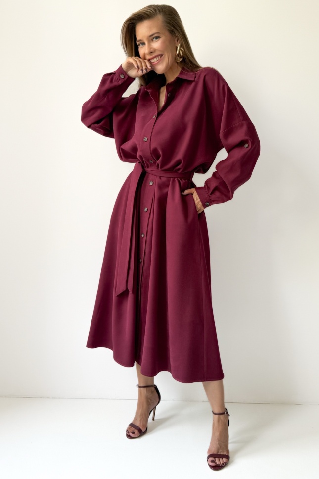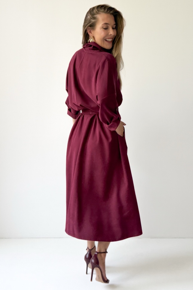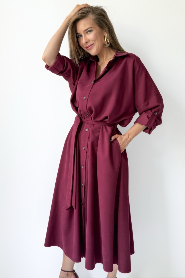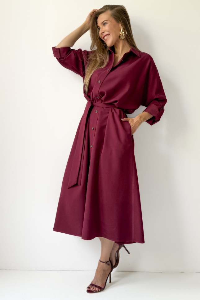 The flared, loose fit ensures freedom of movement, while the belt loops and waistband subtly emphasize the figure. The dress is buttoned all the way down, finished with an elegant collar and cuffs with the option of rolling up the sleeves, maintaining its timeless character. Hidden pockets on the side add a practical dimension – thanks to them, “Elise” is as comfortable as it is stylish.