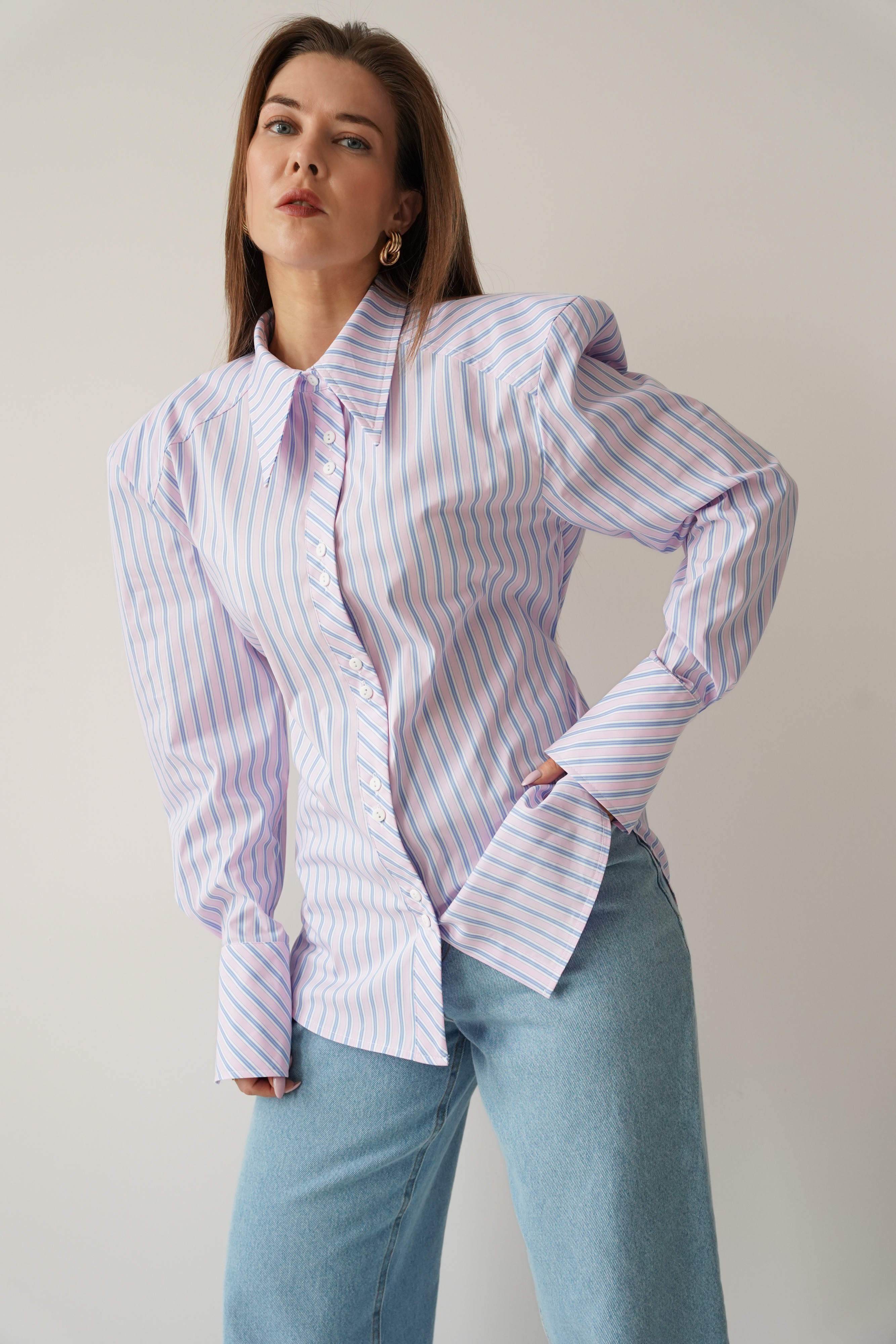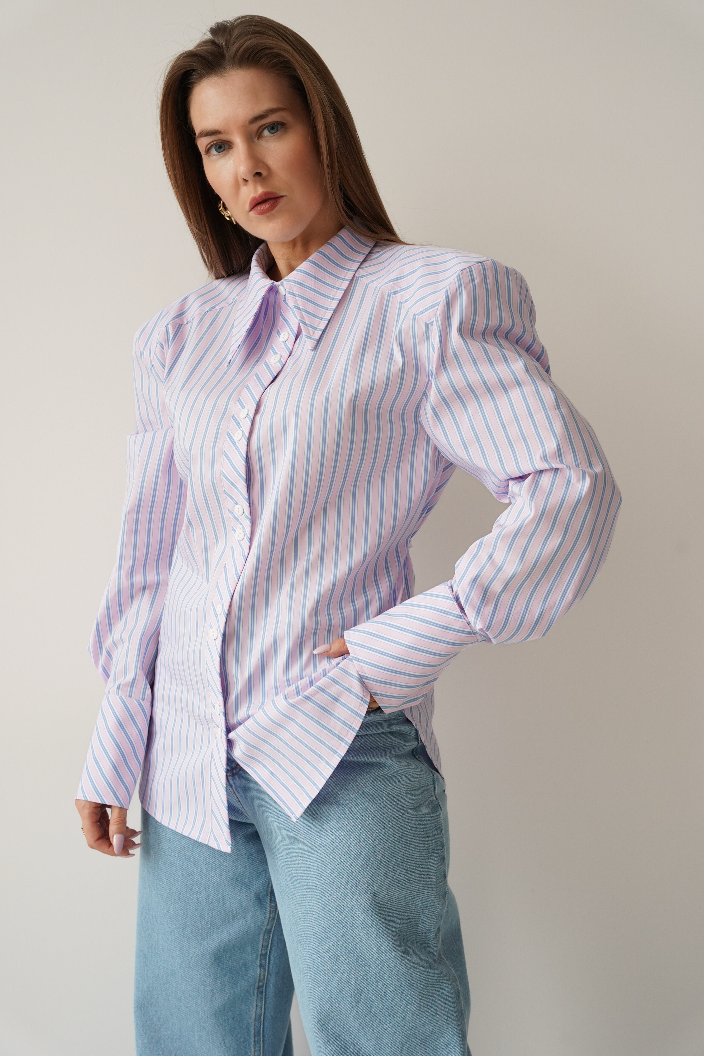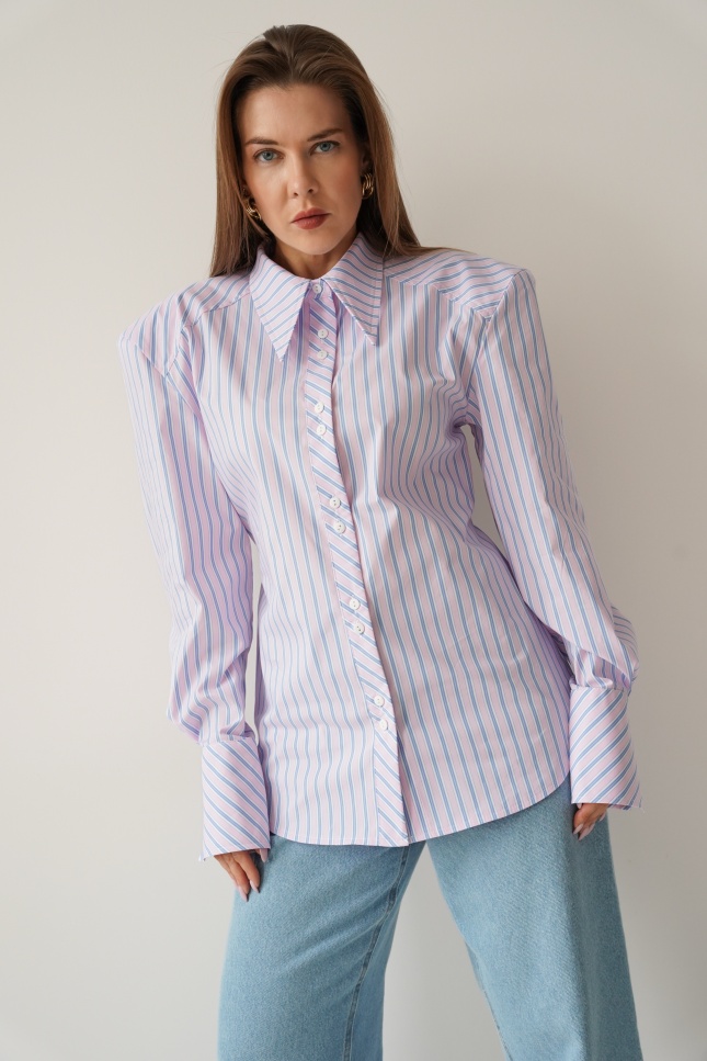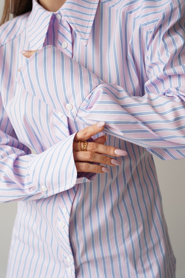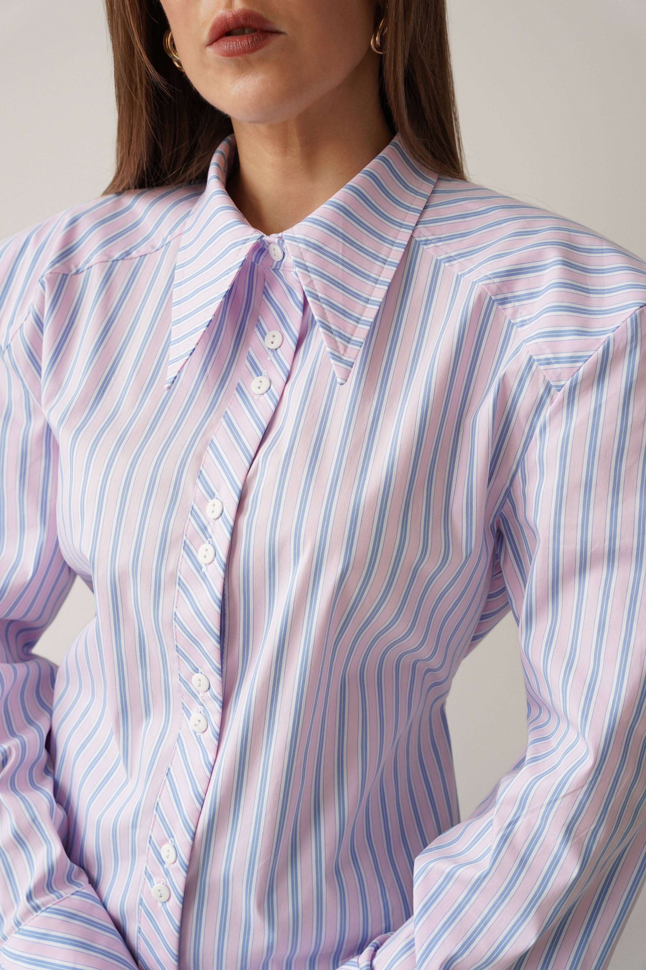 The elegant Allegra shirt is made from a soft blend of cotton and viscose. It has a slightly fitted, longer cut with a waistline and decorative strip that emphasises the waist. The shoulder pads create a modern, slim silhouette. The classic collar, cuffs and buttons complement the minimalist, premium character.