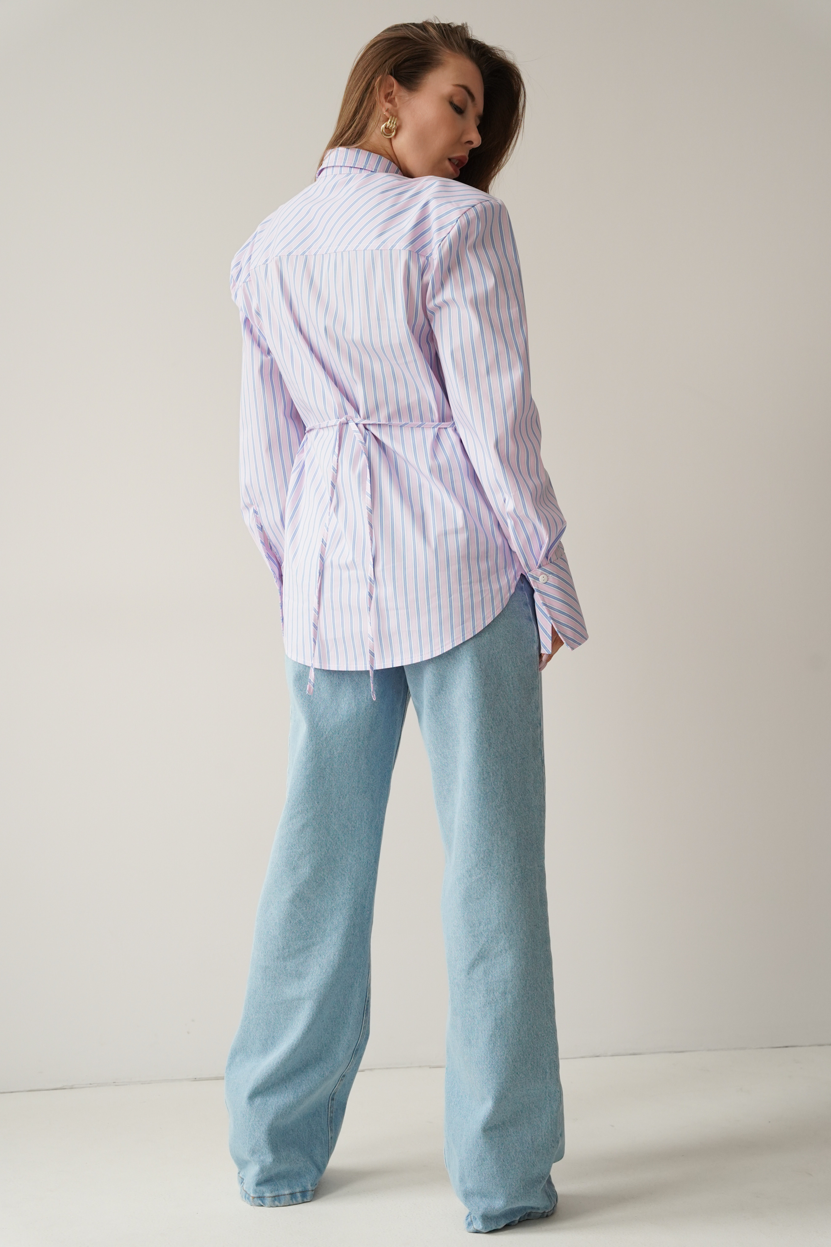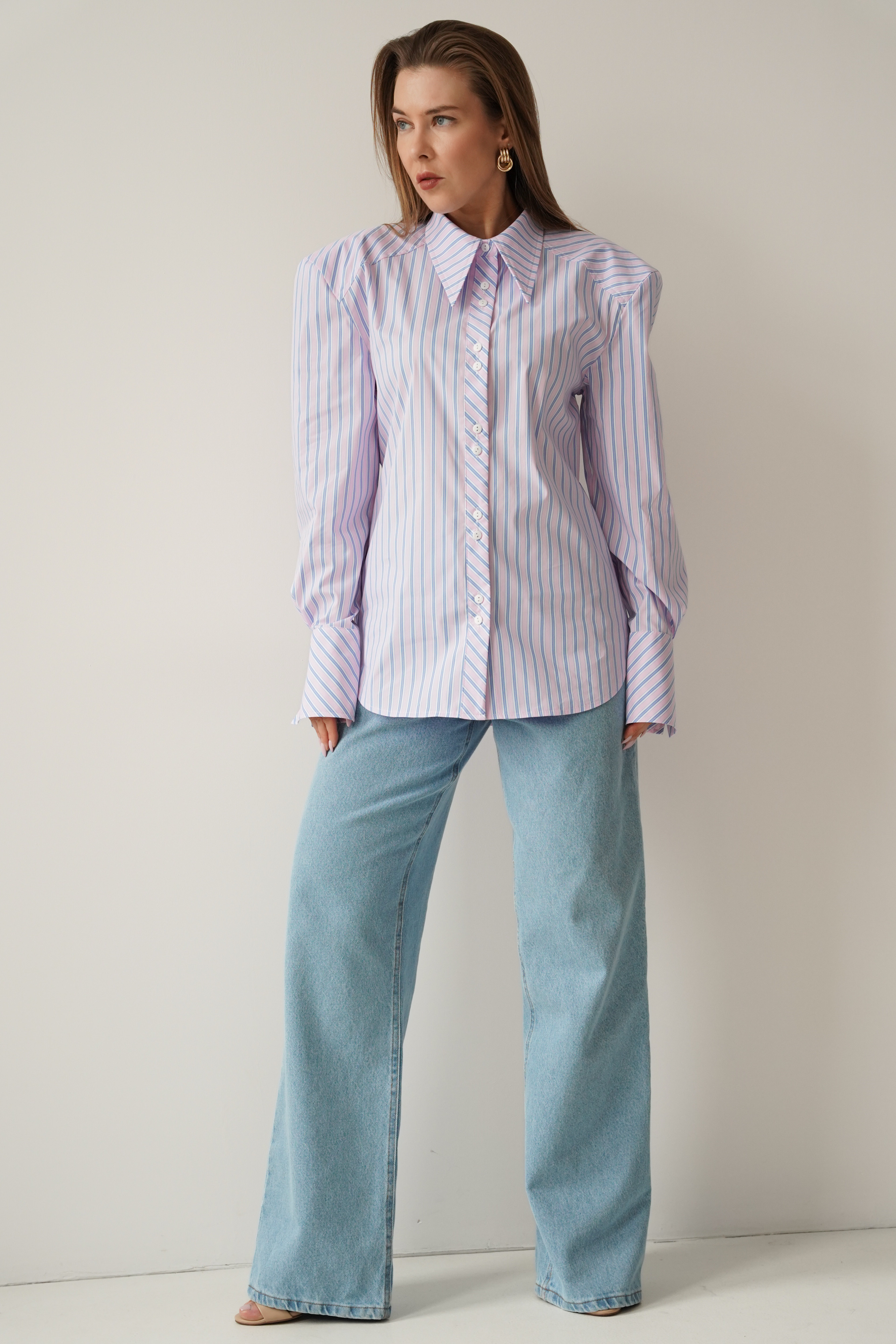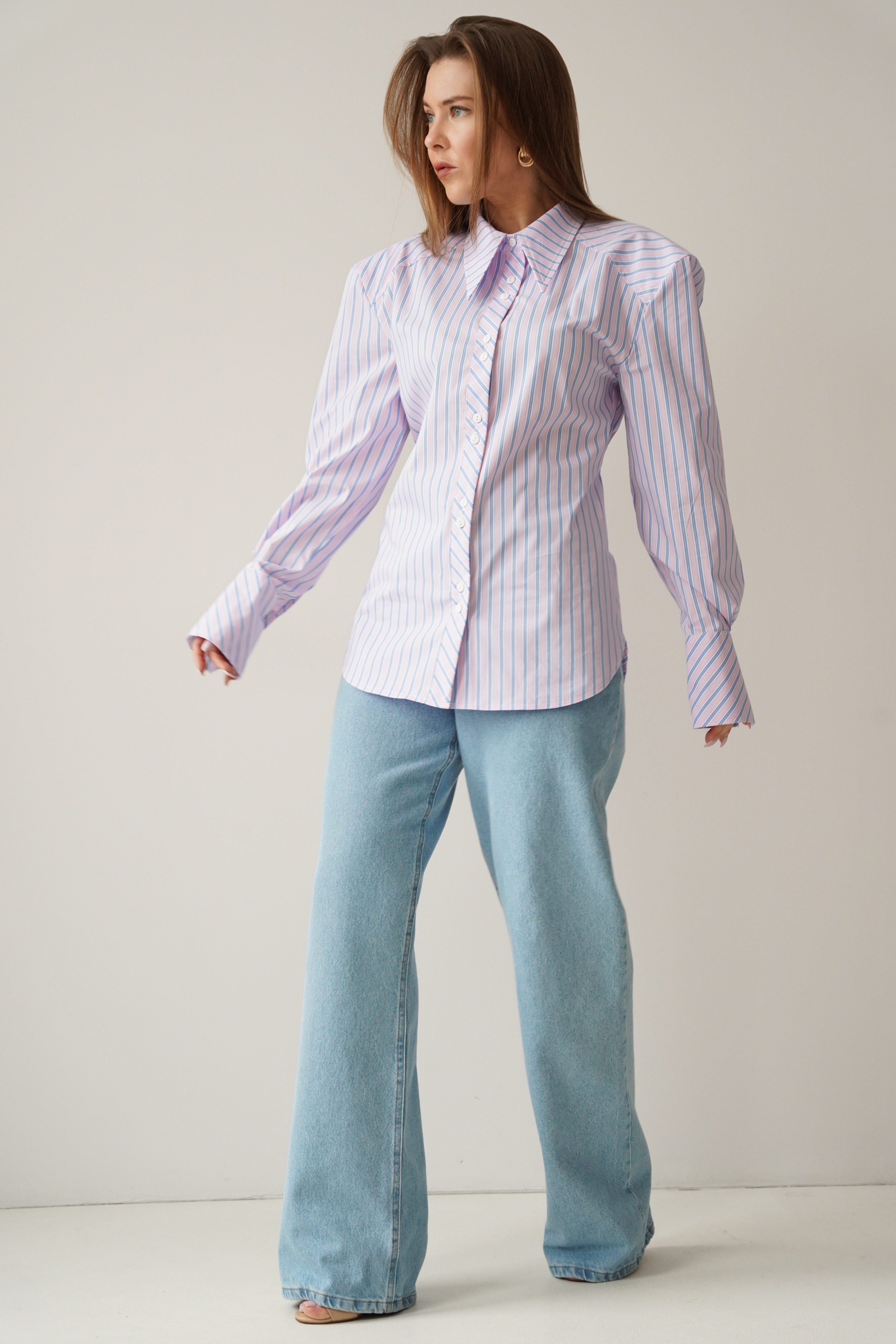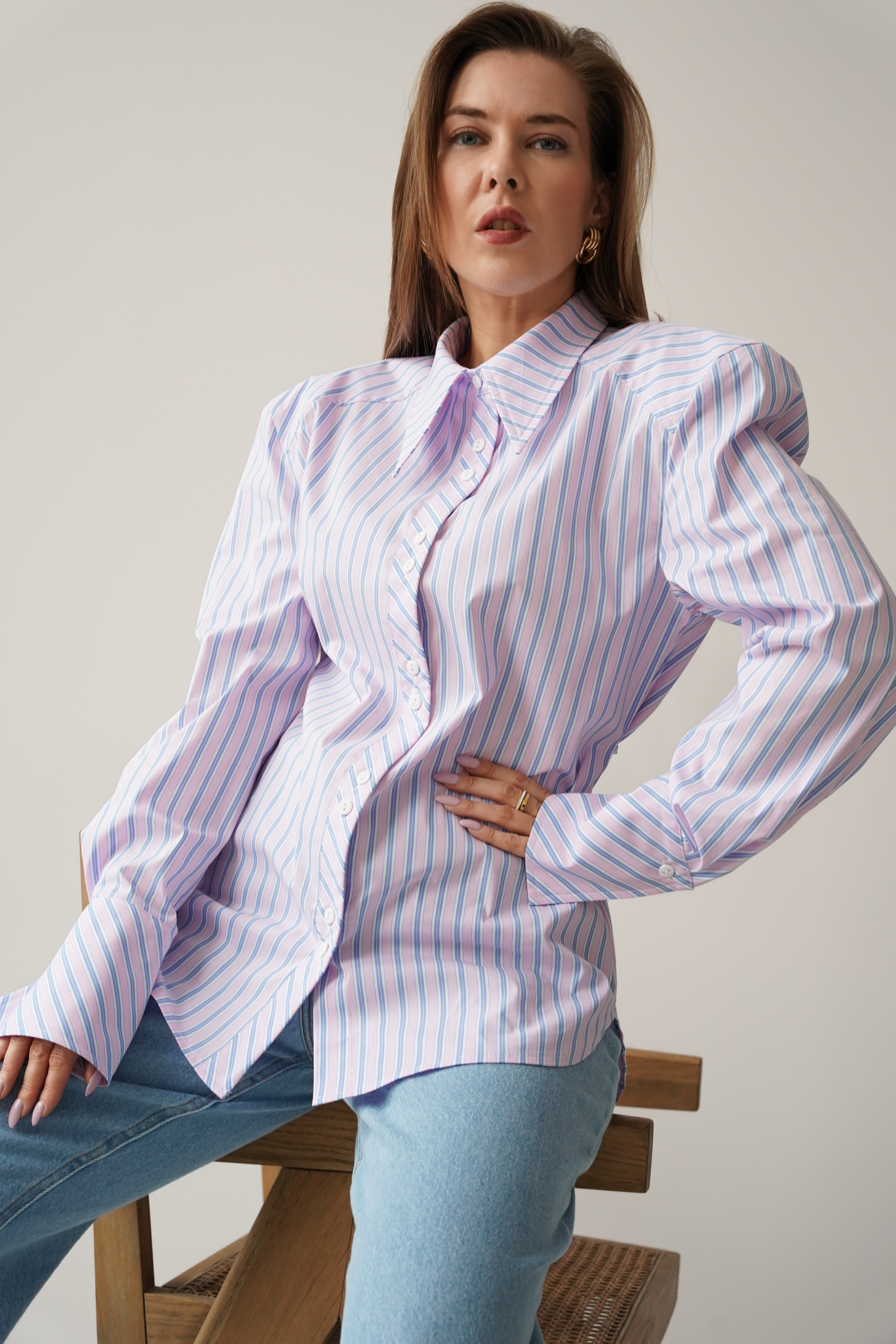 The elegant Allegra shirt is made from a soft blend of cotton and viscose. It has a slightly fitted, longer cut with a waistline and decorative strip that emphasises the waist. The shoulder pads create a modern, slim silhouette. The classic collar, cuffs and buttons complement the minimalist, premium character.