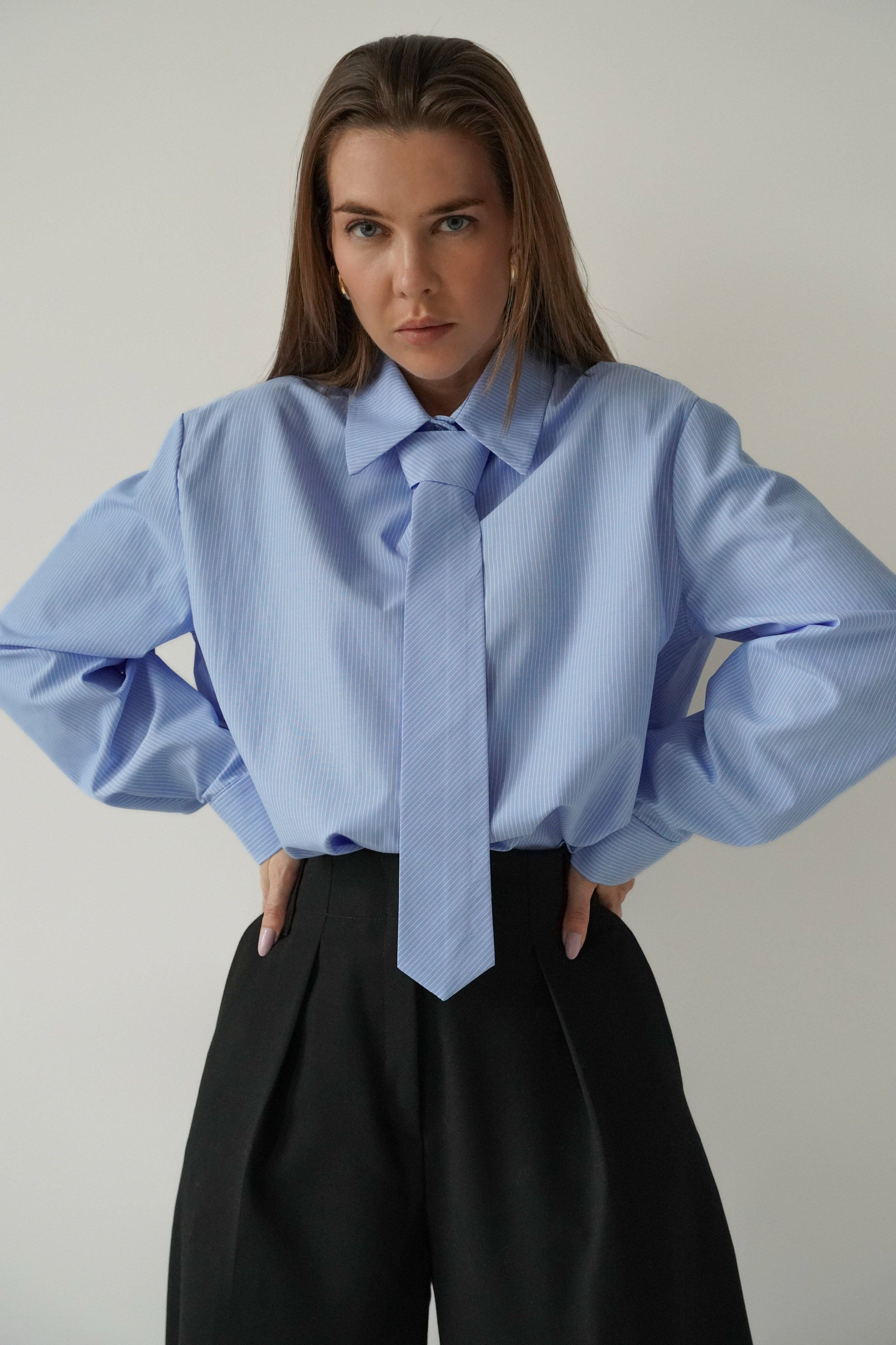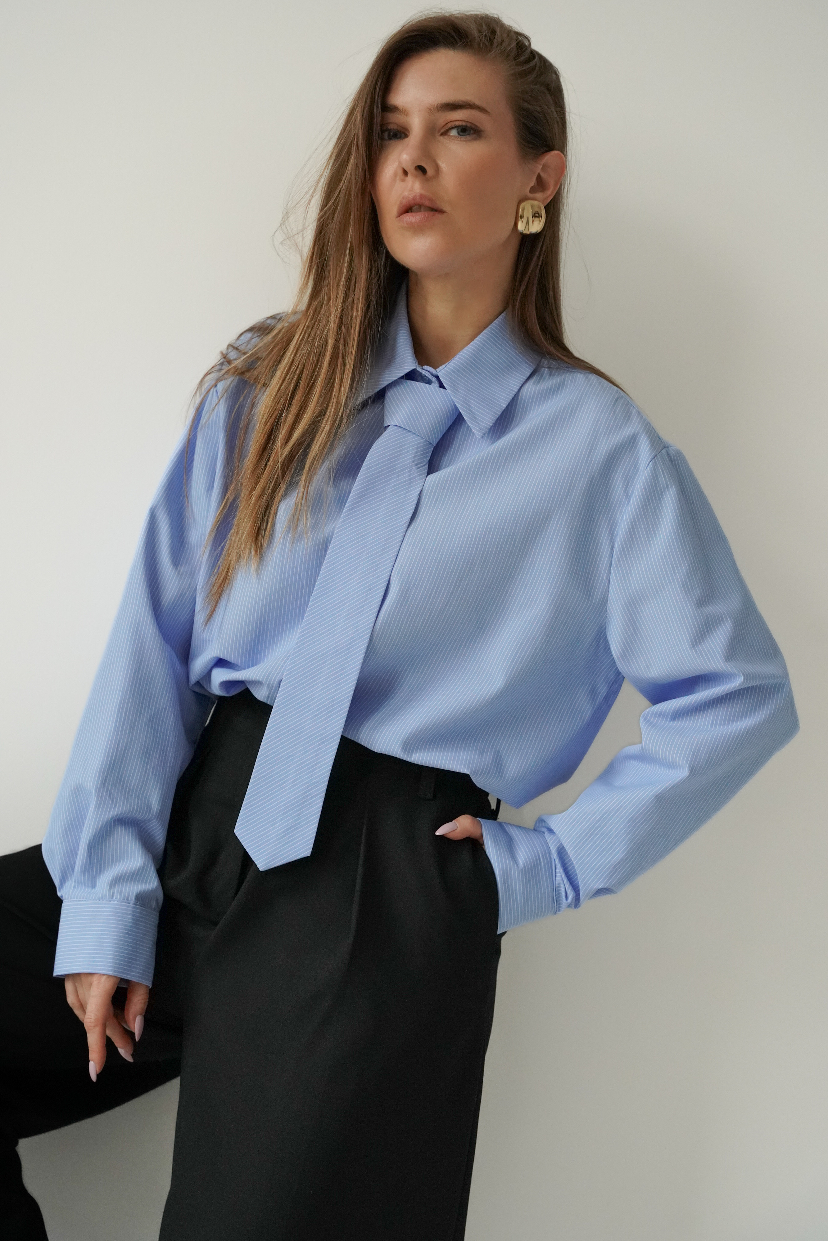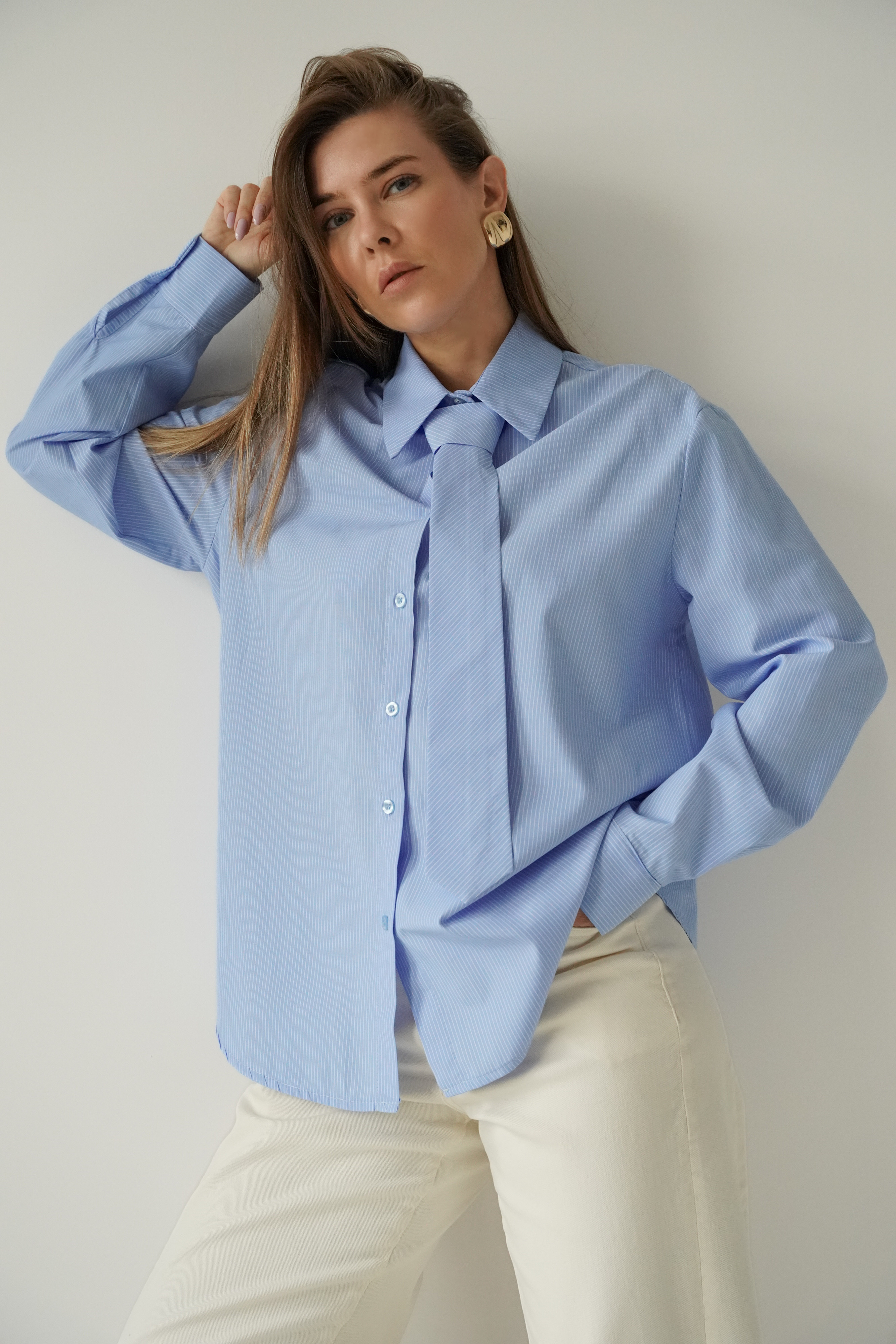 ICON TIE SHIRT is a classic shirt with a collar, cuffs and button fastening, made of 100% fine cotton. The distinctive tie made of the same material gives it a modern, slightly masculine and office-like character. The model is designed as a timeless base for styling from the office to evening outings.
