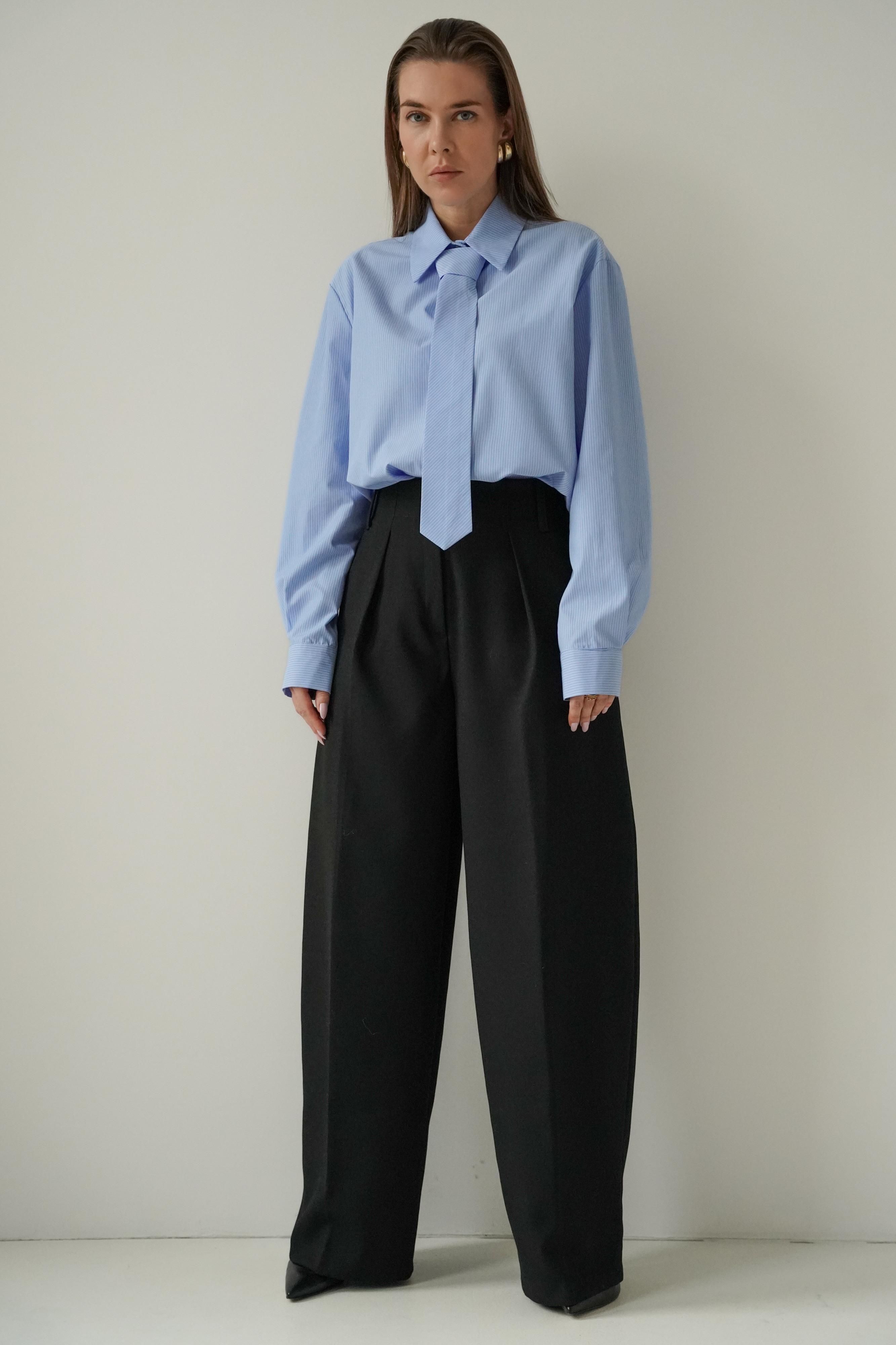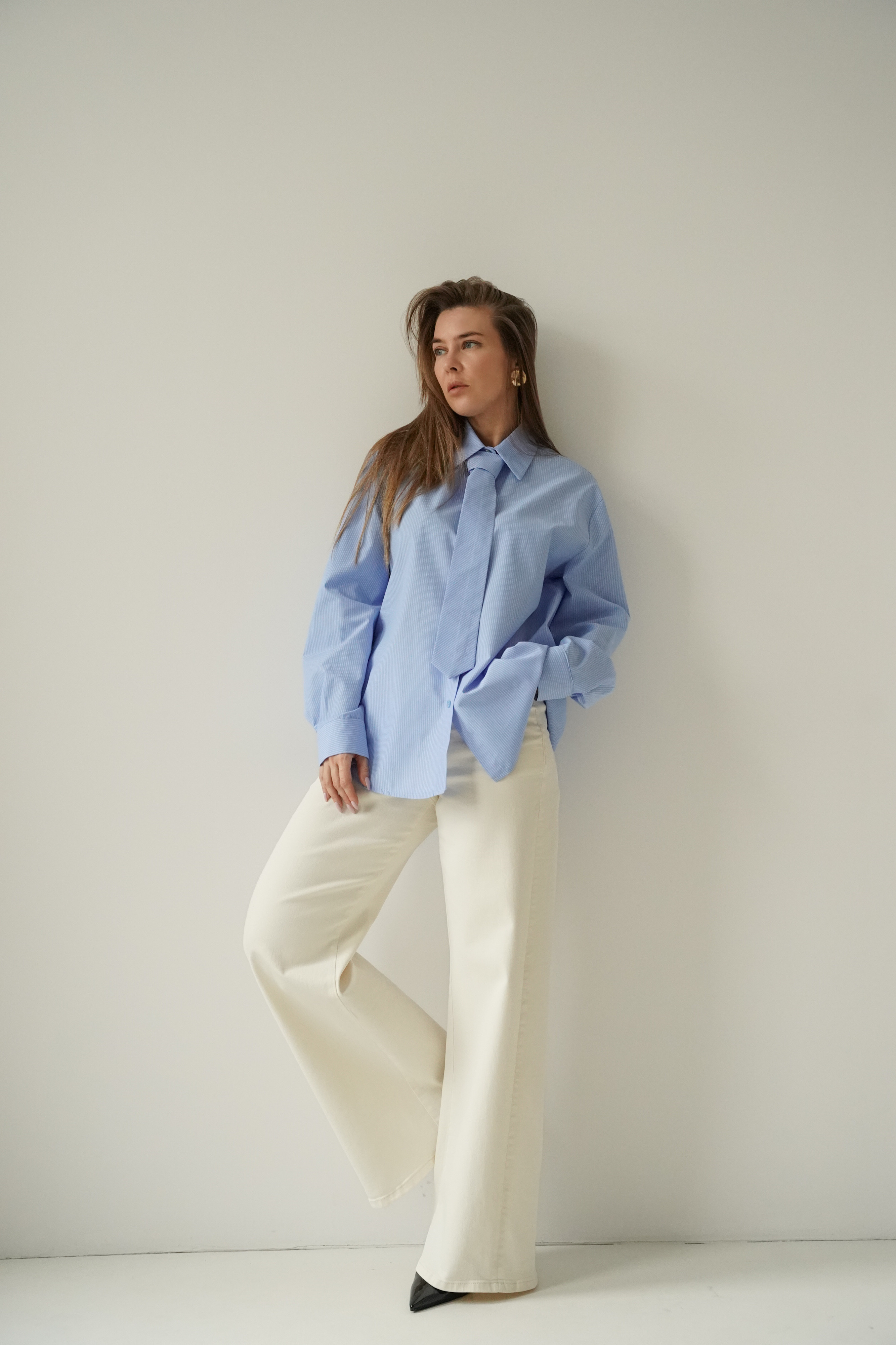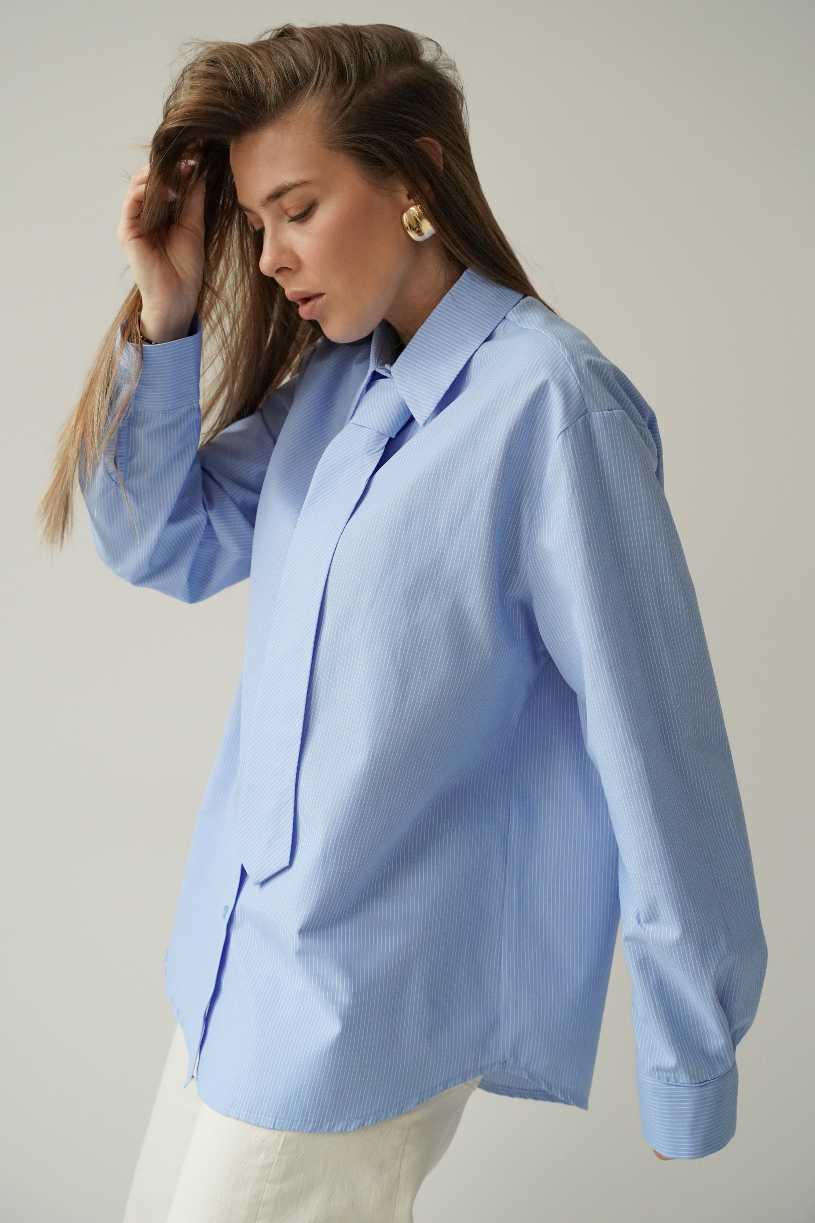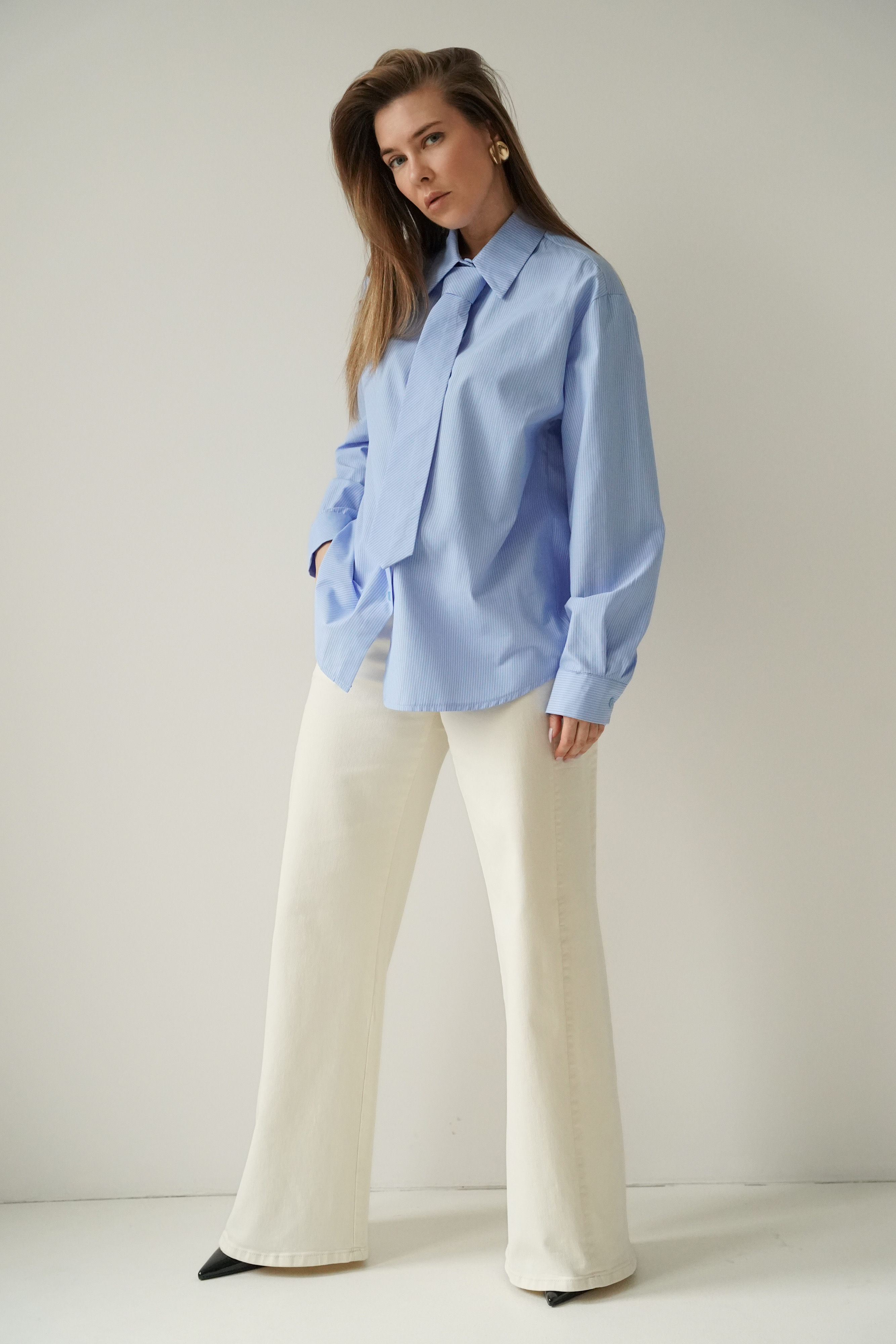 ICON TIE SHIRT is a classic shirt with a collar, cuffs and button fastening, made of 100% fine cotton. The distinctive tie made of the same material gives it a modern, slightly masculine and office-like character. The model is designed as a timeless base for styling from the office to evening outings.