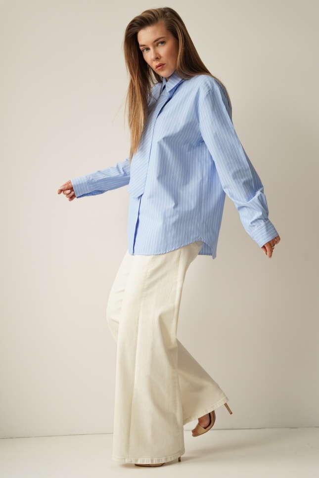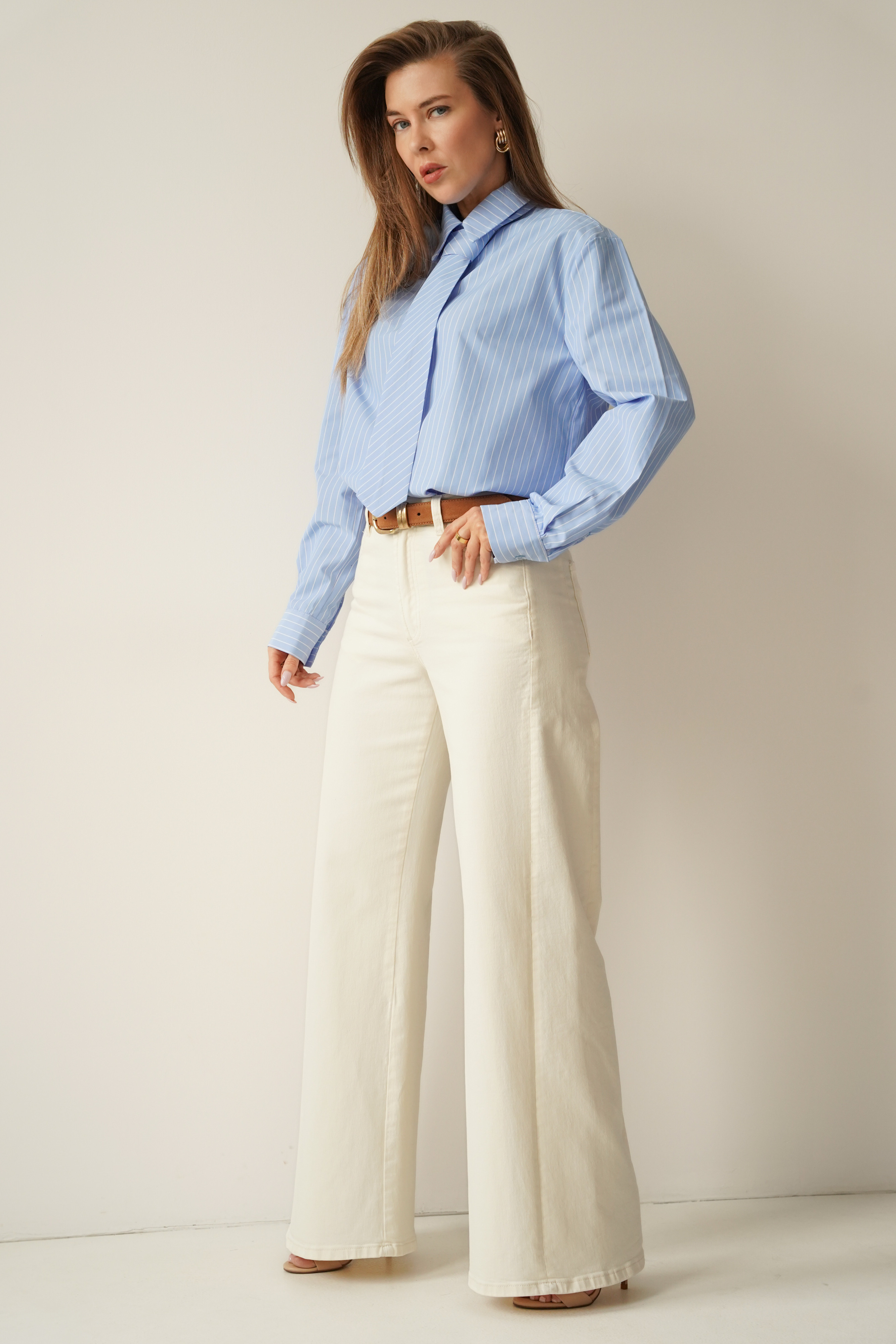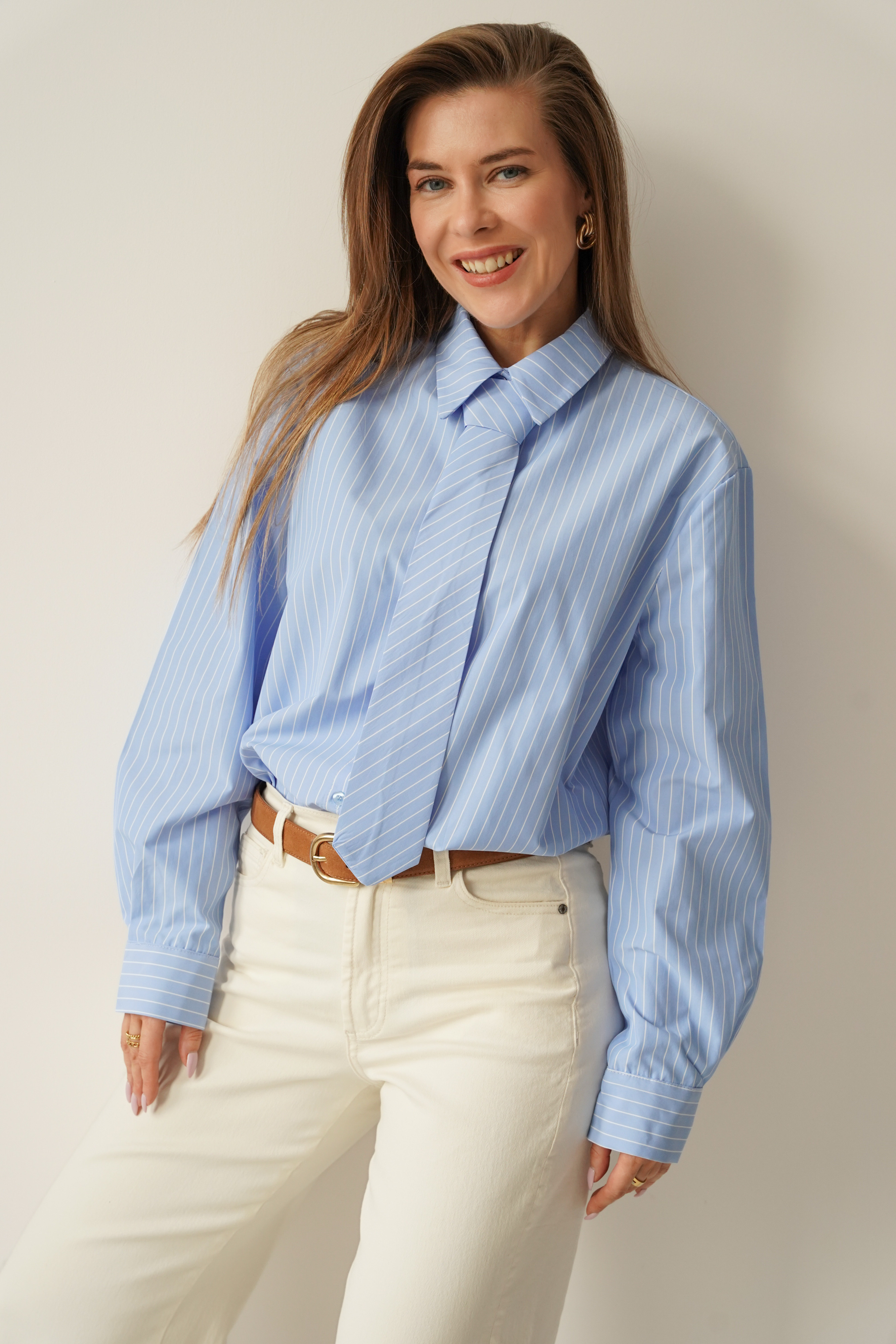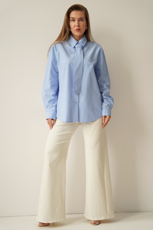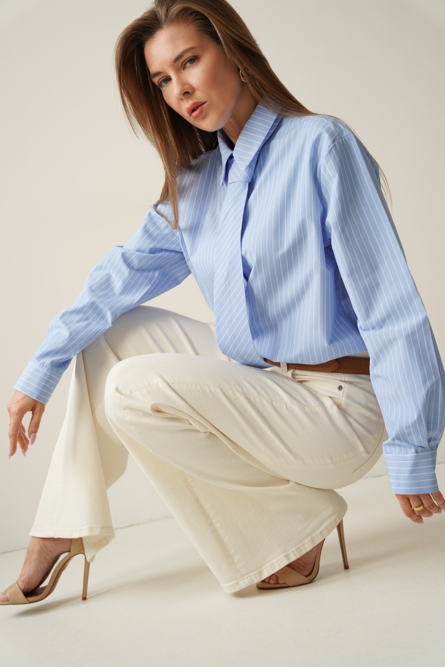 ICON TIE SHIRT is a classic shirt with a collar, cuffs and button fastening, made of 100% fine cotton. The distinctive tie made of the same material gives it a modern, slightly masculine and office-like character. The model is designed as a timeless base for styling from the office to evening outings.