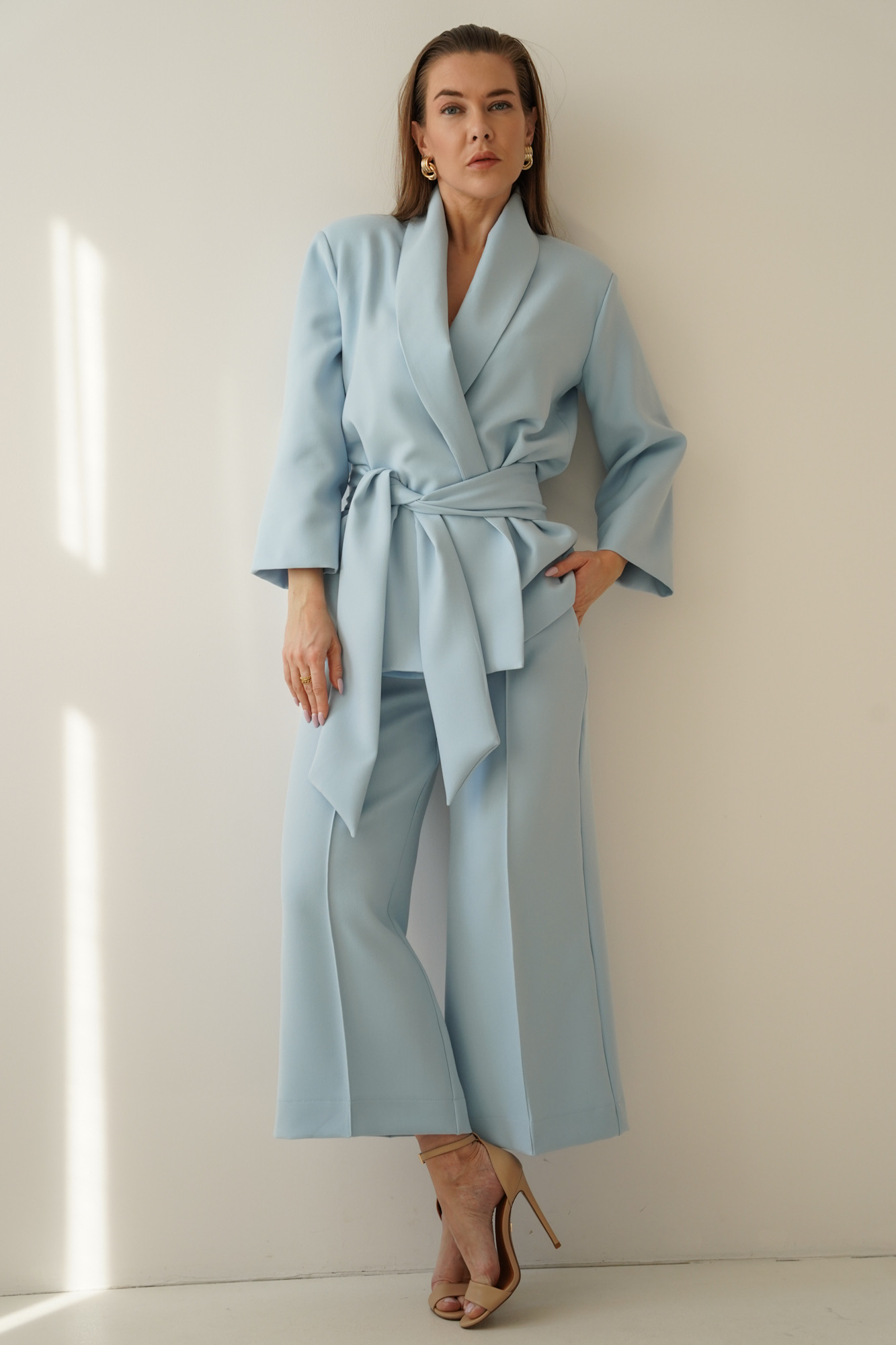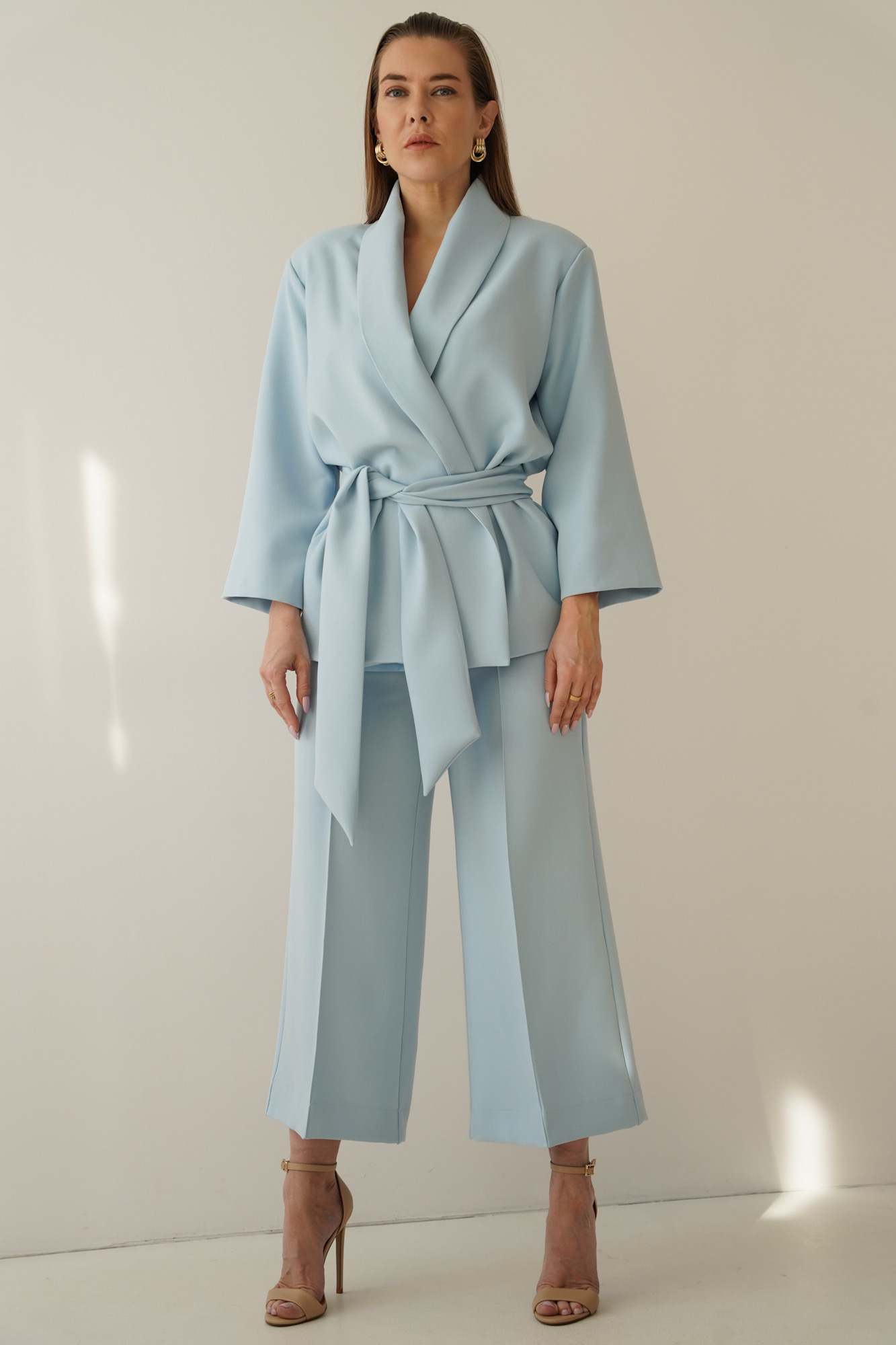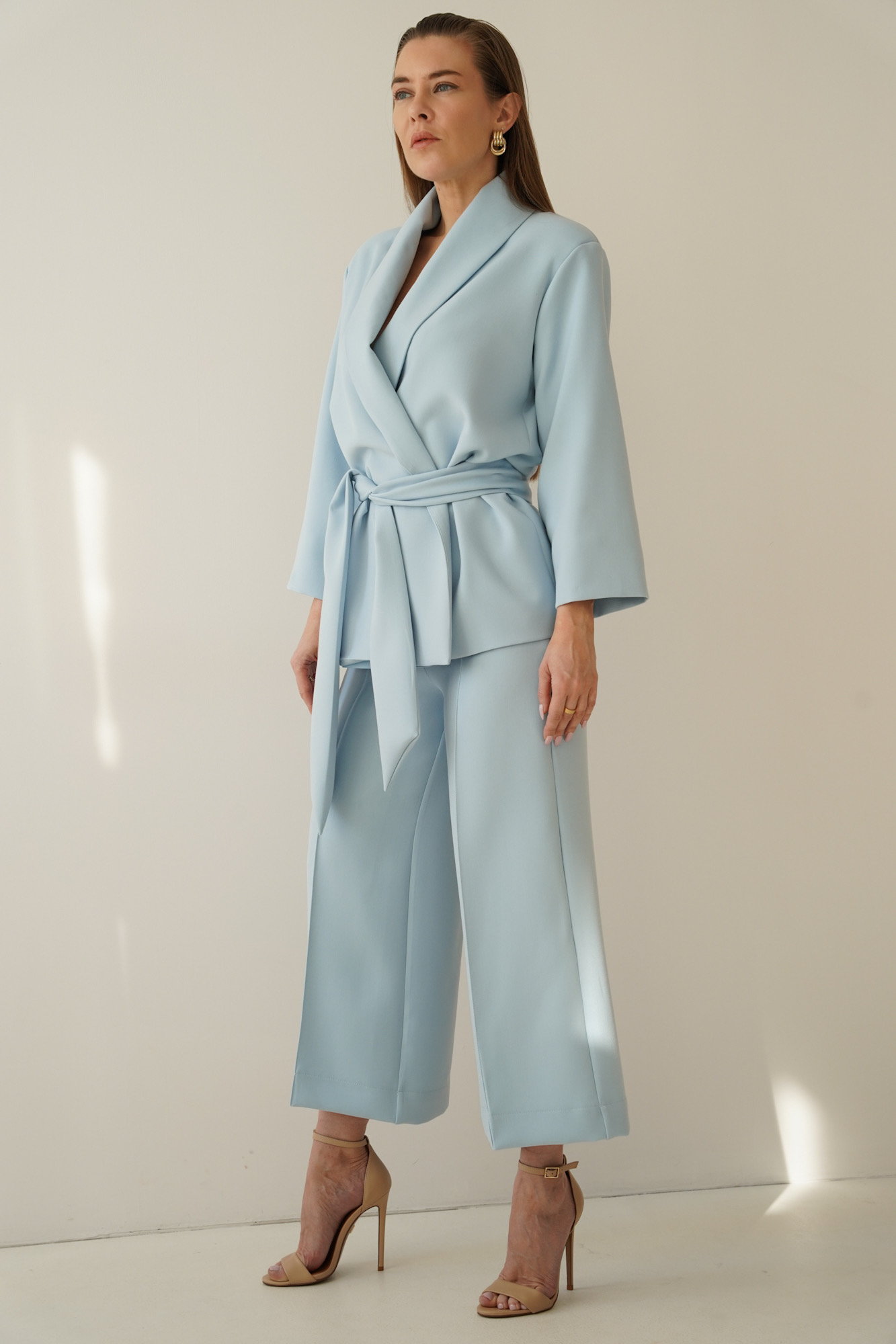 An elegant, feminine set consisting of a belted jacket and culotte pants with creases. Made of high-quality suit fabric with 72% viscose. A stylish balance between elegance and casual. Perfect for everyday wear, work, and evening occasions.
