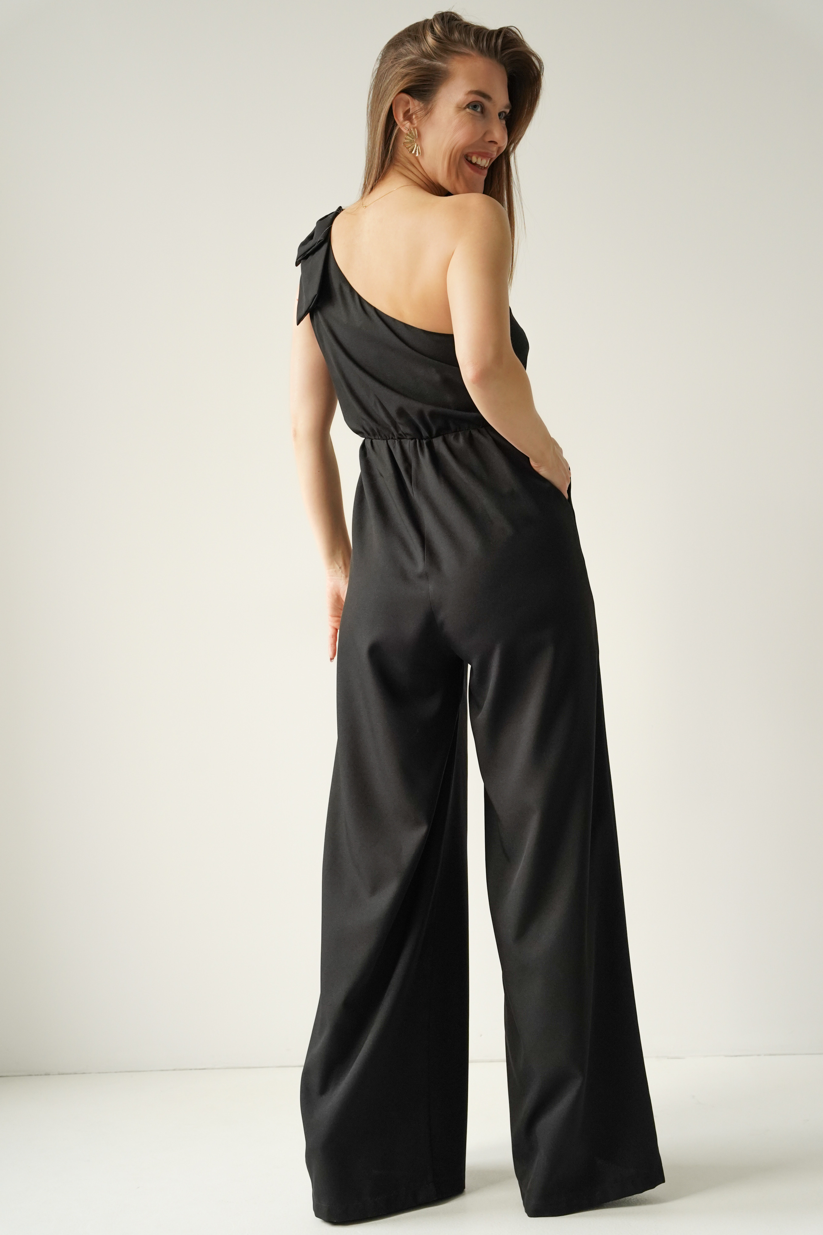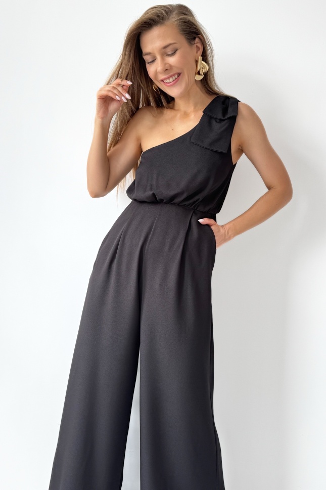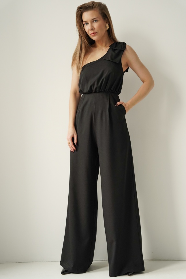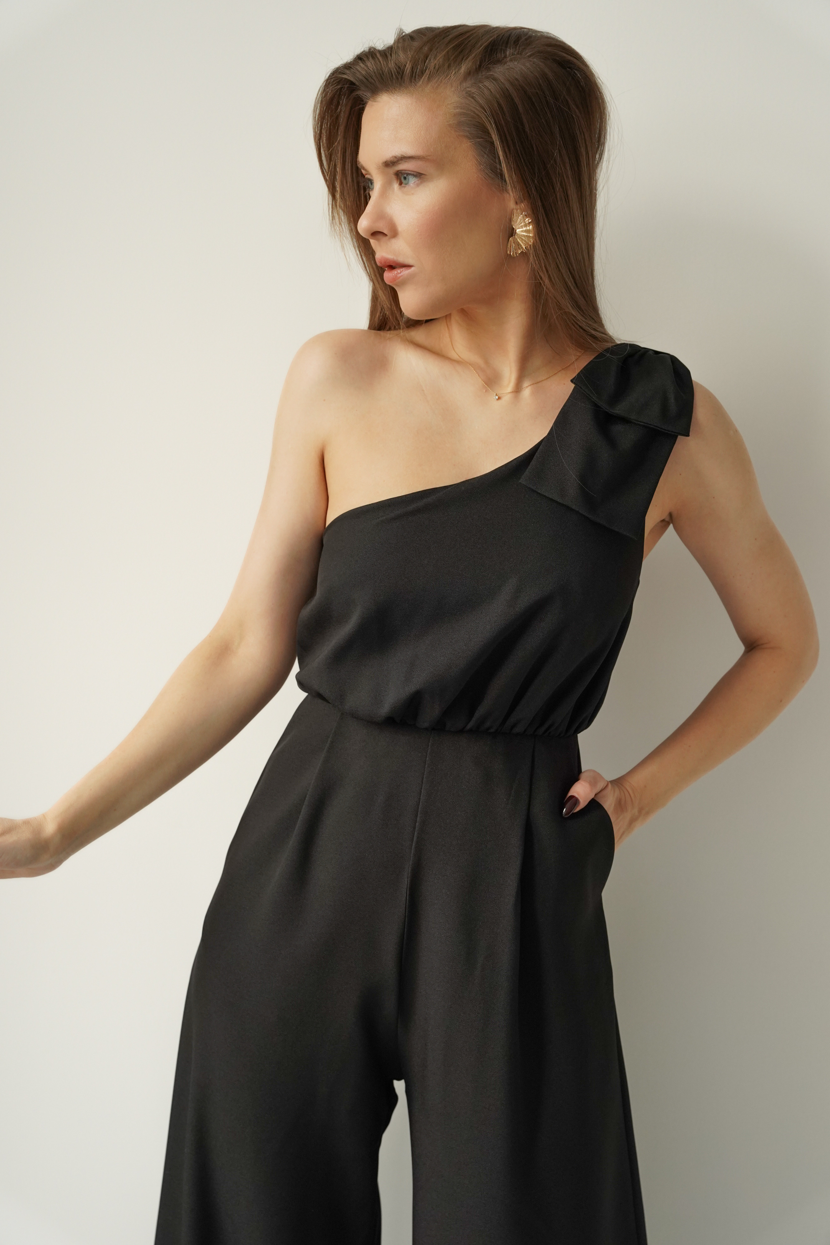 Feminine, elegant jumpsuit made of viscose material. Feminine accent in the form of a bow on the shoulder. One-shoulder neckline subtly emphasizes the bust and collarbone line. Wide pants optically slim the figure and cover up any shortcomings. The whole creates a stylish, fashion-balanced outfit that you can successfully wear on great occasions, not only this season but also in the next ones. ERIN is a timeless design that will serve you for a long time.