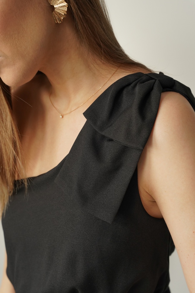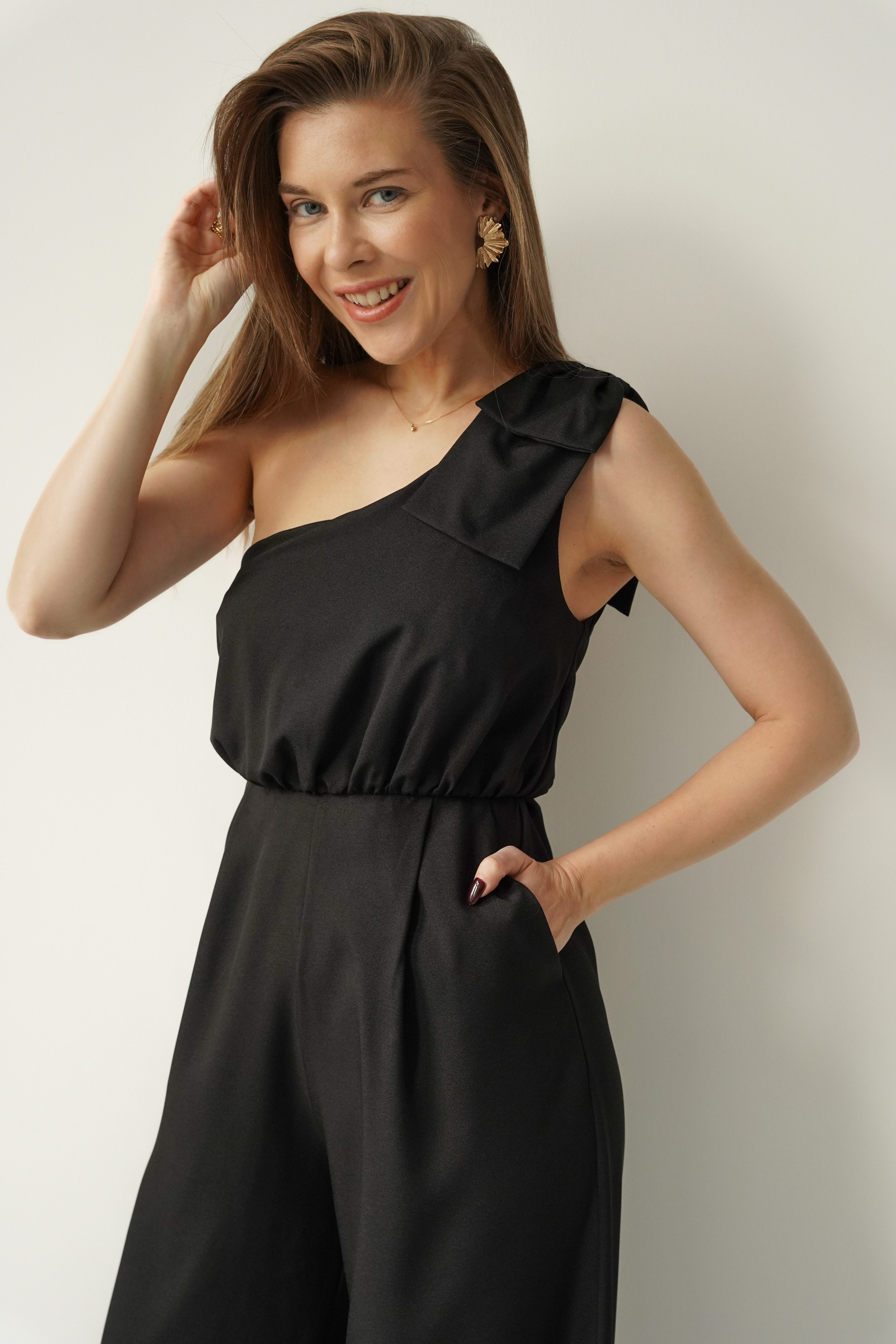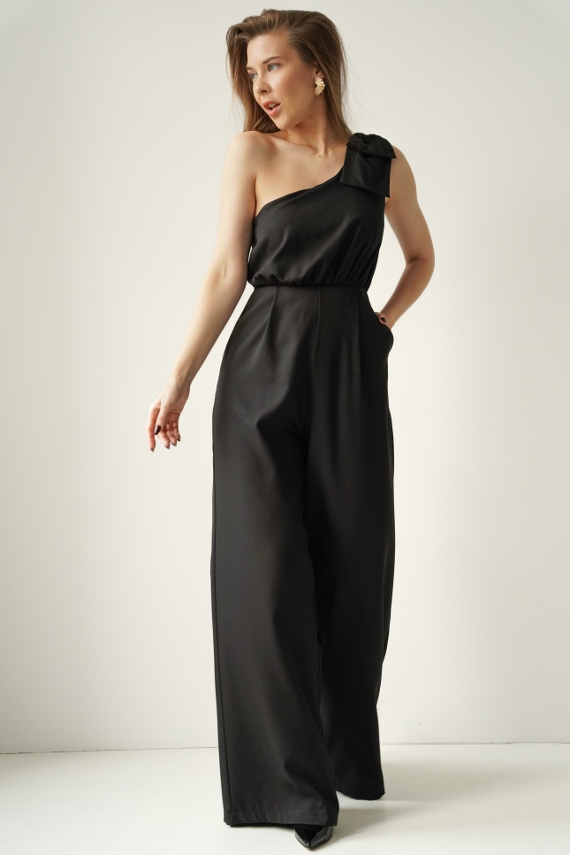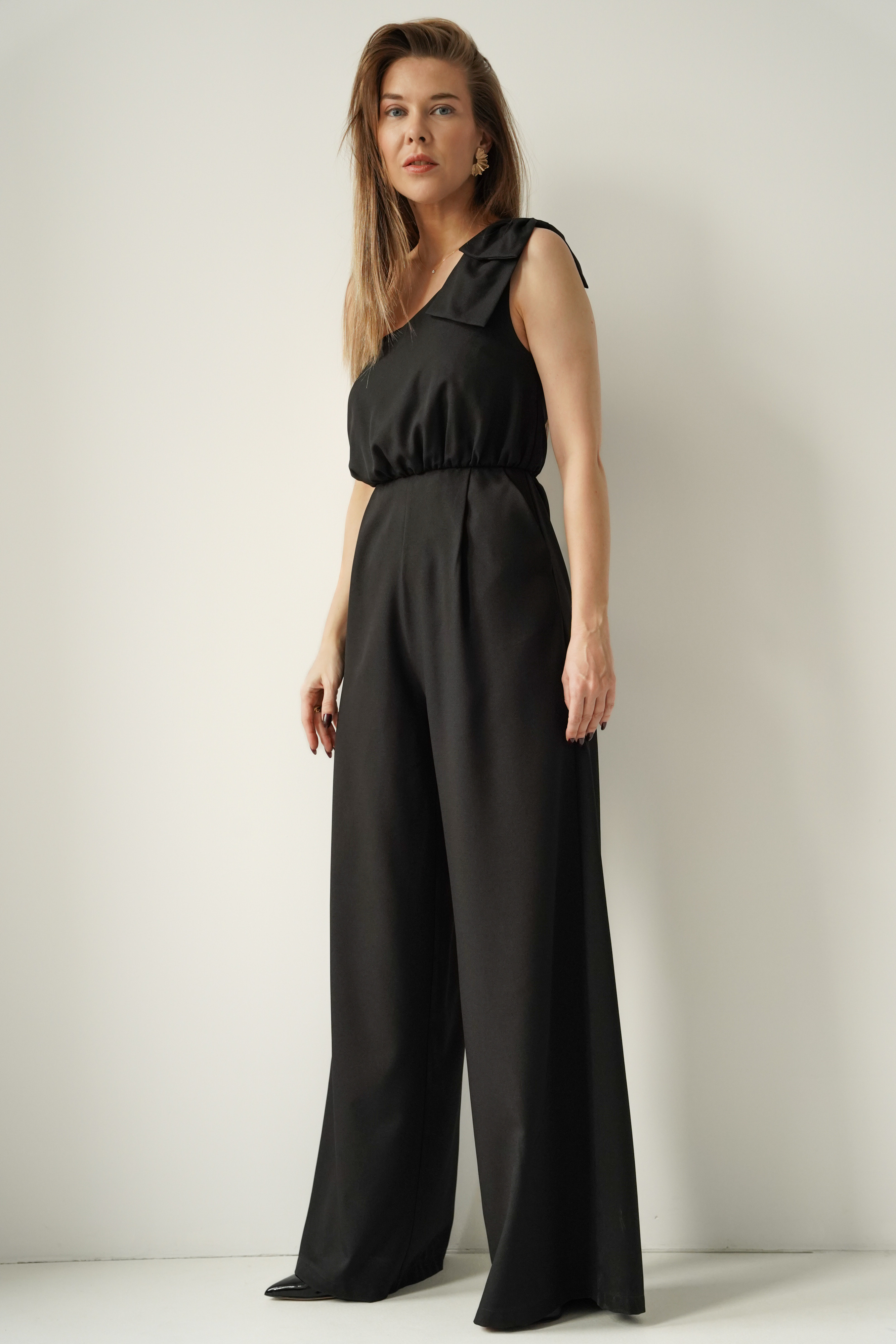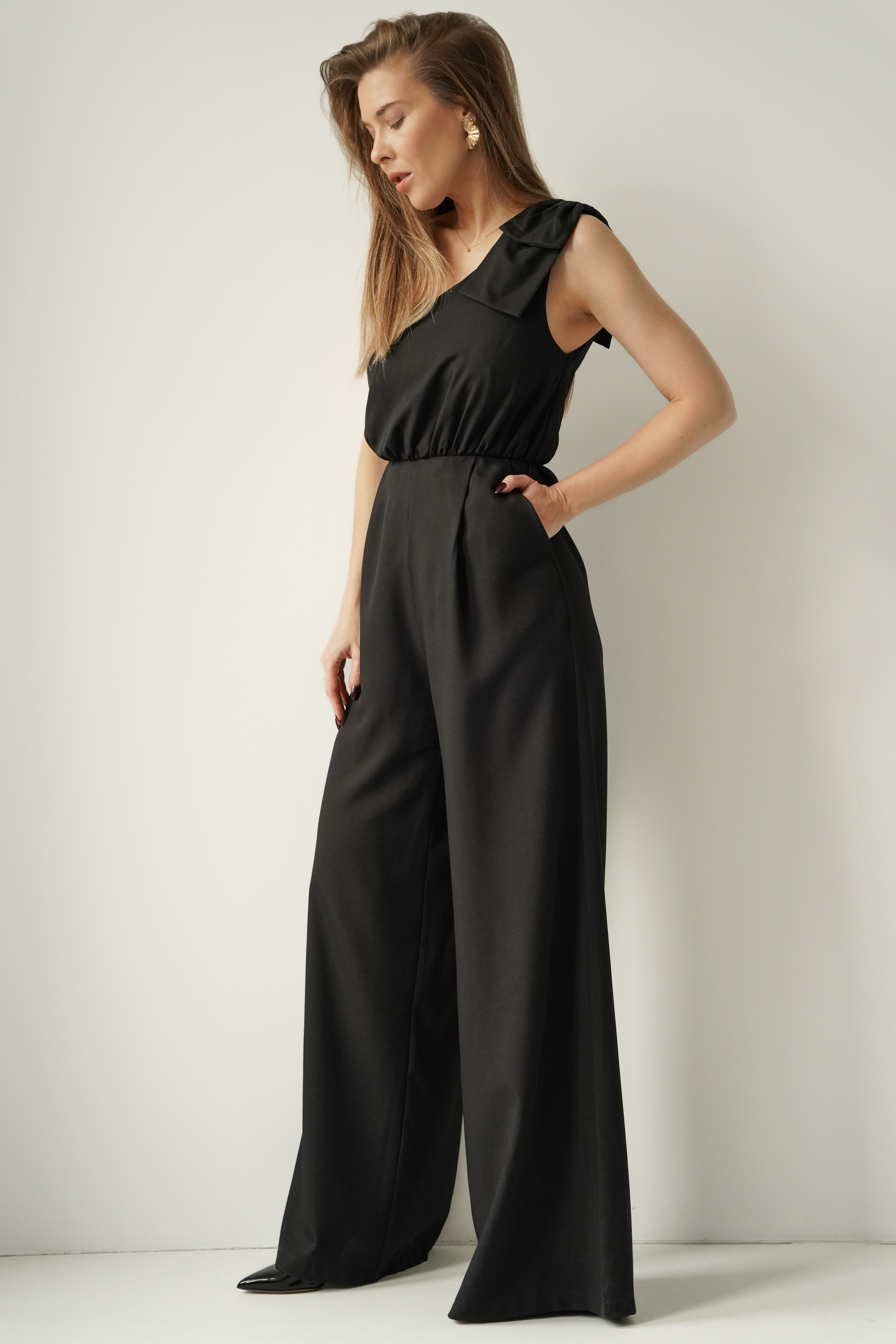 Feminine, elegant jumpsuit made of viscose material. Feminine accent in the form of a bow on the shoulder. One-shoulder neckline subtly emphasizes the bust and collarbone line. Wide pants optically slim the figure and cover up any shortcomings. The whole creates a stylish, fashion-balanced outfit that you can successfully wear on great occasions, not only this season but also in the next ones. ERIN is a timeless design that will serve you for a long time.
