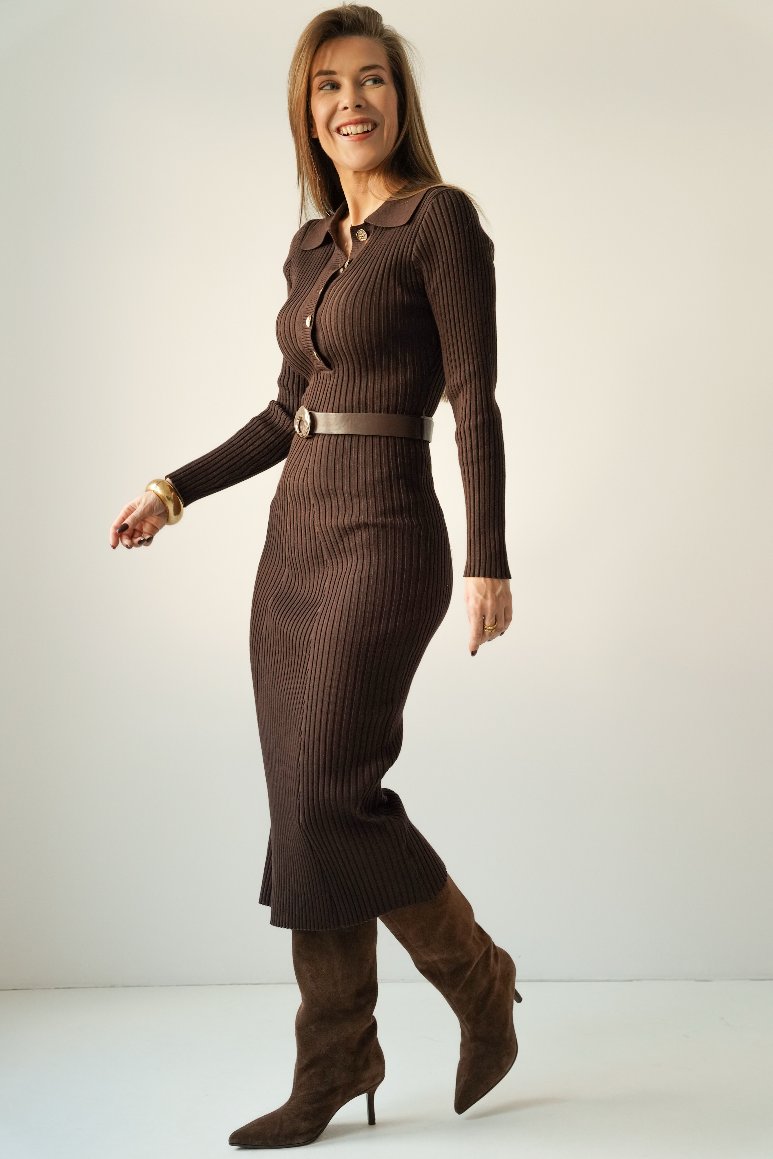 The soft blend of viscose, modal and polyamide subtly adapts to the figure, ensuring comfort and elegance. The dress has a collar, decorative buttons and a belt that emphasises the waist. Perfect for smart casual styling – for work, meetings and everyday outings.