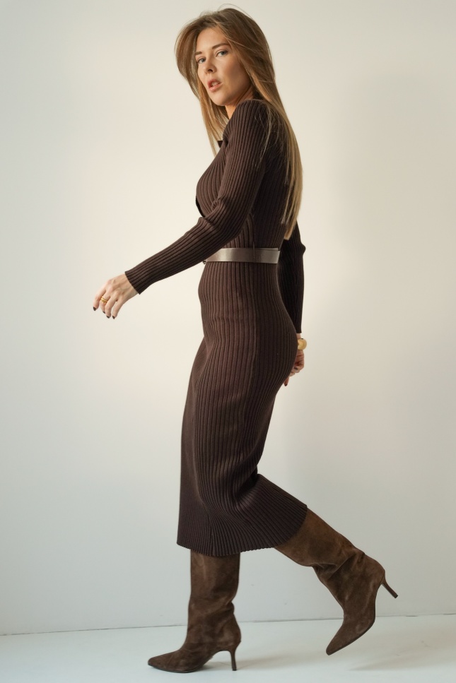 Éliana is a fitted, knitted dress with wider stripes and a 7/8 length.