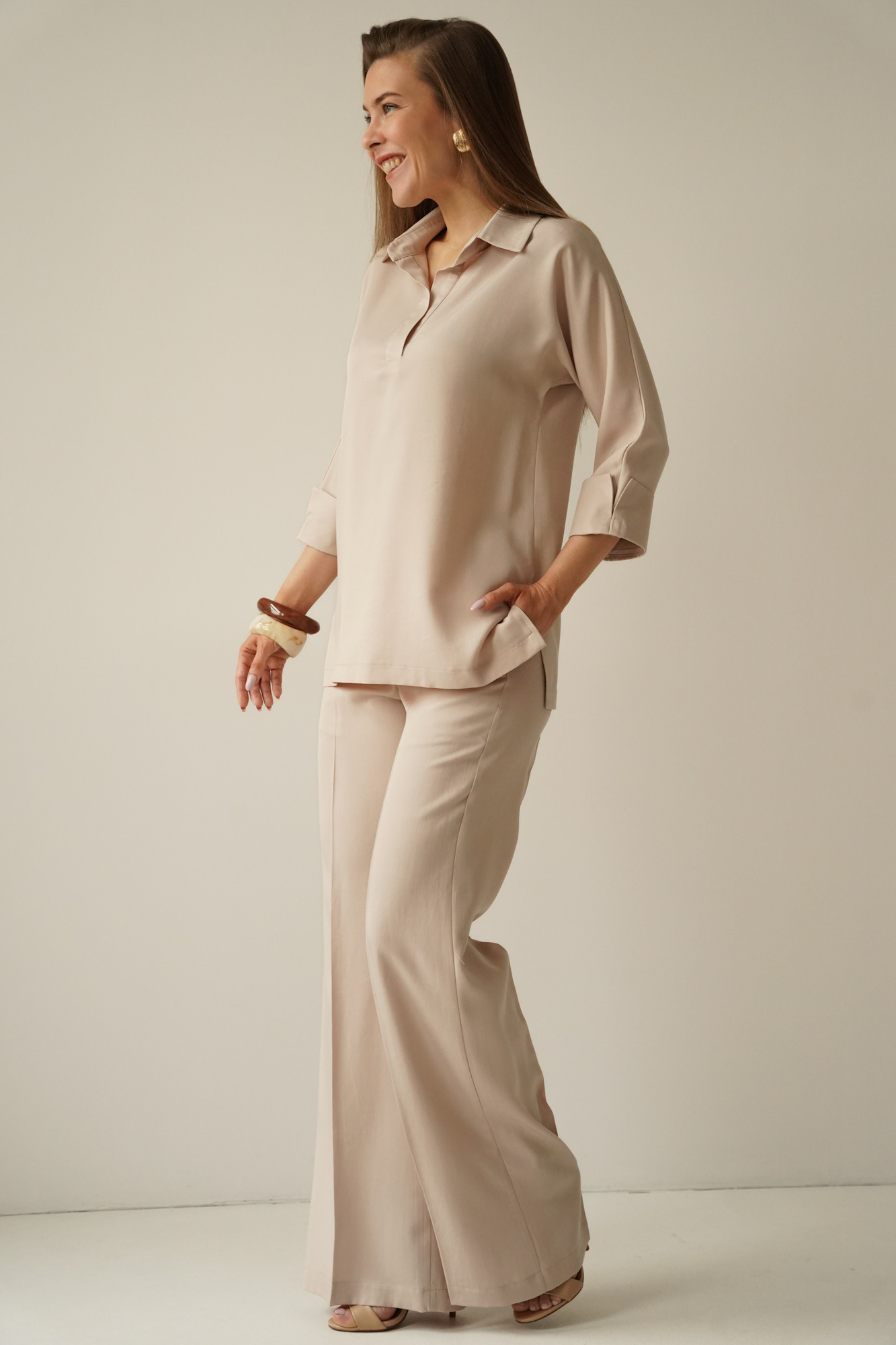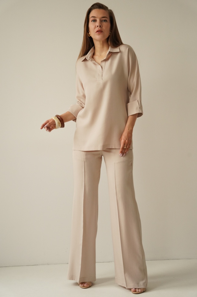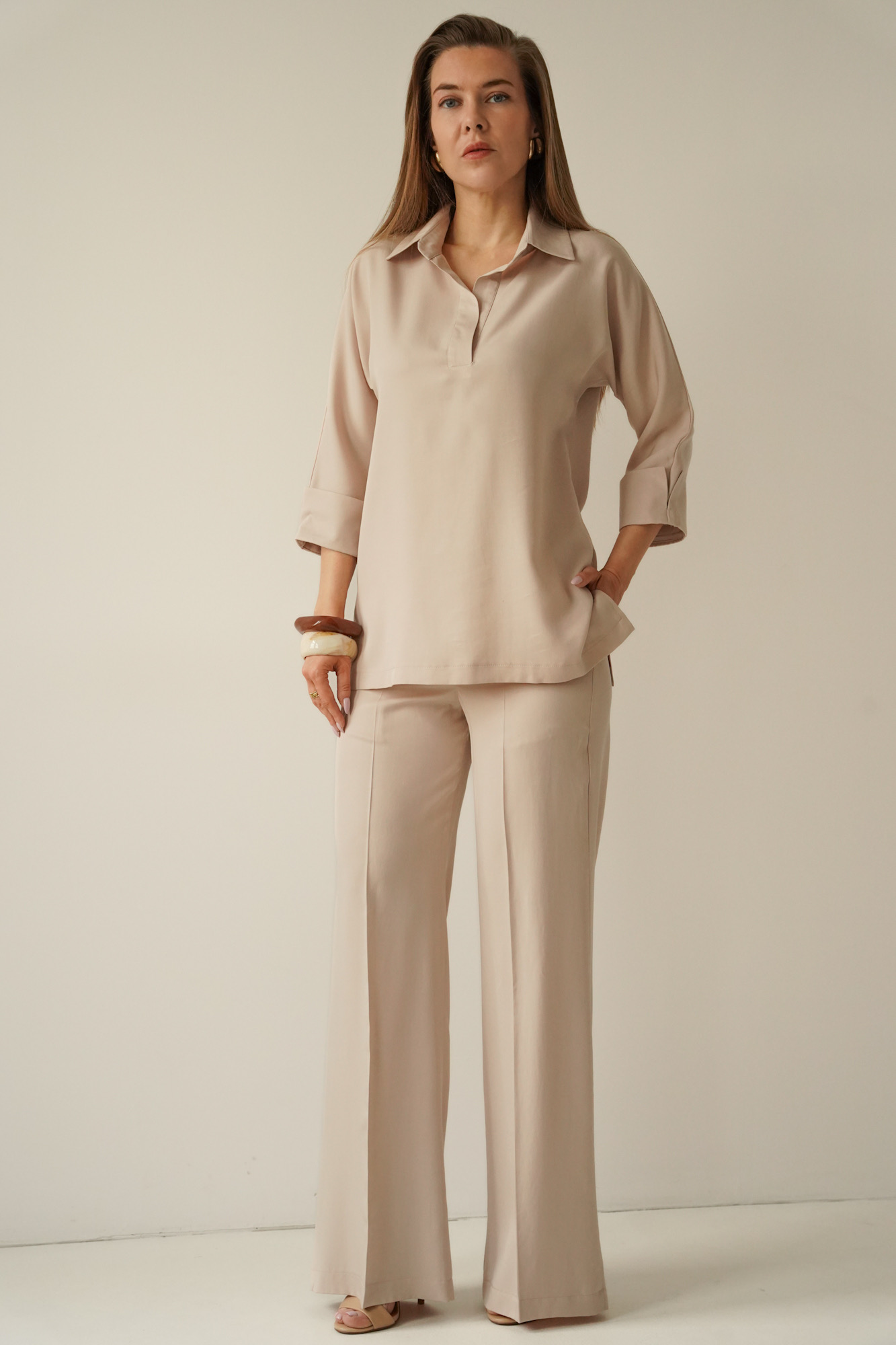 ATELIER is a minimalist, elegant set consisting of an elongated polo shirt with ¾ sleeves and creased trousers with pockets.