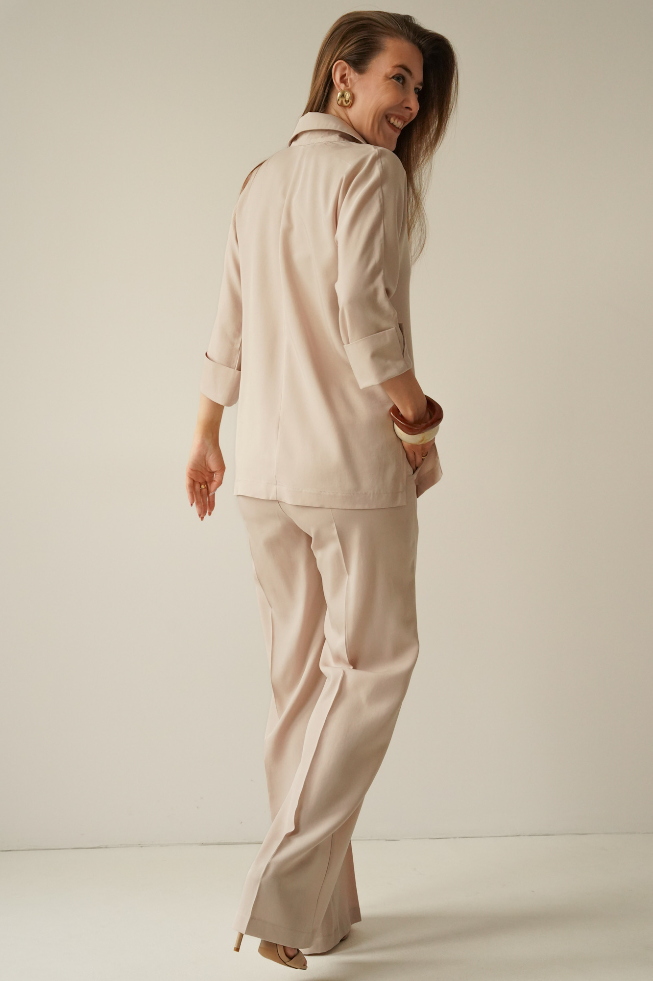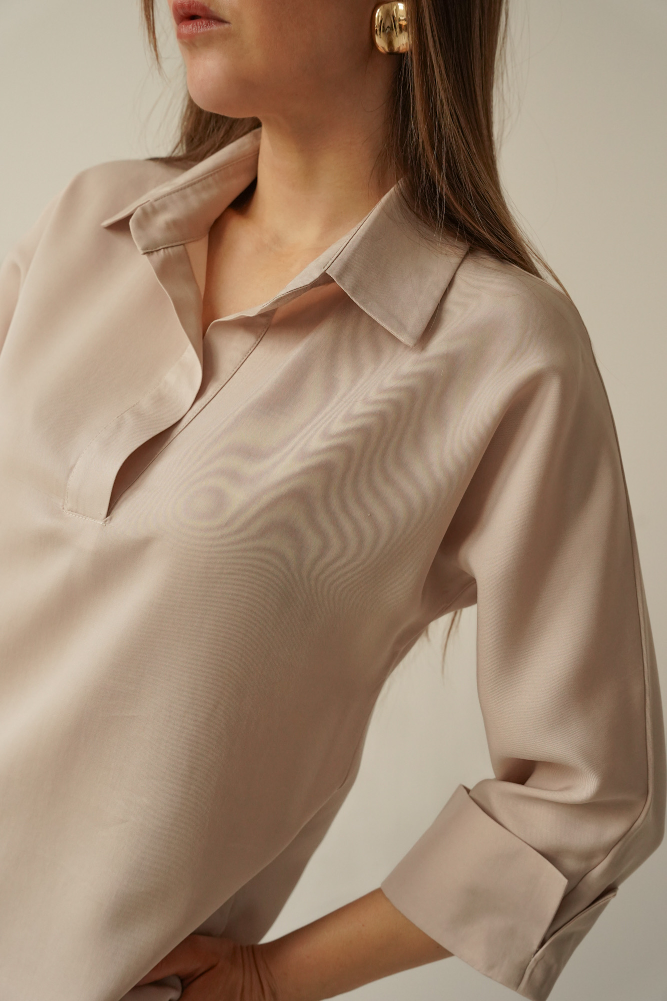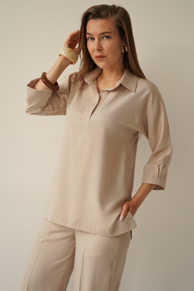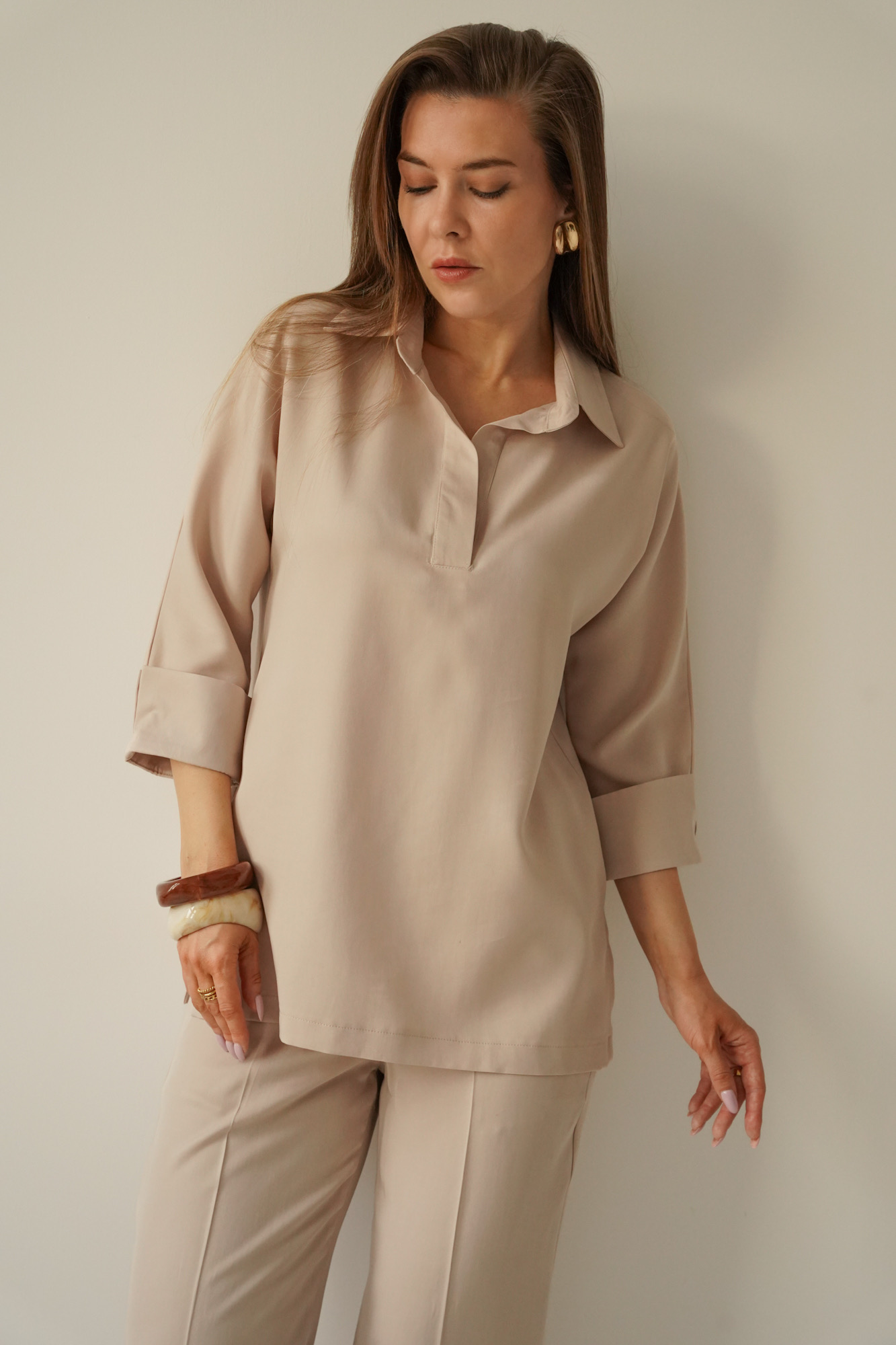 ATELIER is a minimalist, elegant set consisting of an elongated polo shirt with ¾ sleeves and creased trousers with pockets.