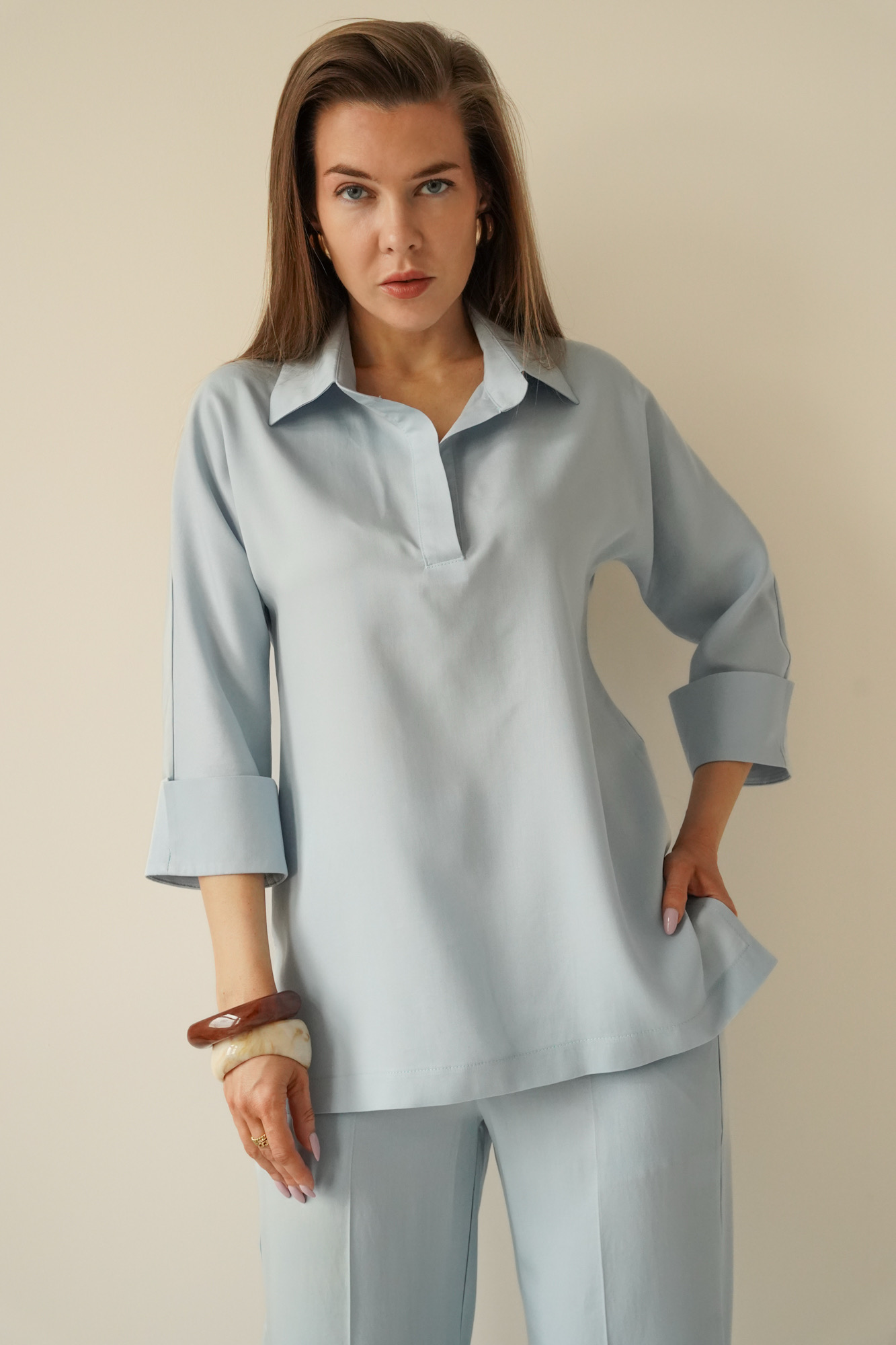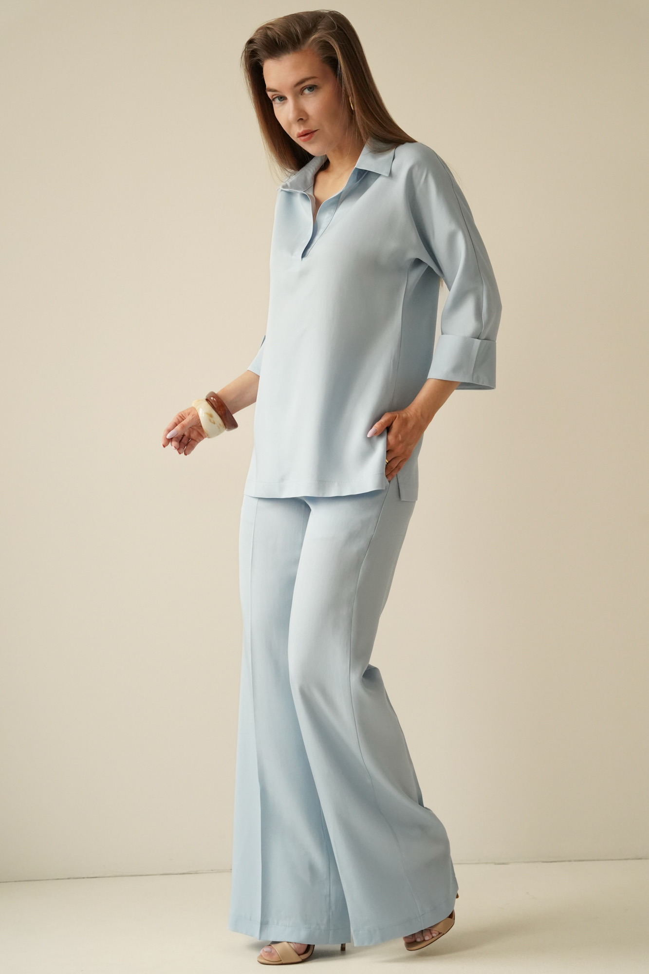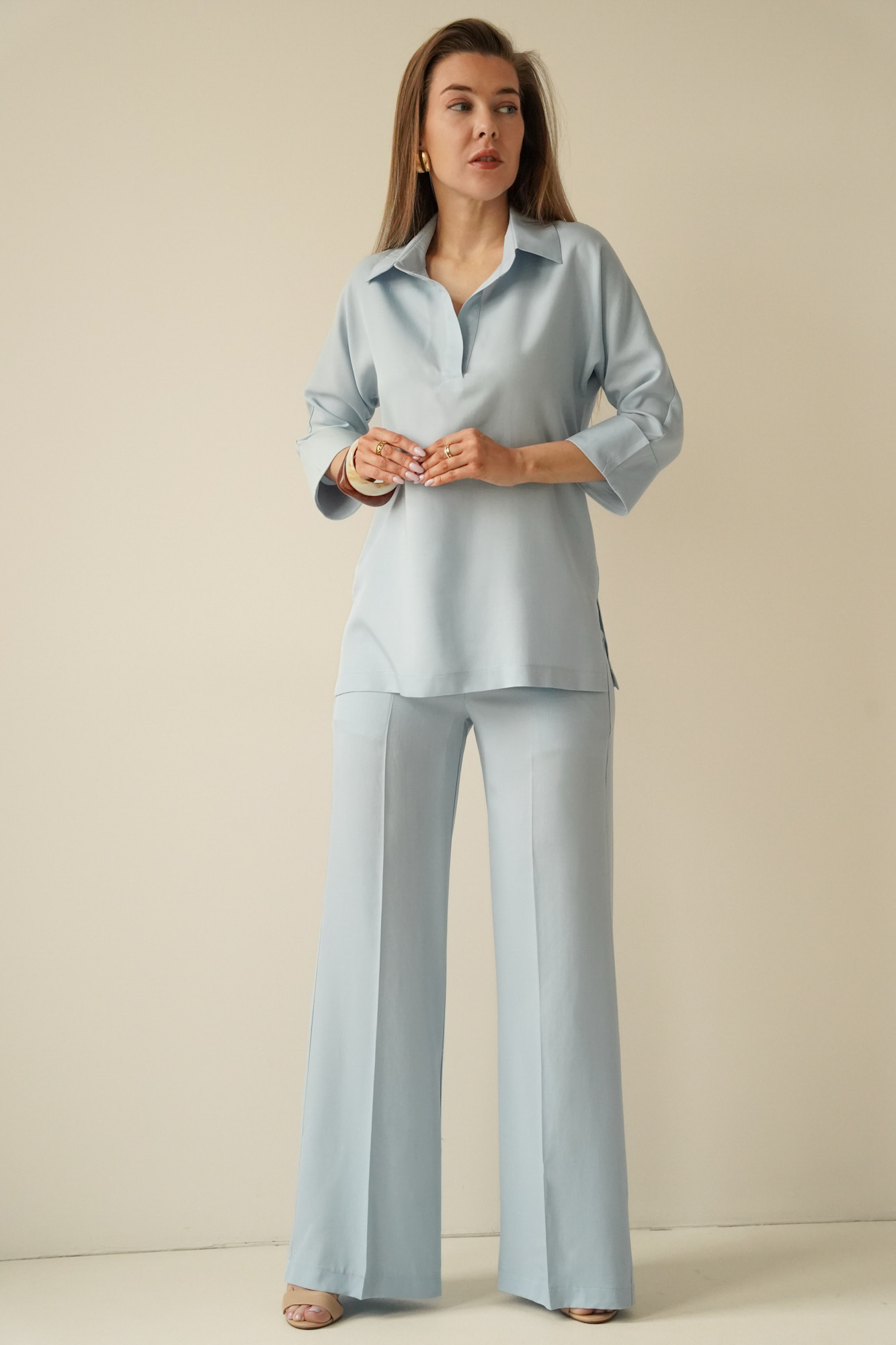 ATELIER is a minimalist, elegant set consisting of an elongated polo shirt with ¾ sleeves and creased trousers with pockets.