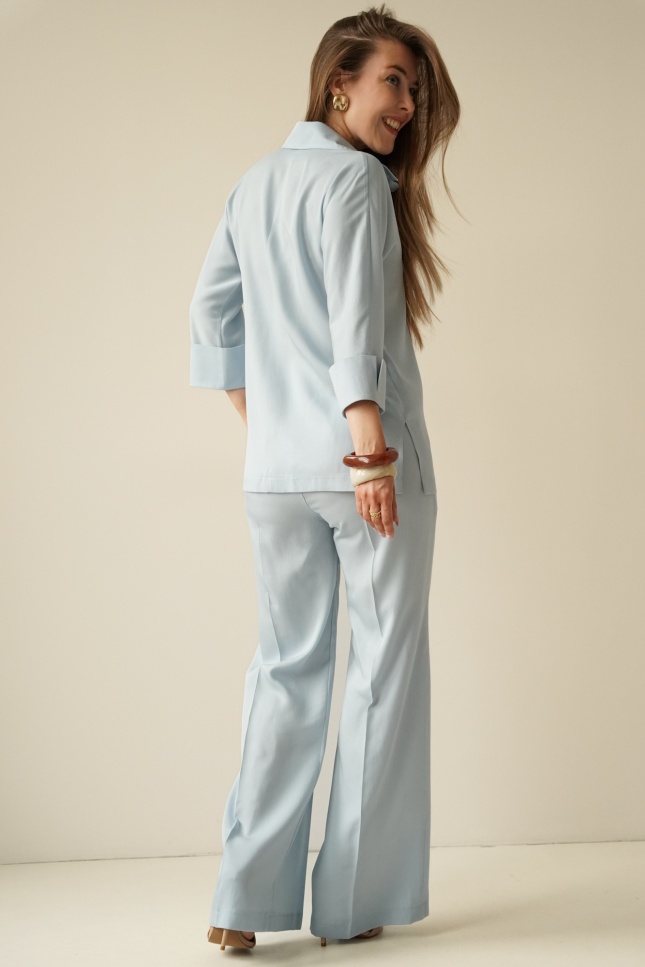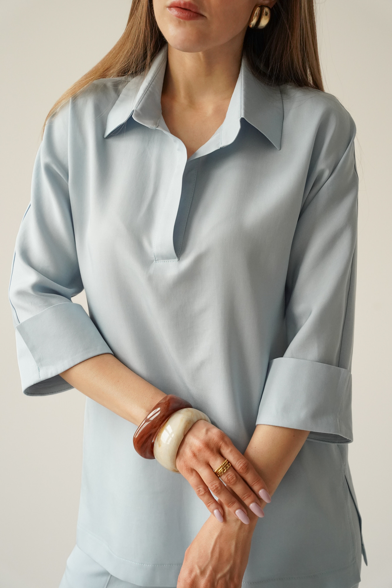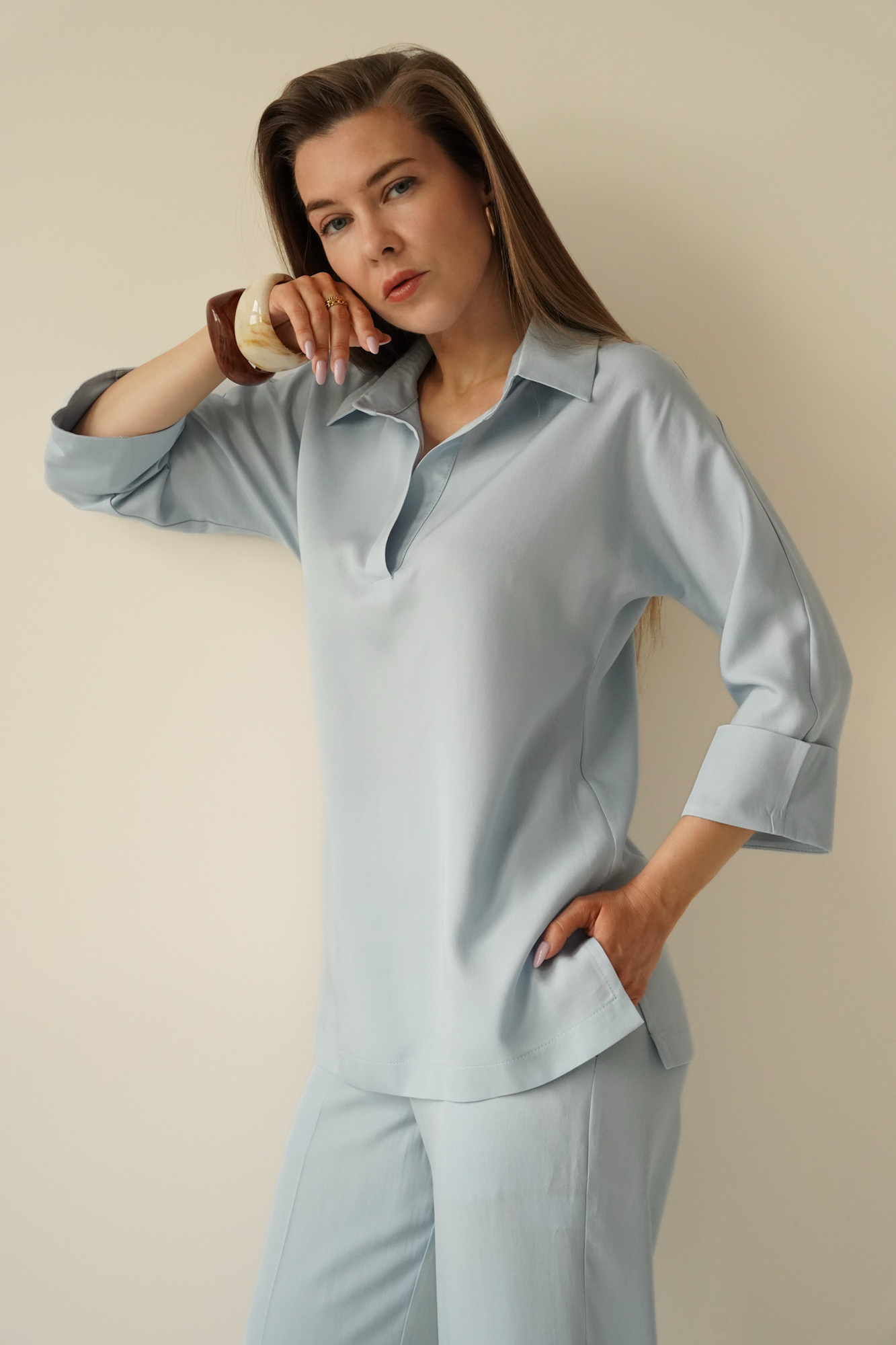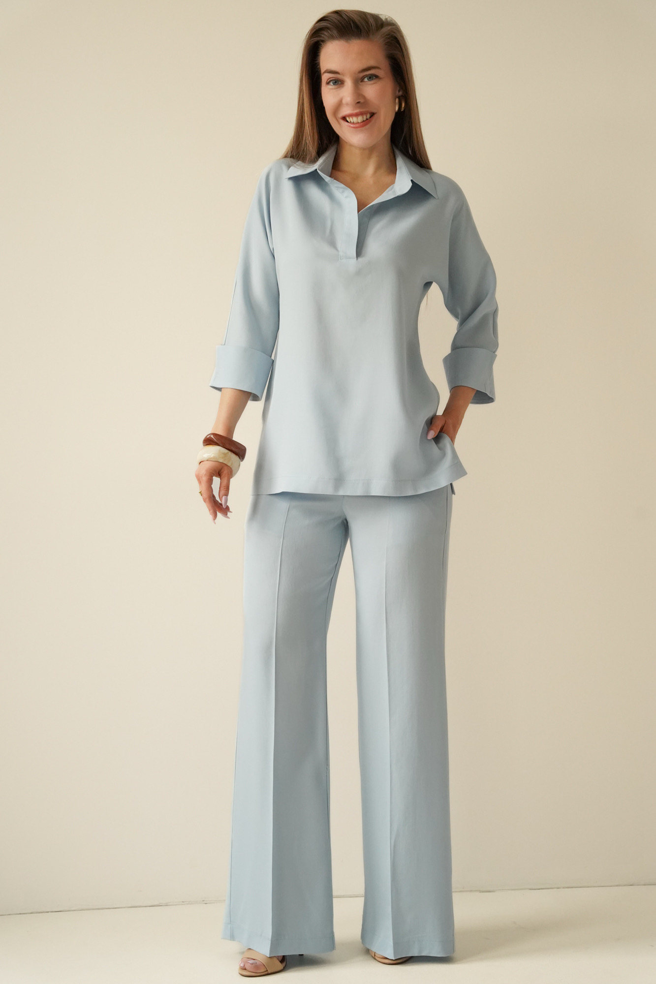 ATELIER is a minimalist, elegant set consisting of an elongated polo shirt with ¾ sleeves and creased trousers with pockets.