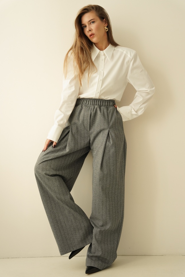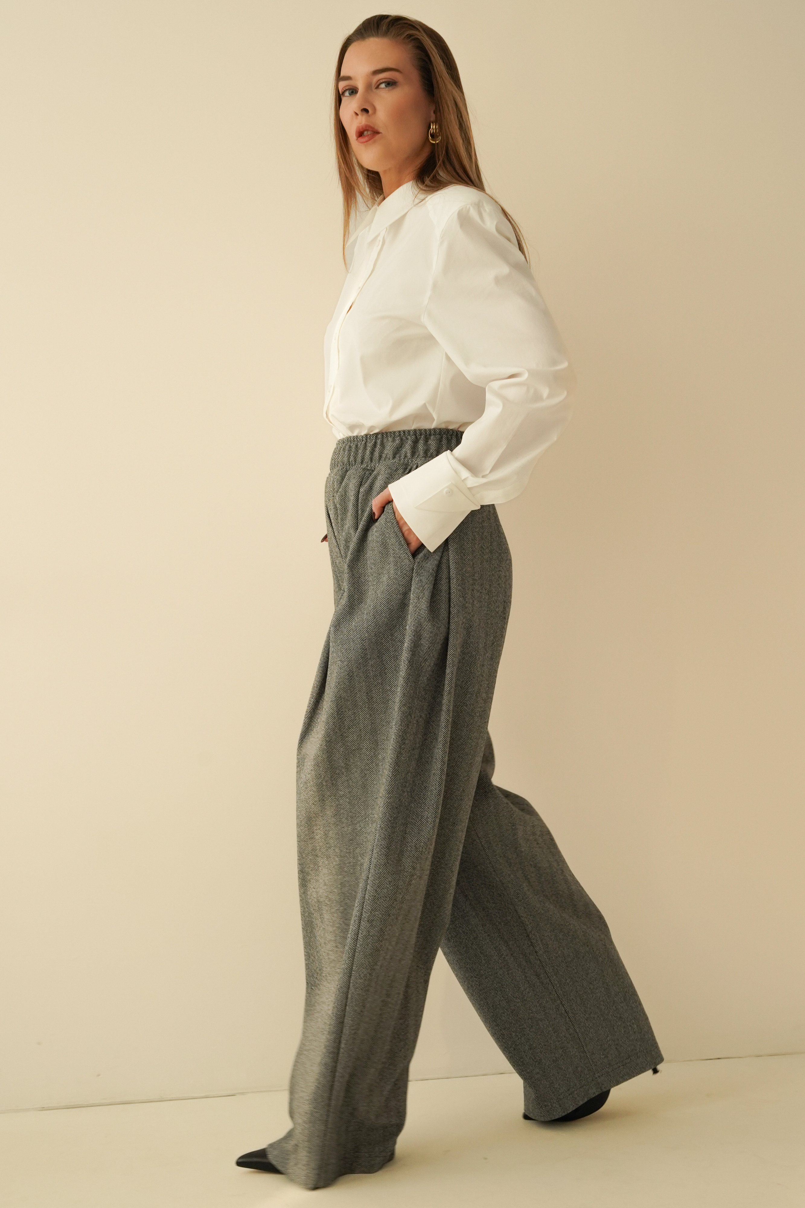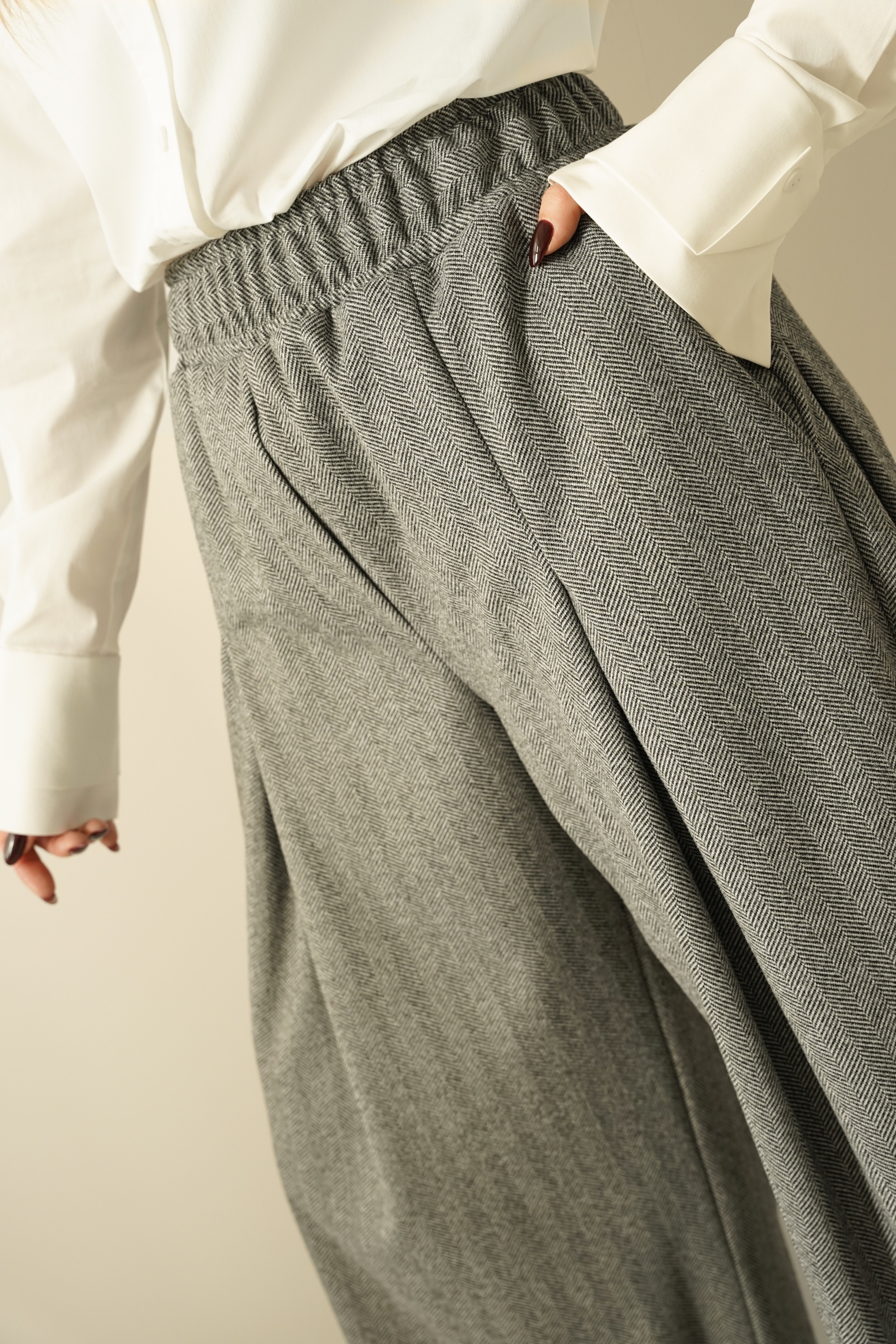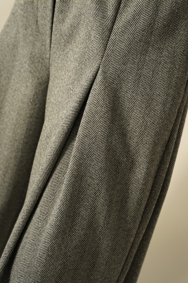 ‘Heritage Ease’ are loose, wide trousers with pleats at the front and on the hips, which give the silhouette a modern, slightly architectural shape. A comfortable elasticated waistband, practical pockets and soft fabric make them extremely comfortable to wear, while the subtle herringbone pattern adds an elegant, timeless character.