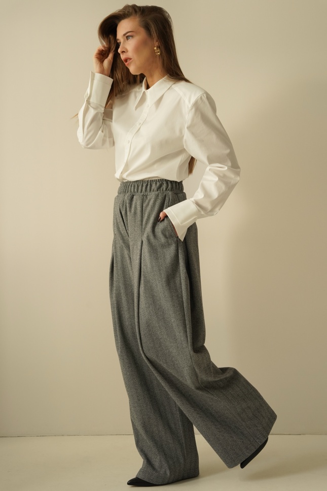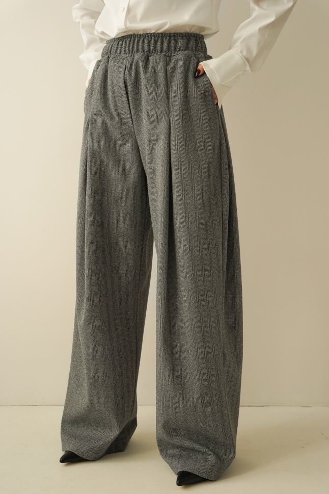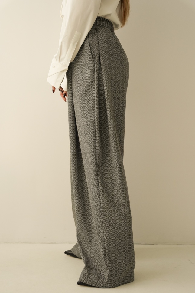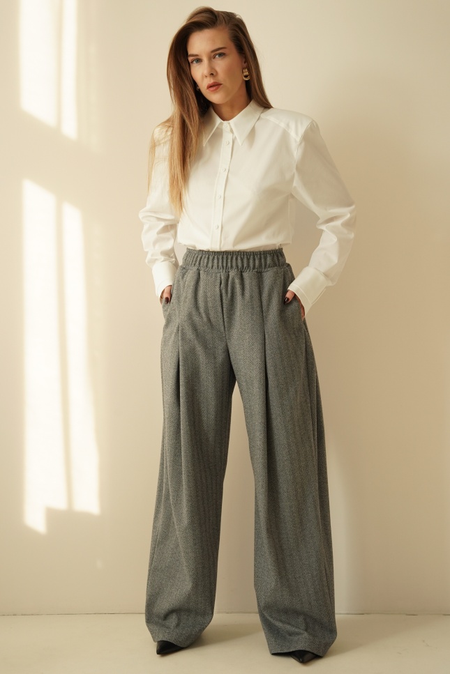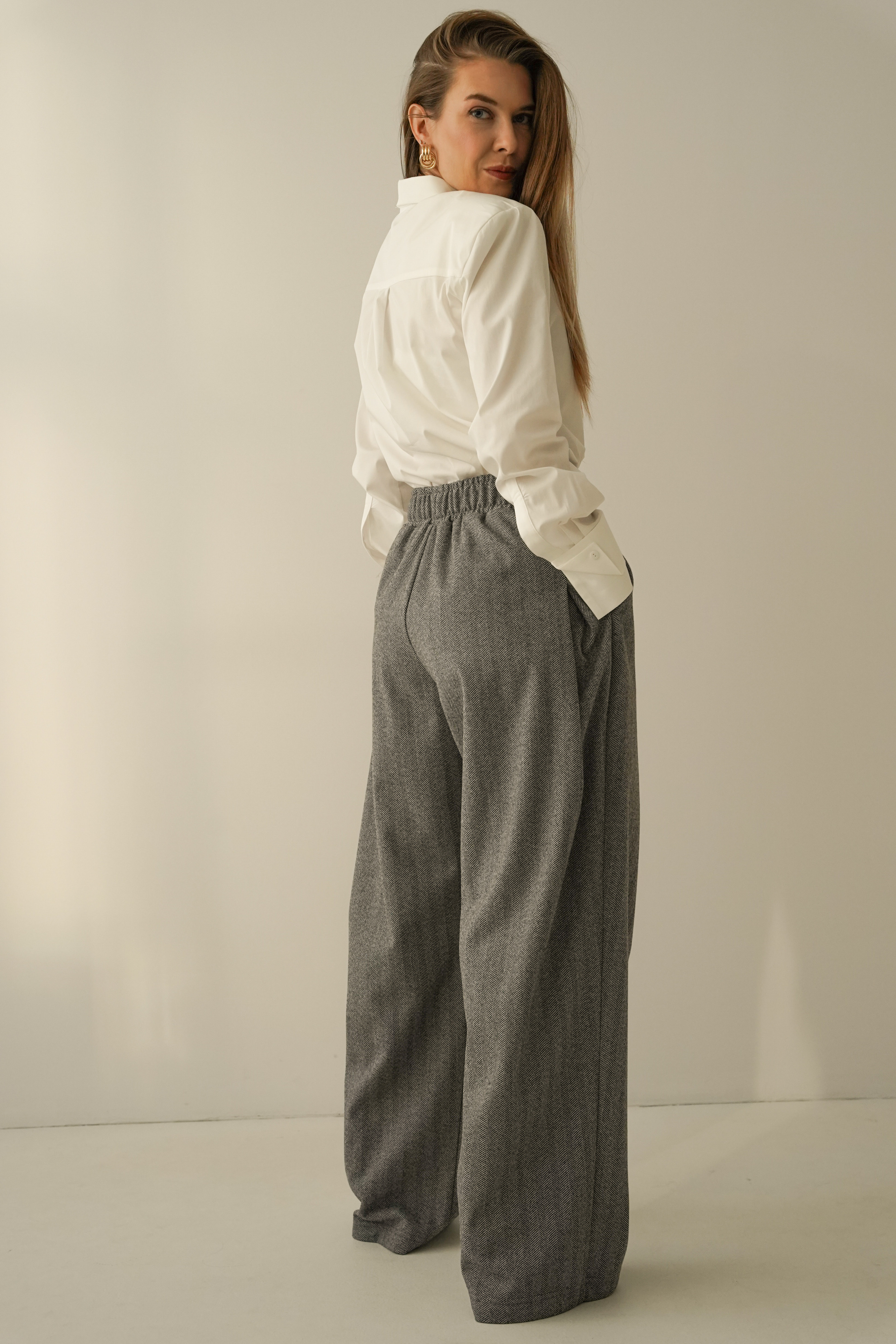 ‘Heritage Ease’ are loose, wide trousers with pleats at the front and on the hips, which give the silhouette a modern, slightly architectural shape. A comfortable elasticated waistband, practical pockets and soft fabric make them extremely comfortable to wear, while the subtle herringbone pattern adds an elegant, timeless character.