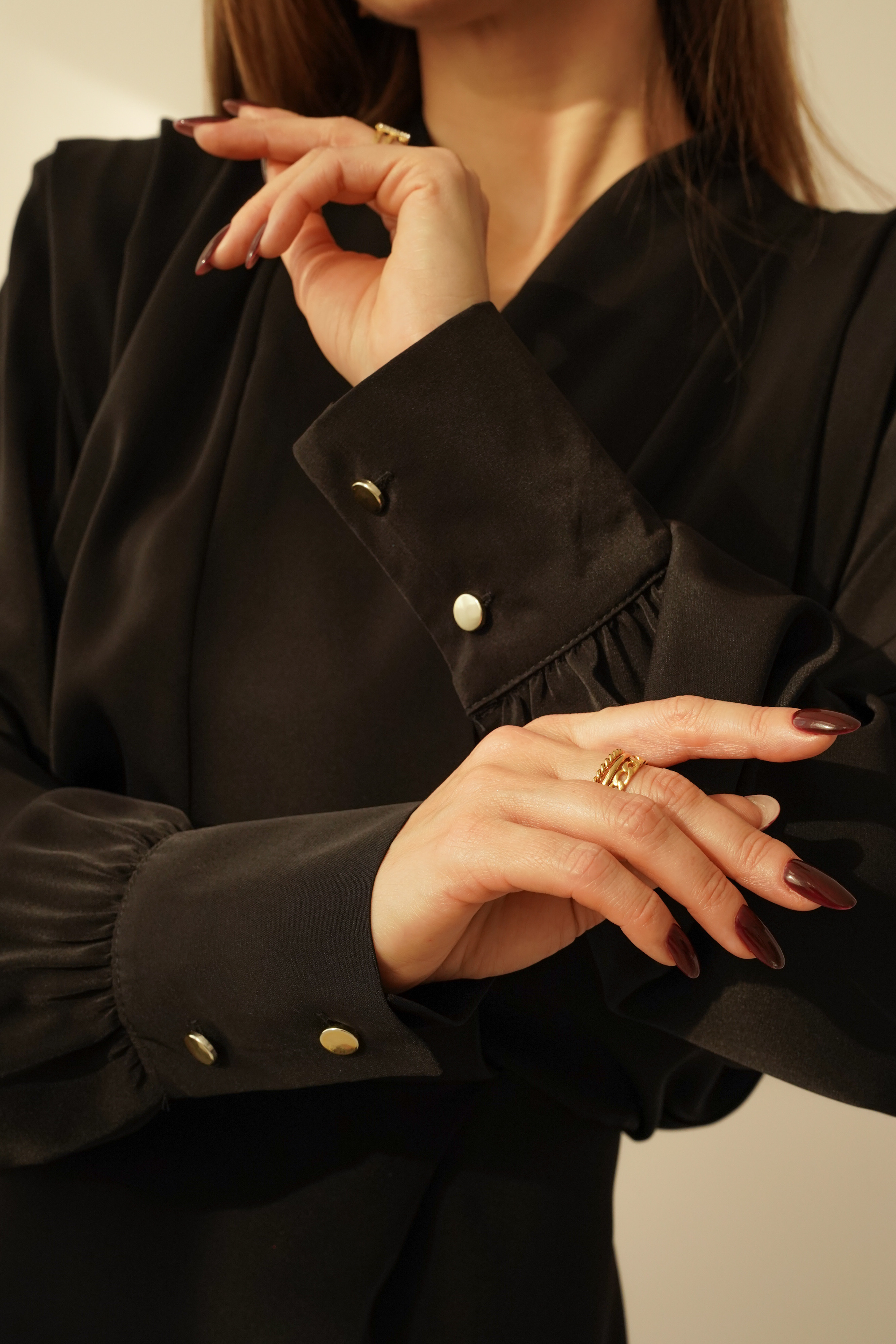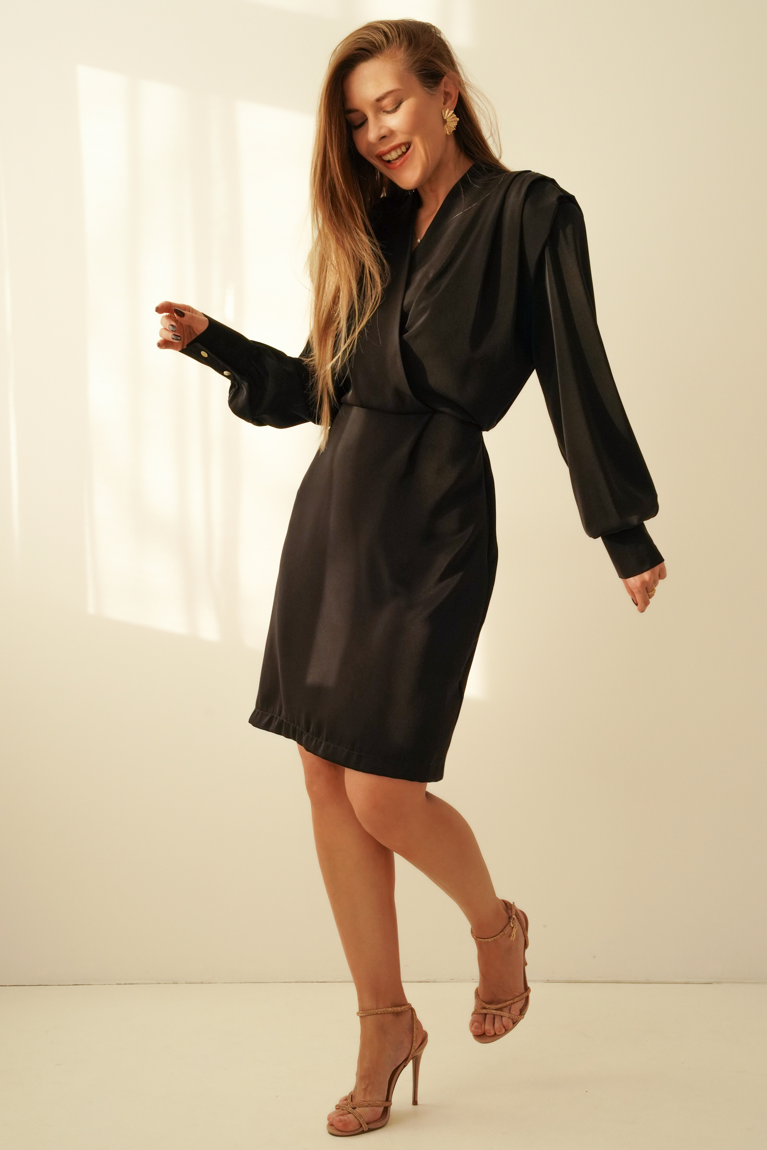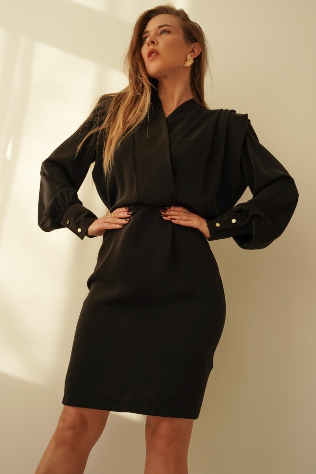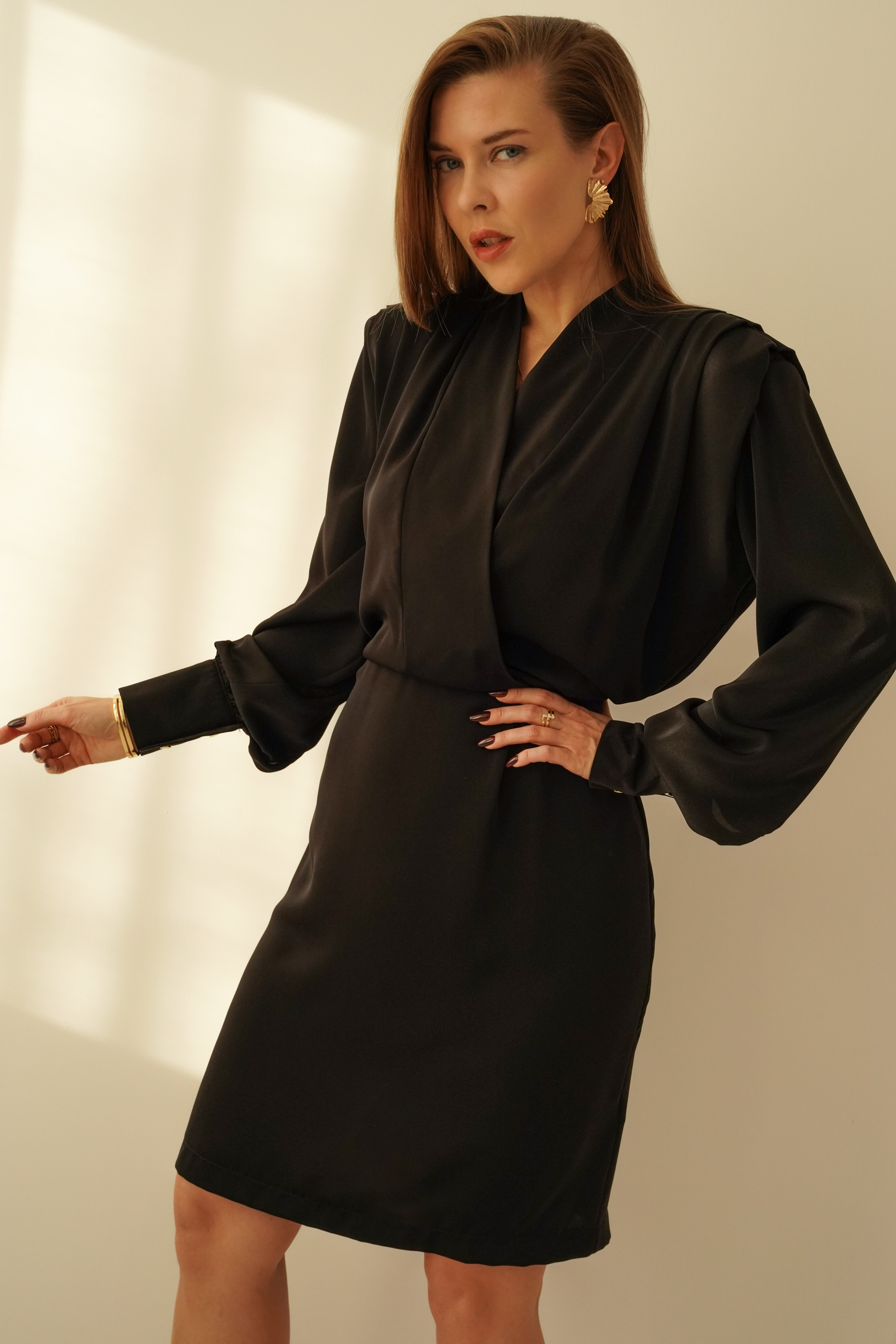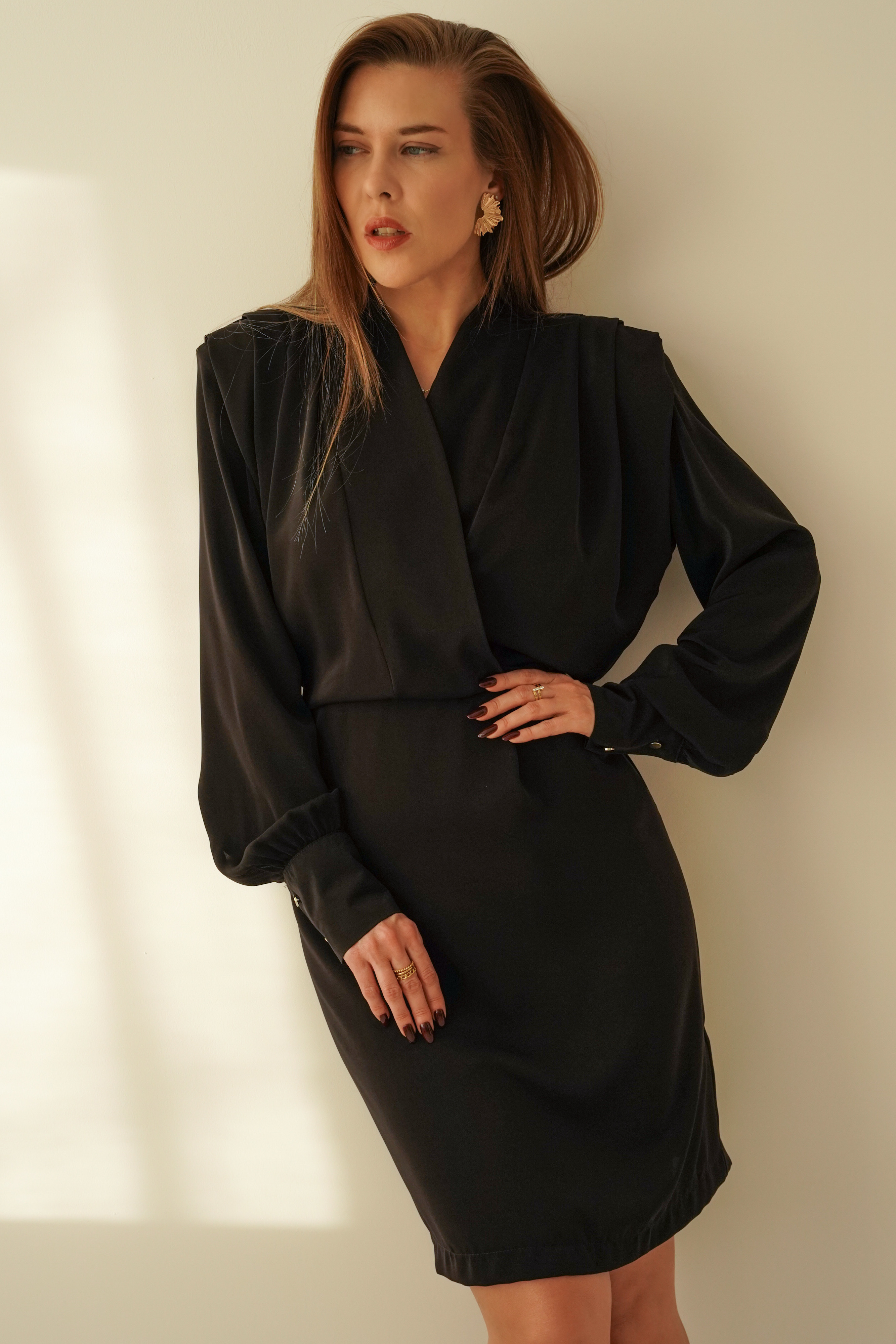 The Éloise dress is the essence of Parisian elegance — minimalist, with a wrap neckline, reinforced shoulder line and cuffs that add a sophisticated structure. Modern, feminine, perfect for any occasion when you want to look chic and classy.
