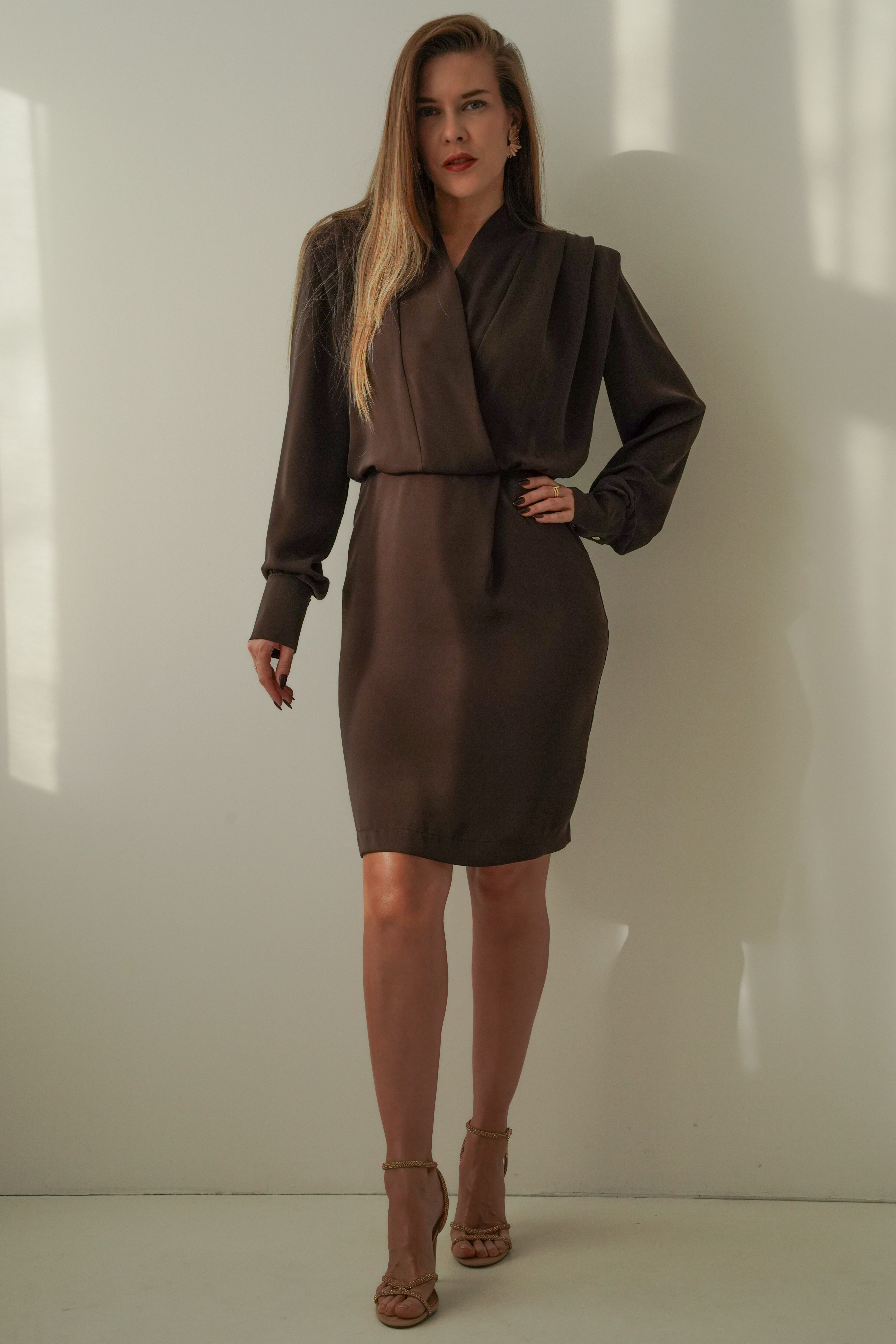 The Éloise dress is the essence of Parisian elegance — minimalist, with a wrap neckline, reinforced shoulder line and cuffs that add a sophisticated structure. Modern, feminine, perfect for any occasion when you want to look chic and classy.