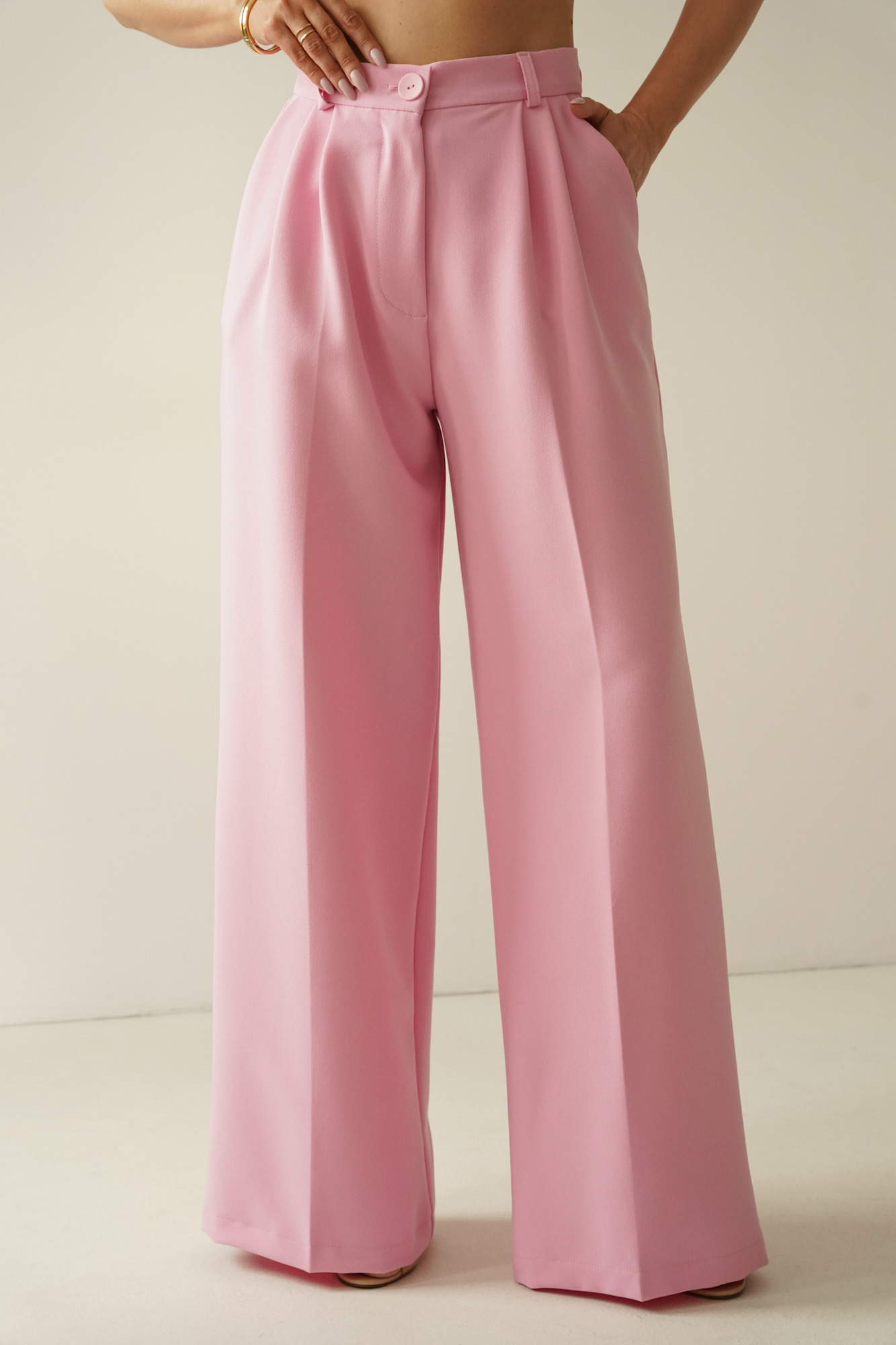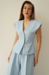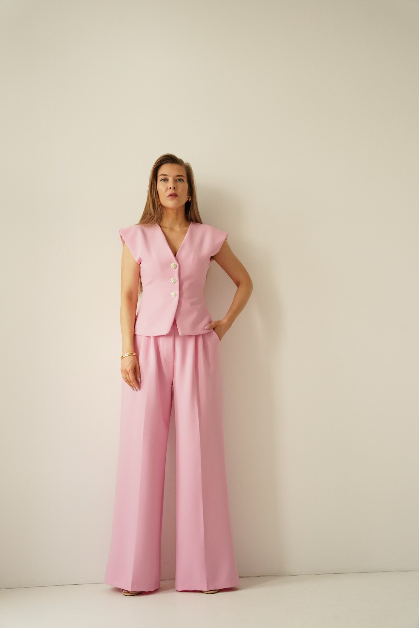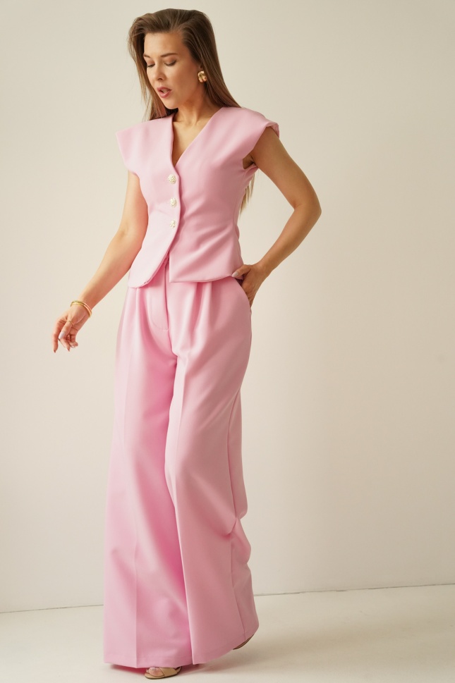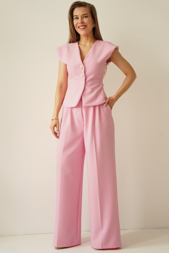 AUDREY is an elegant, timeless set consisting of a strongly fitted waistcoat fastened with decorative buttons and wide, high-waisted palazzo trousers.
