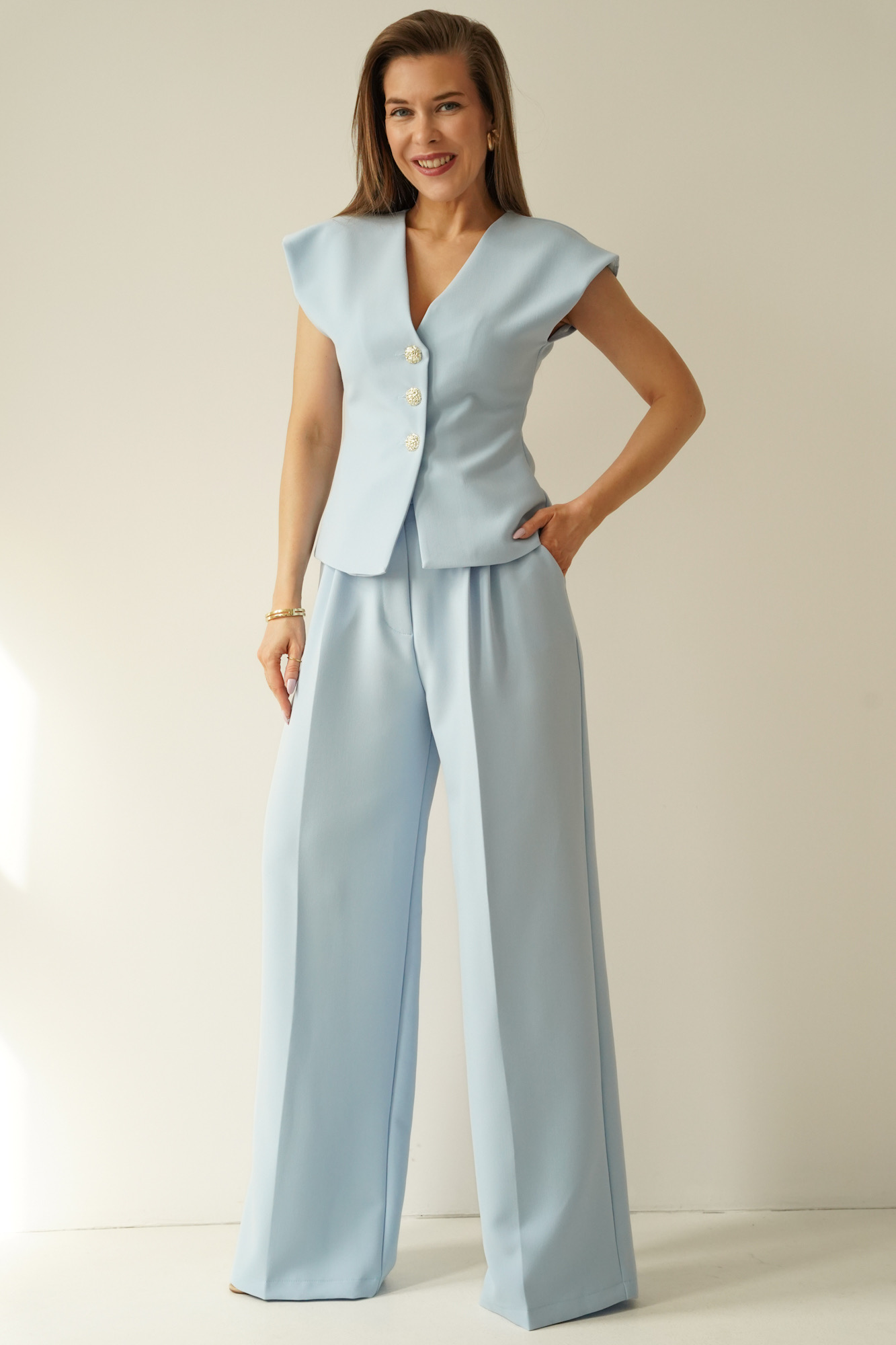 AUDREY is an elegant, timeless set consisting of a strongly fitted waistcoat fastened with decorative buttons and wide, high-waisted palazzo trousers.