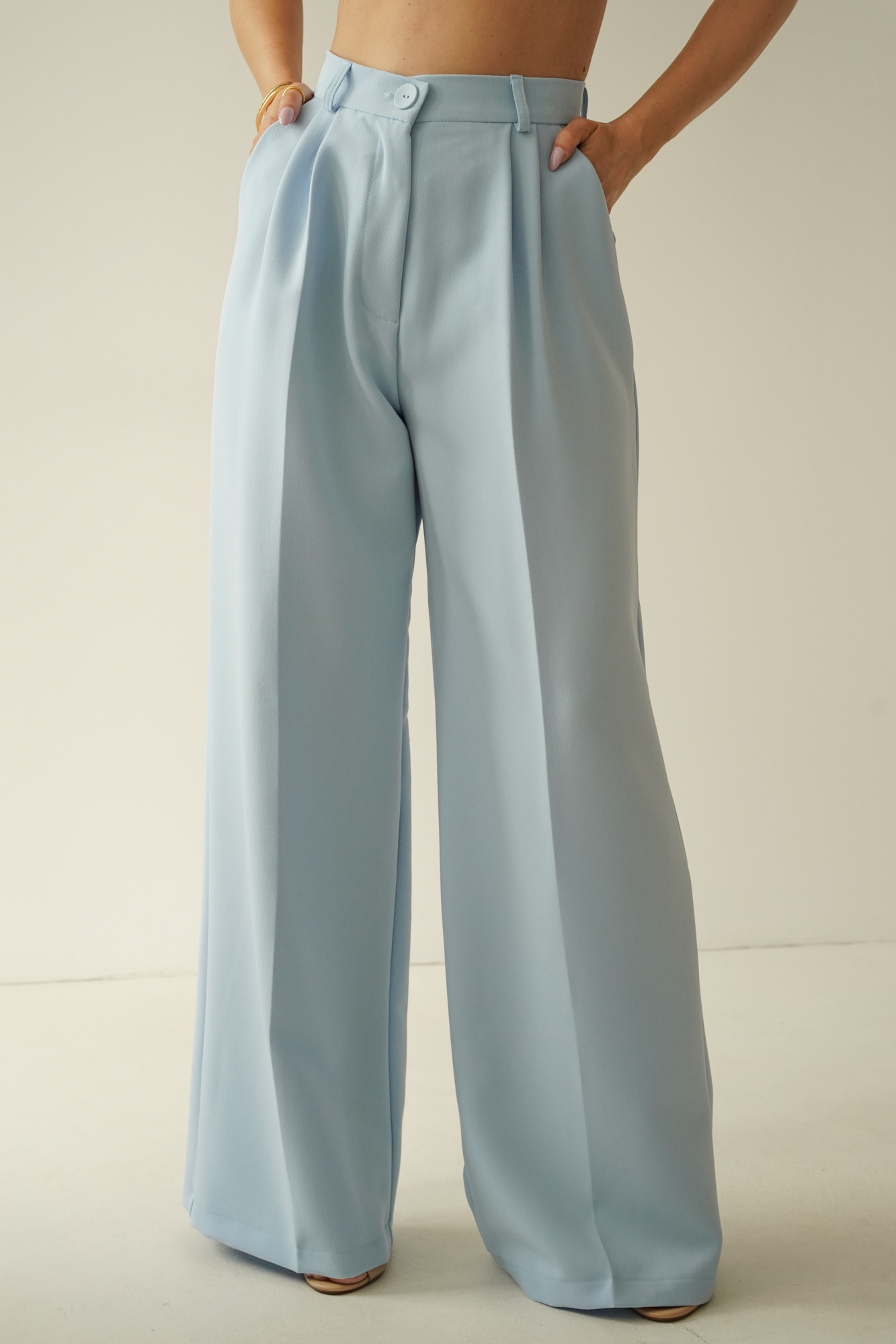 • elegant palazzo-style creased trousers,