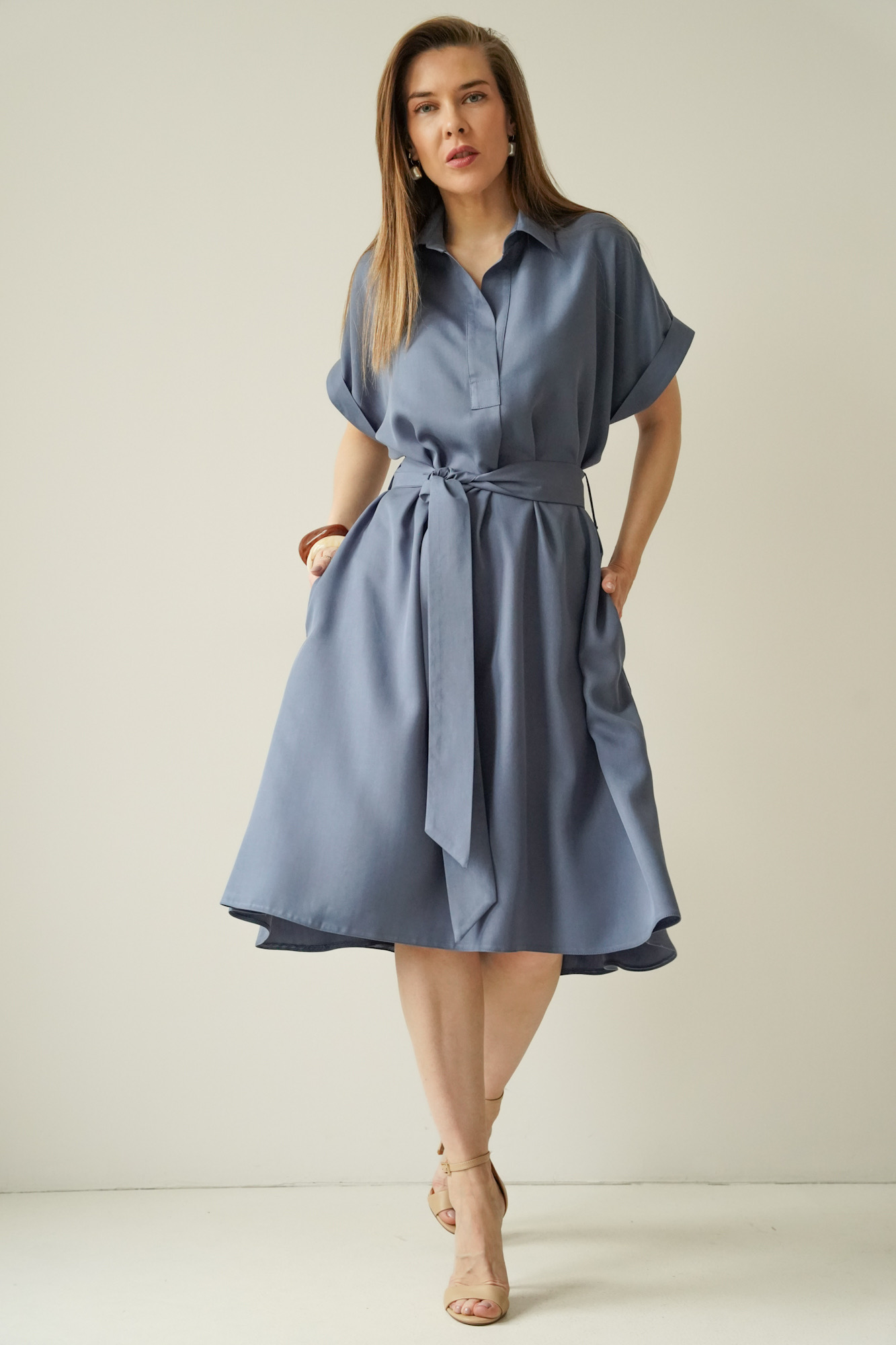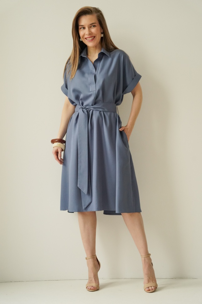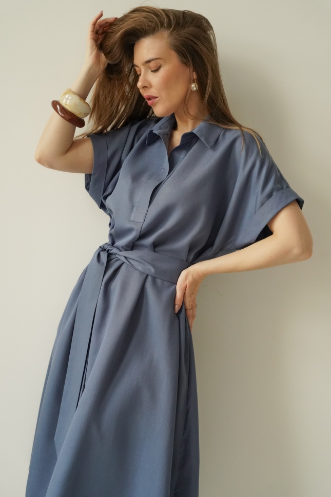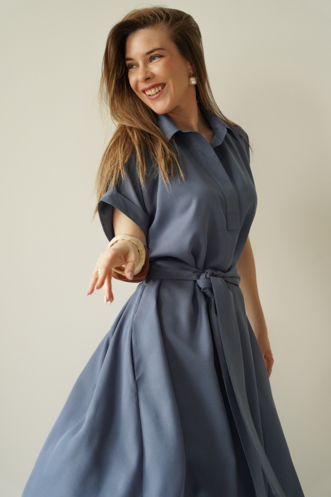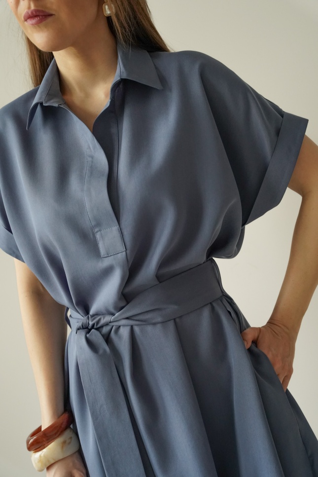 The waist, accentuated by a belt, allows the dress to fit the figure perfectly, whilst the carefully selected 100% lyocell fabric is soft, breathable and comfortable to wear.