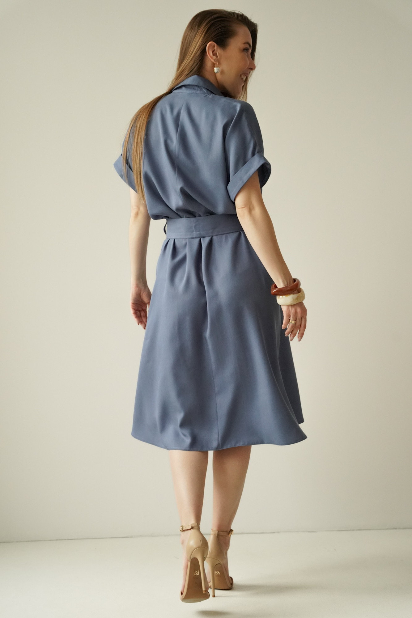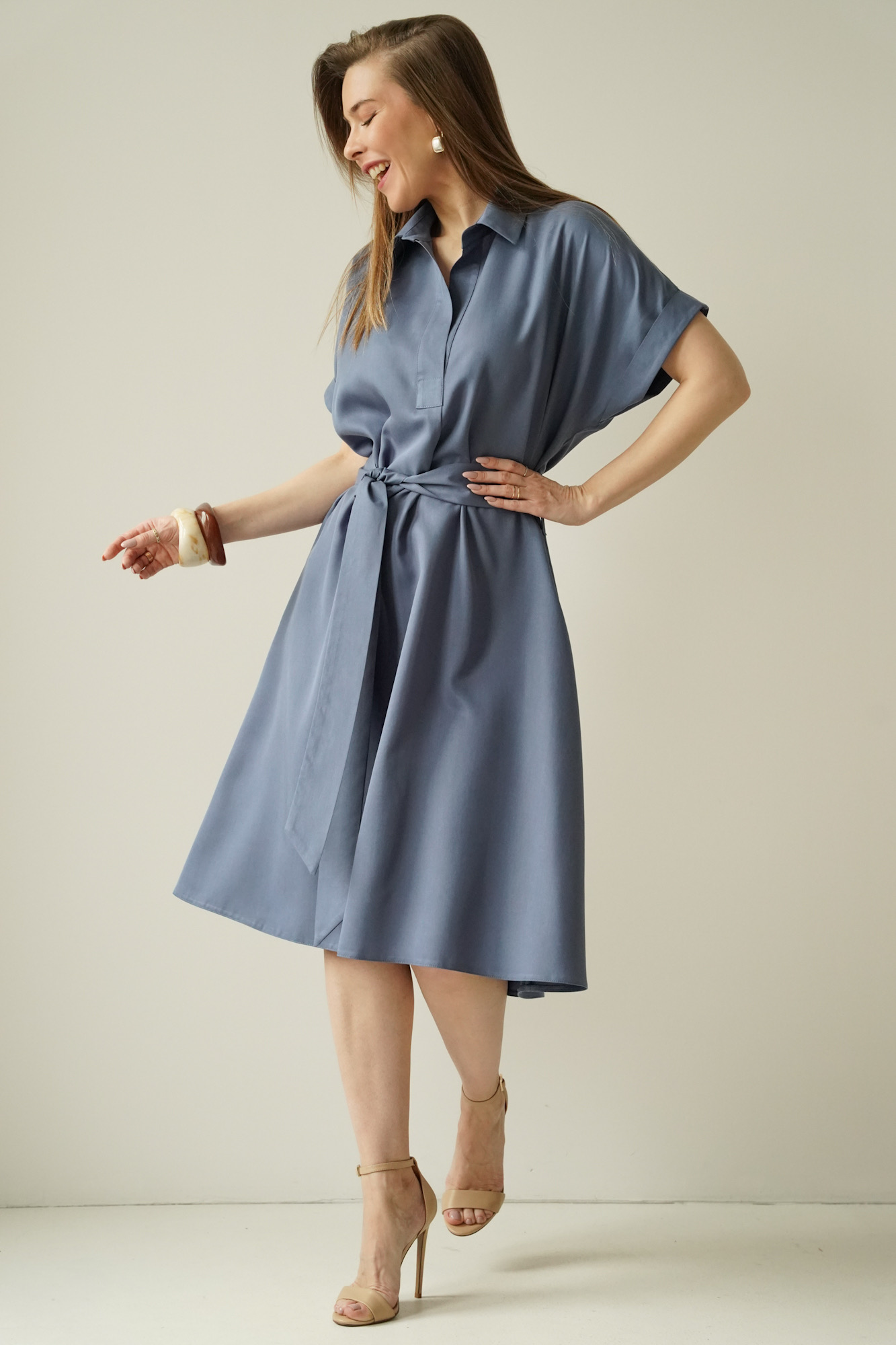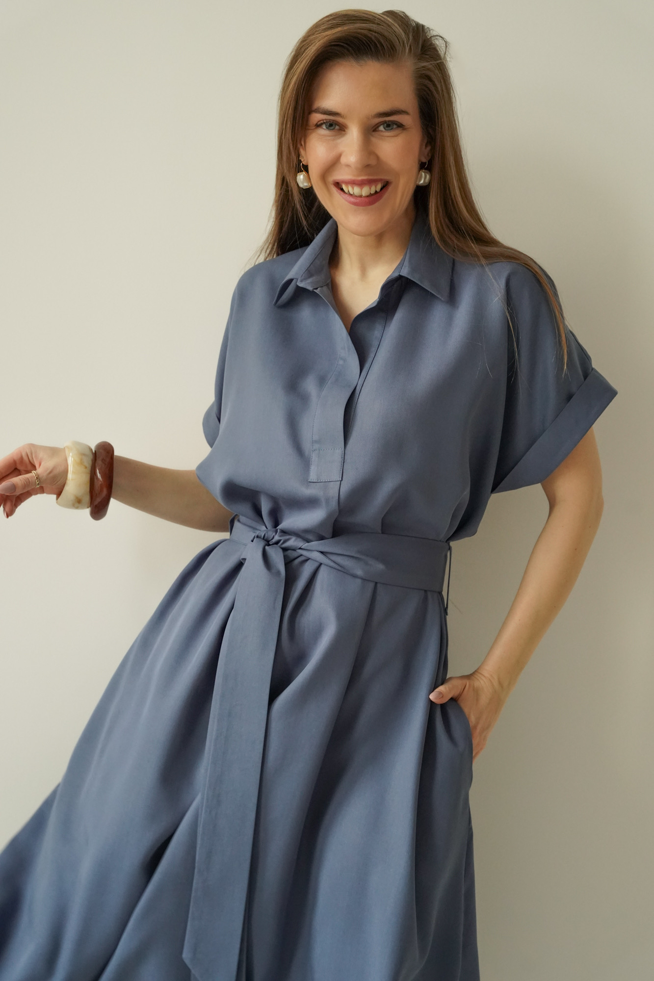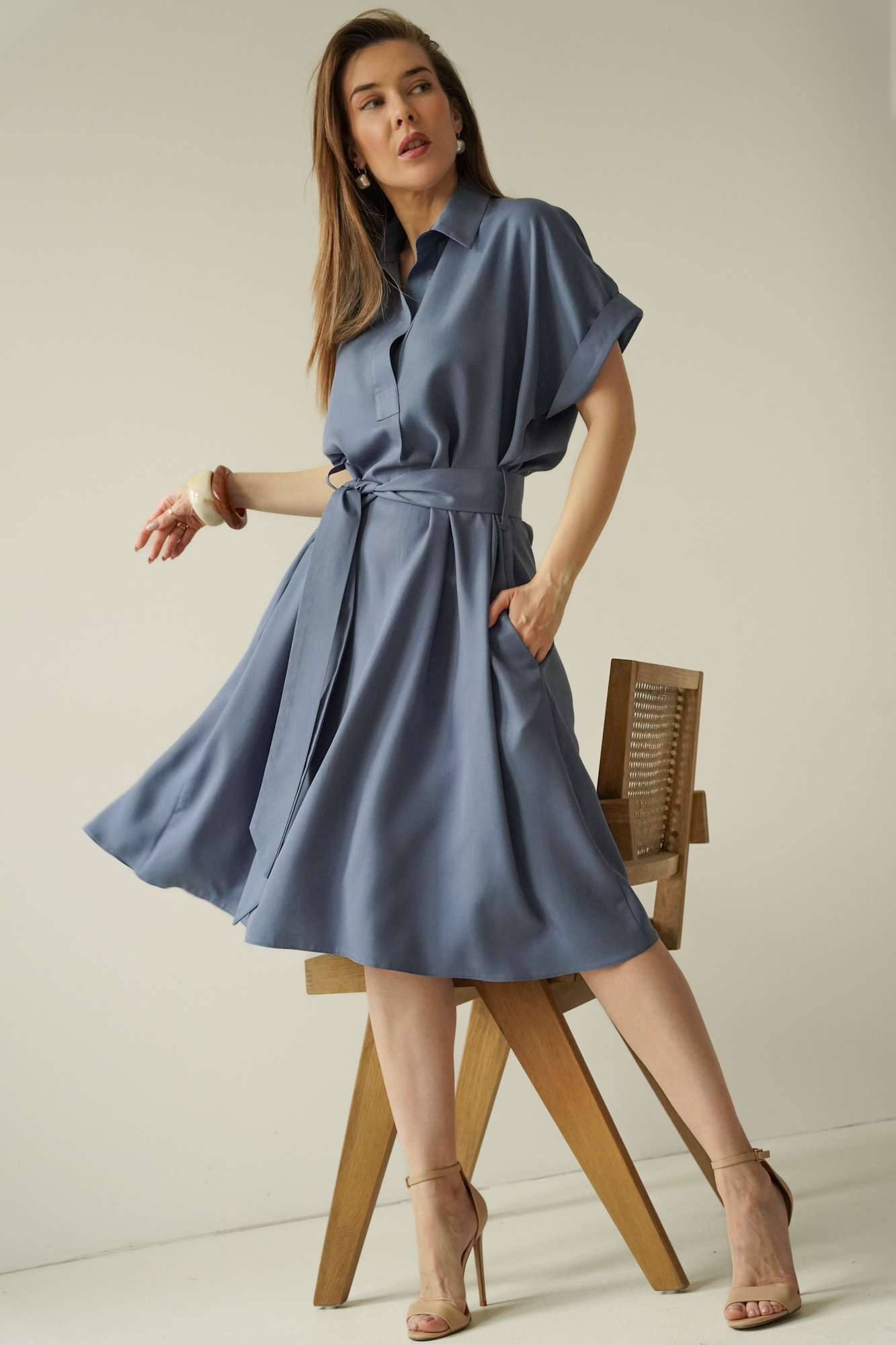 The waist, accentuated by a belt, allows the dress to fit the figure perfectly, whilst the carefully selected 100% lyocell fabric is soft, breathable and comfortable to wear.