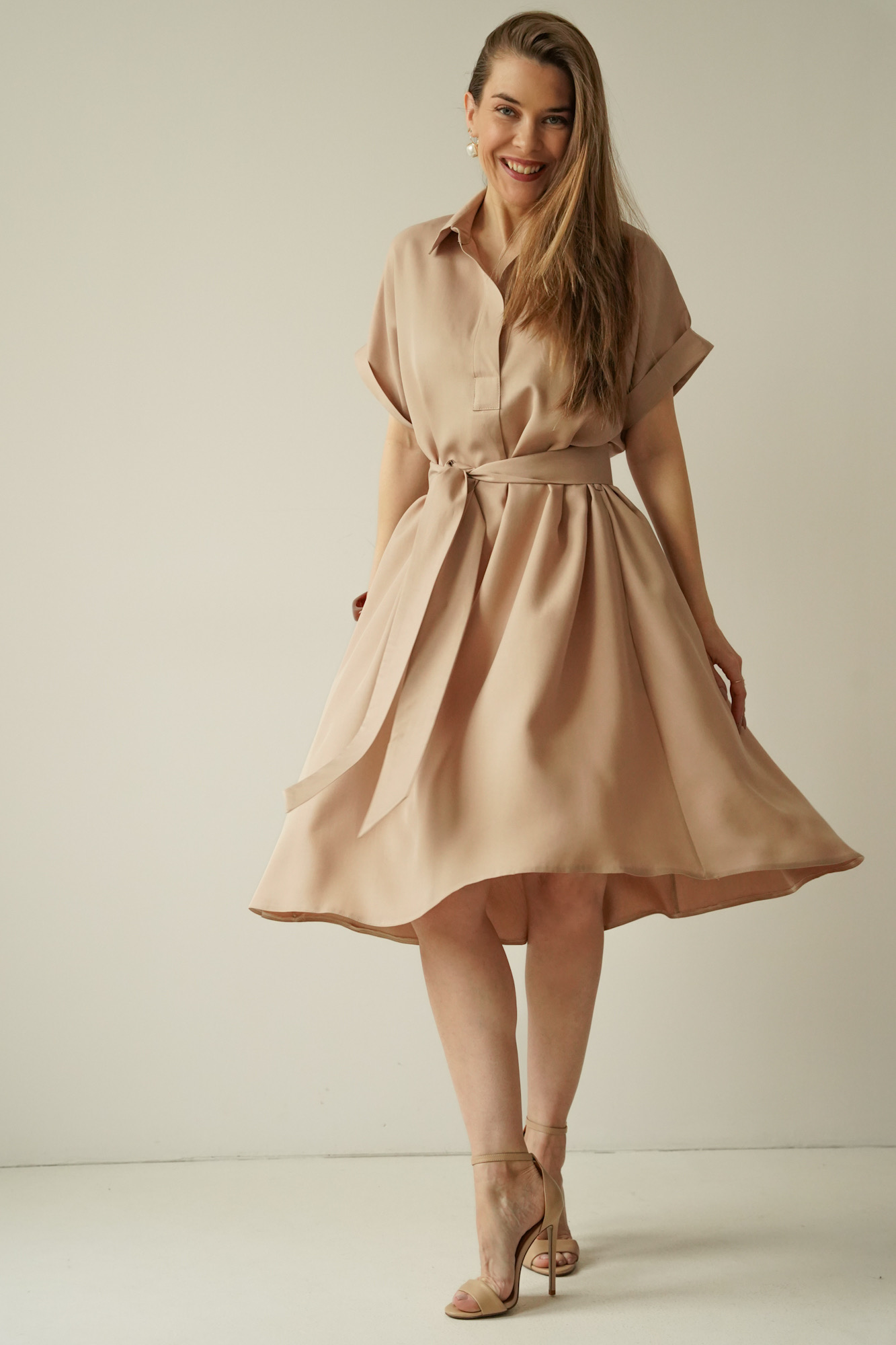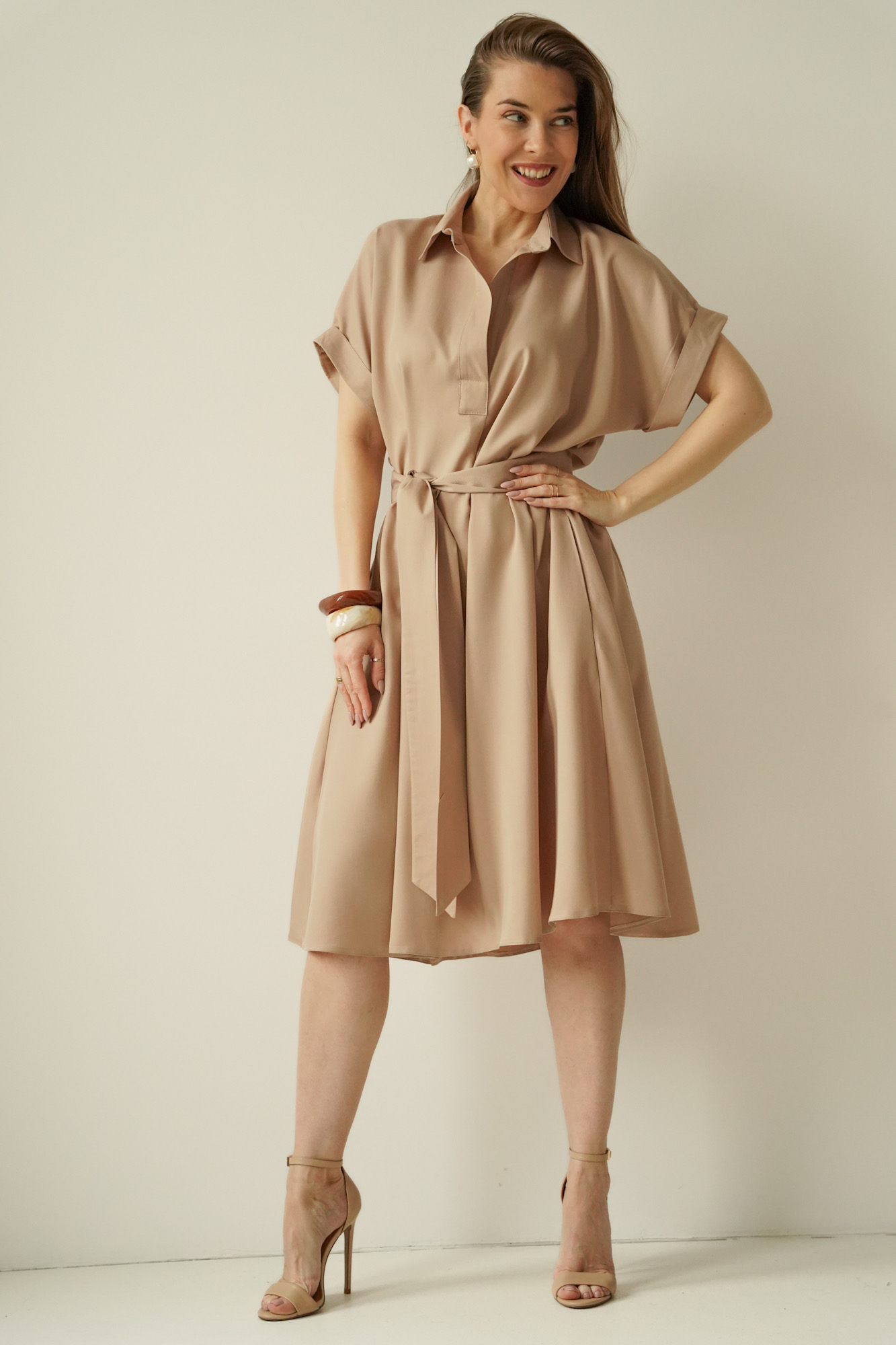 ELYN is a feminine dress inspired by the classic polo style, which combines elegance with everyday comfort in a modern way. The design stands out thanks to its elegant collar, raglan sleeves finished with cuffs, and a beautifully flared hem that lends the silhouette a sense of lightness and femininity.