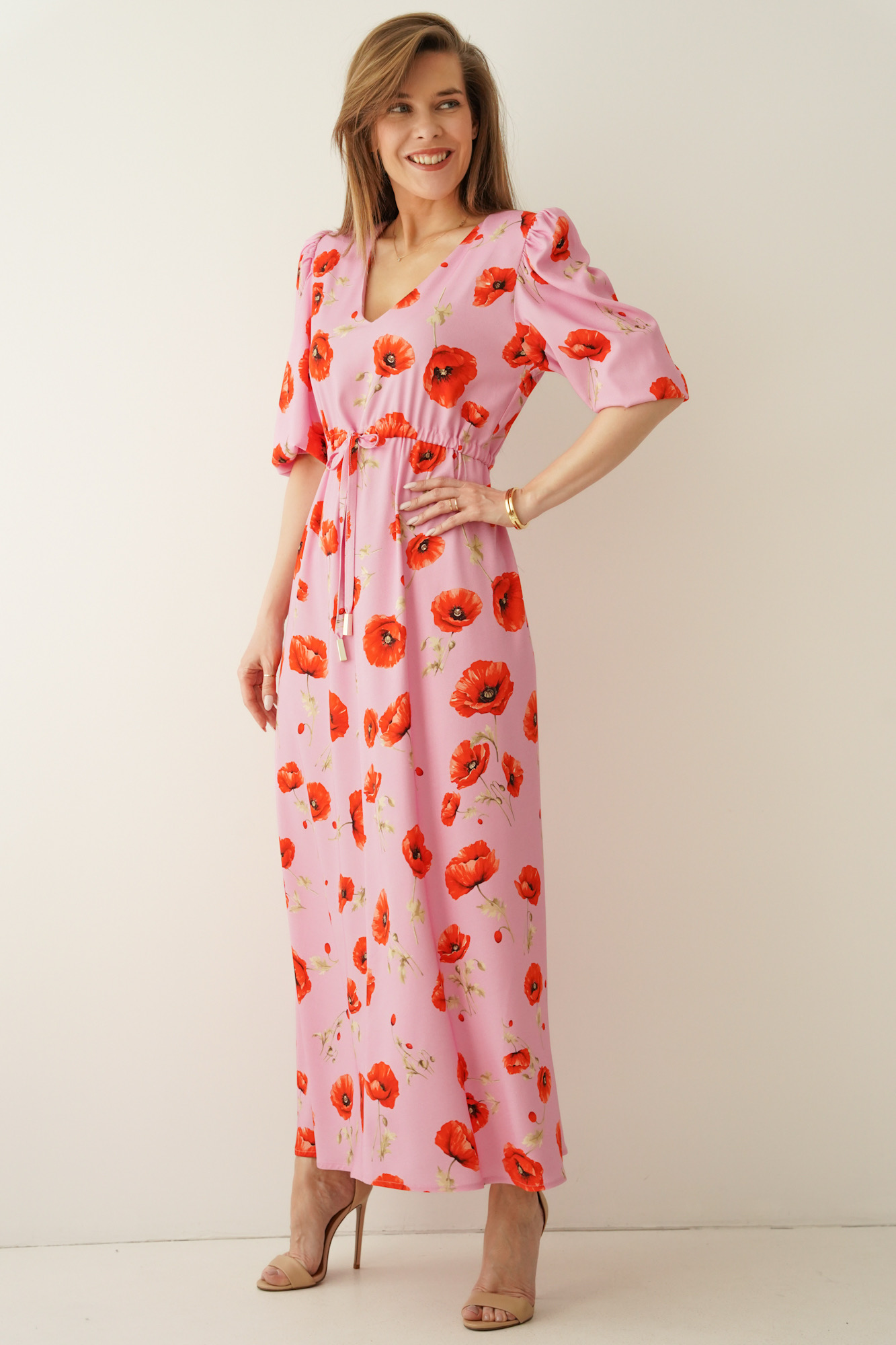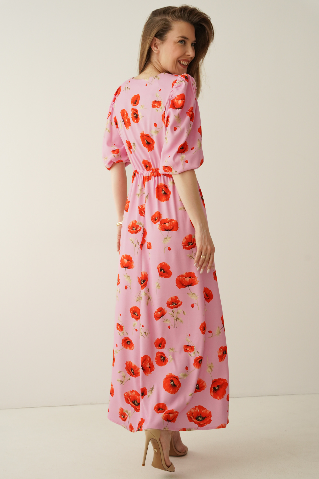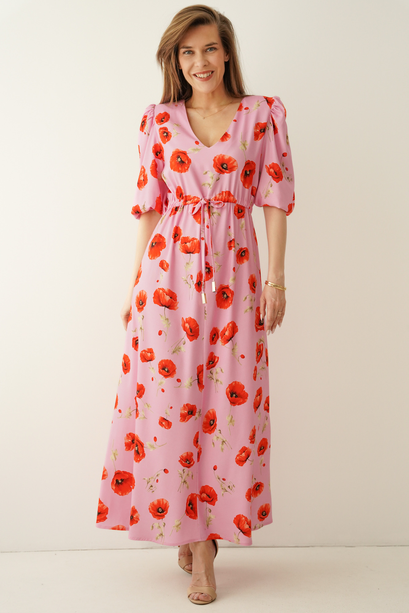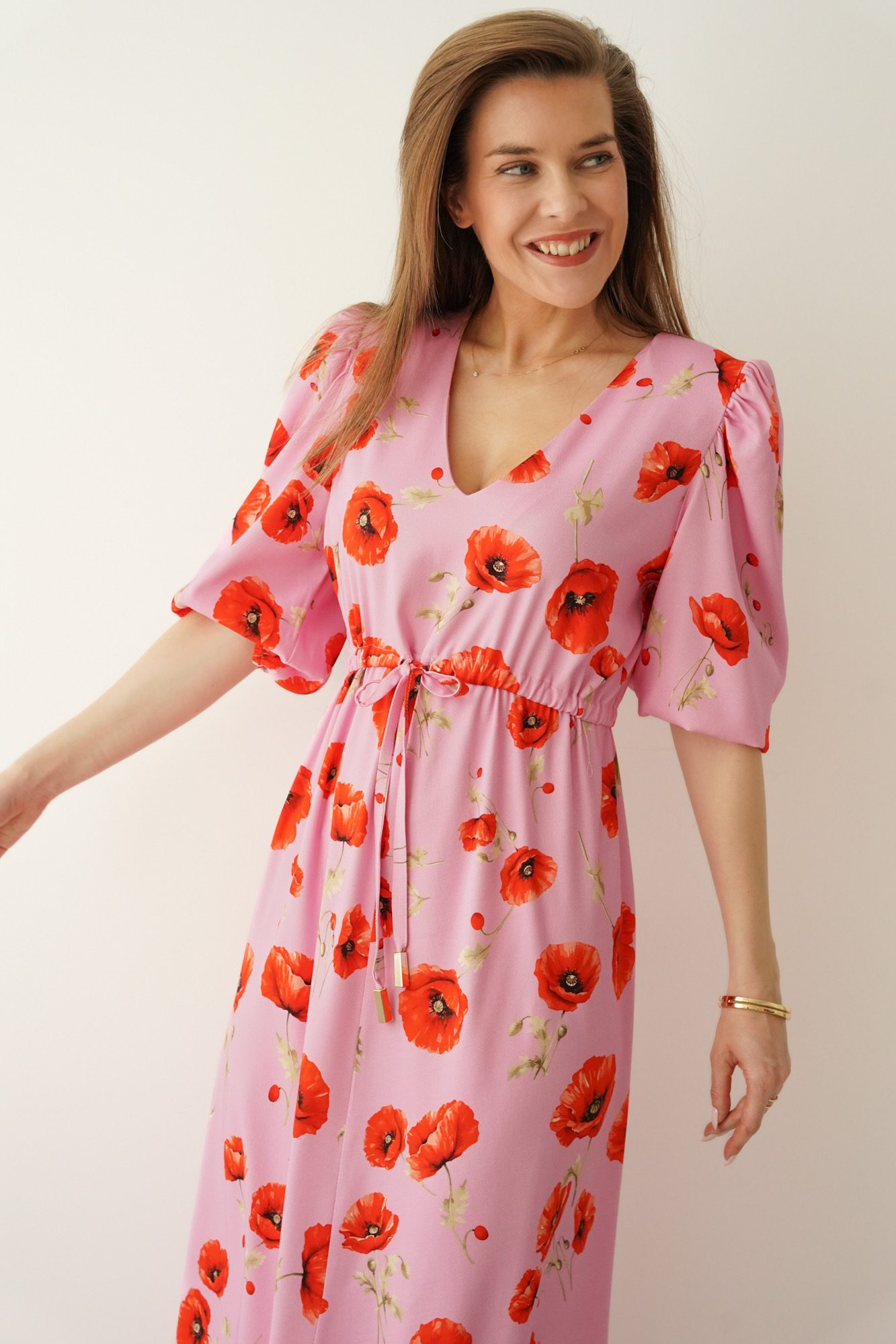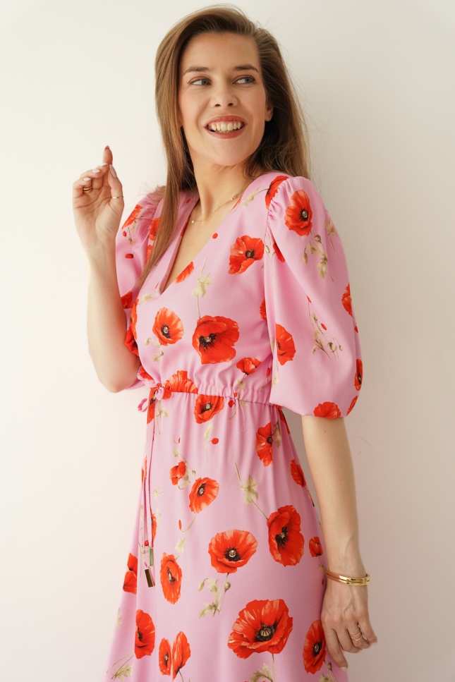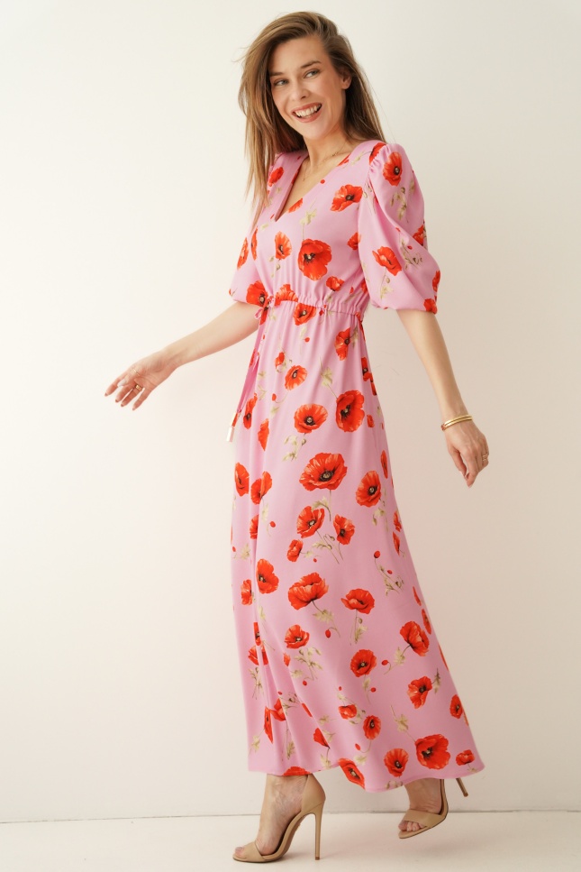 Feminine floral-print dress with puff sleeves Florence poppy
