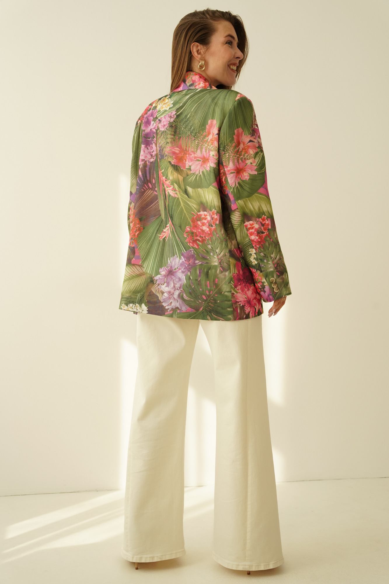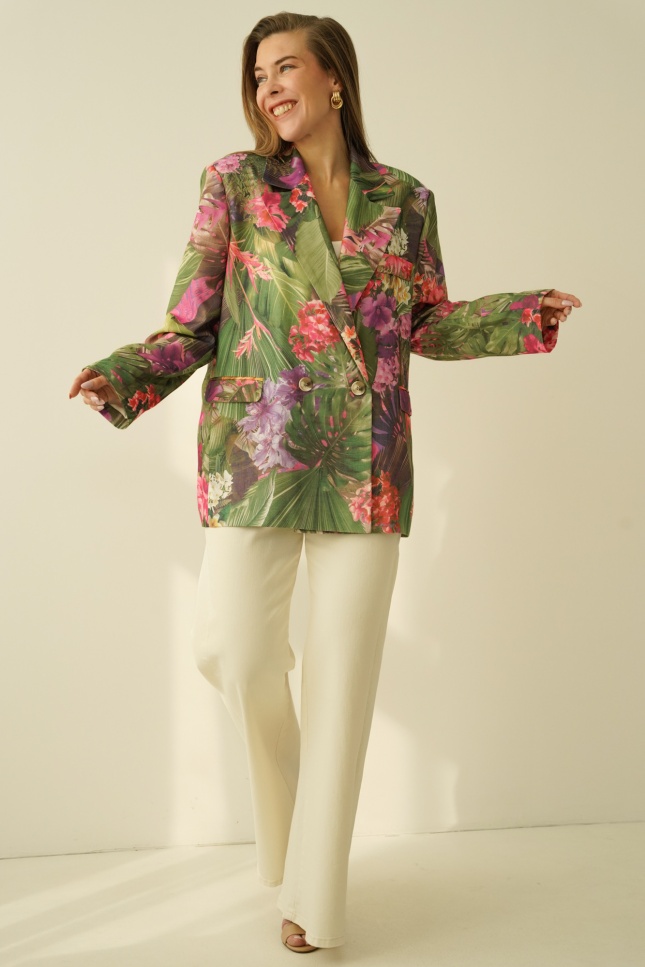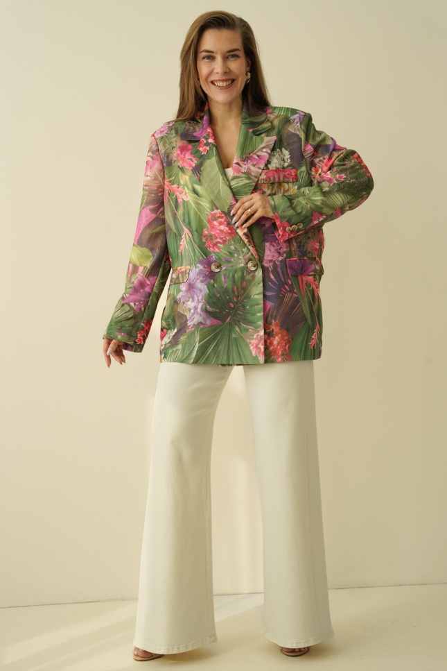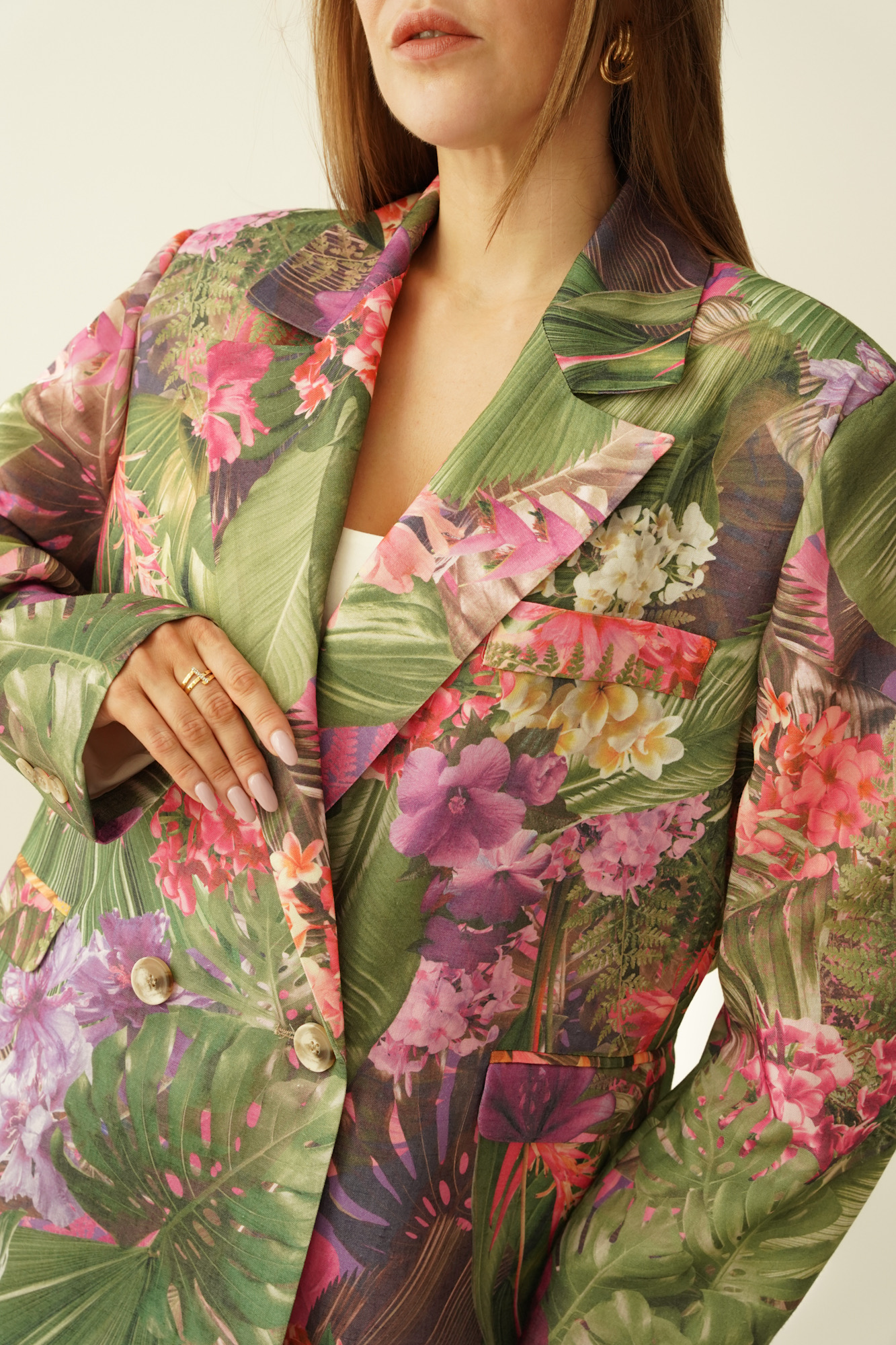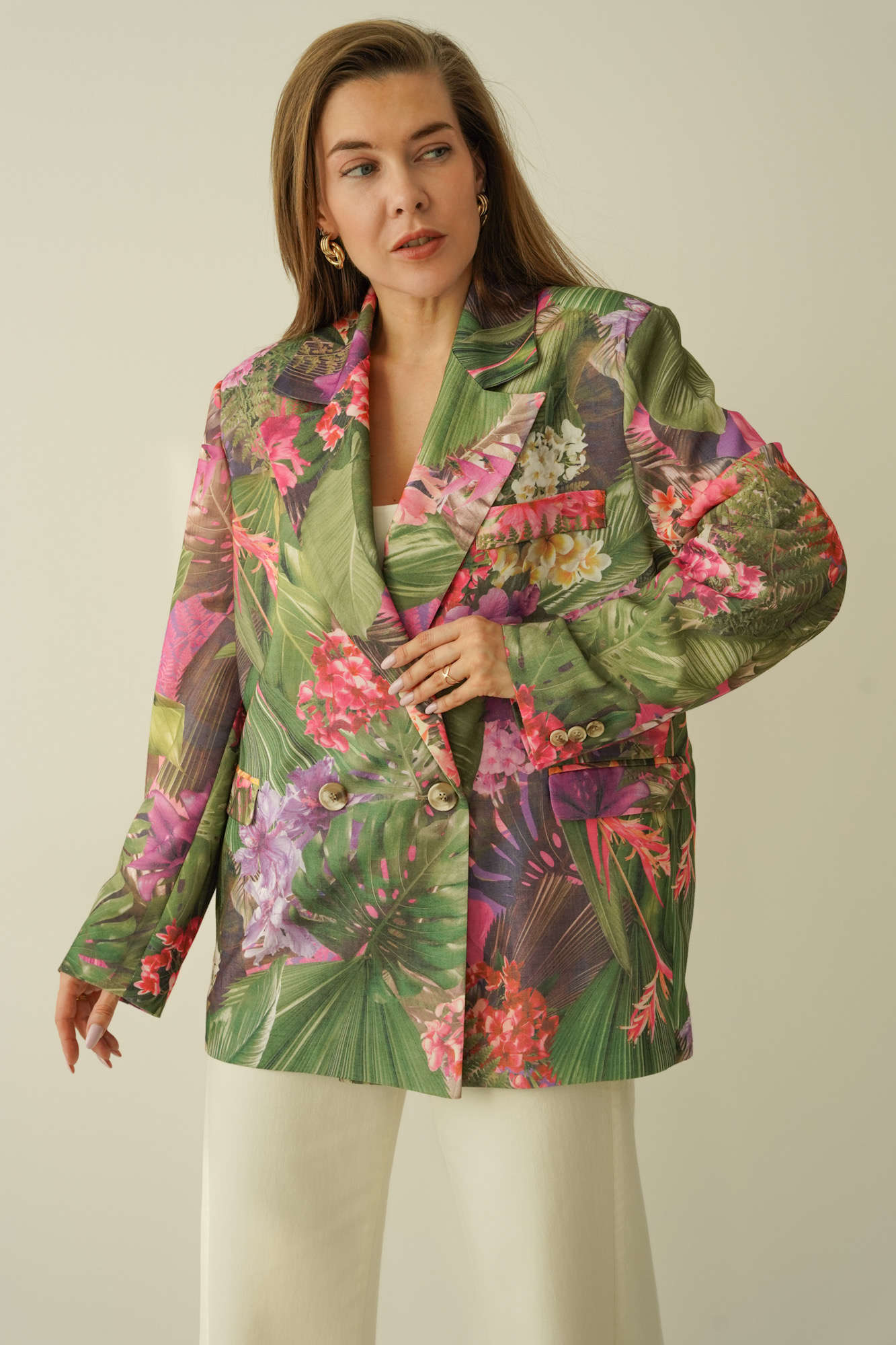 Discover the atmosphere of tropical elegance with our unique linen jacket. This double-breasted blazer surprises with an original tropical pattern maintained in juicy colors that attract the eye and exude positive energy. Made of airy, high-quality linen, it guarantees comfort even on warm days. Inside there is a delicate lining made of natural viscose, ensuring comfortable wear and breathability. Perfect for special occasions and stylish summer evenings.